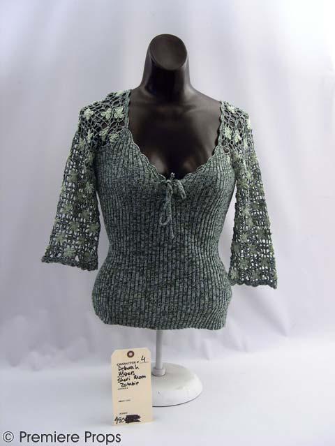 The face behind the mask. This is an original screen worn blouse worn in scene 49C by Deborah Myers (Sheri Moon Zombie) during the filming of HALLOWEEN. Items include: A blue & green knitted blouse with open weave floral sleeves & a tie at the center. It is a 3/4 sleeve top. Size Medium. Also included is the original wardrobe department tag.