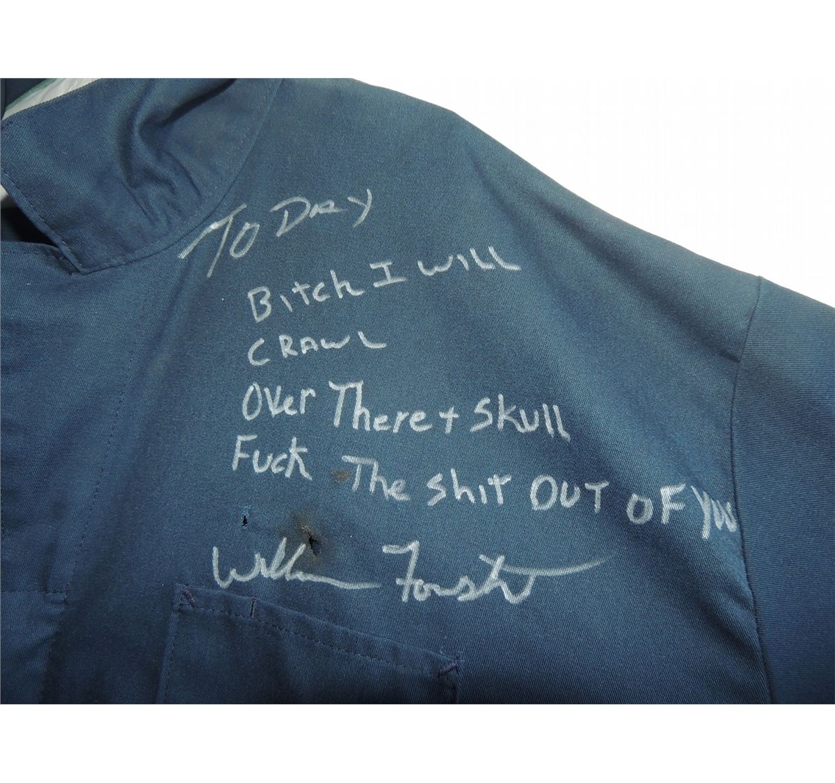 These are made from scratch with no labels, but are marked in ways shown. They do have a few bullet hits, and were worn by Tyler mane, but I am assuming only in far off shots in the dark.