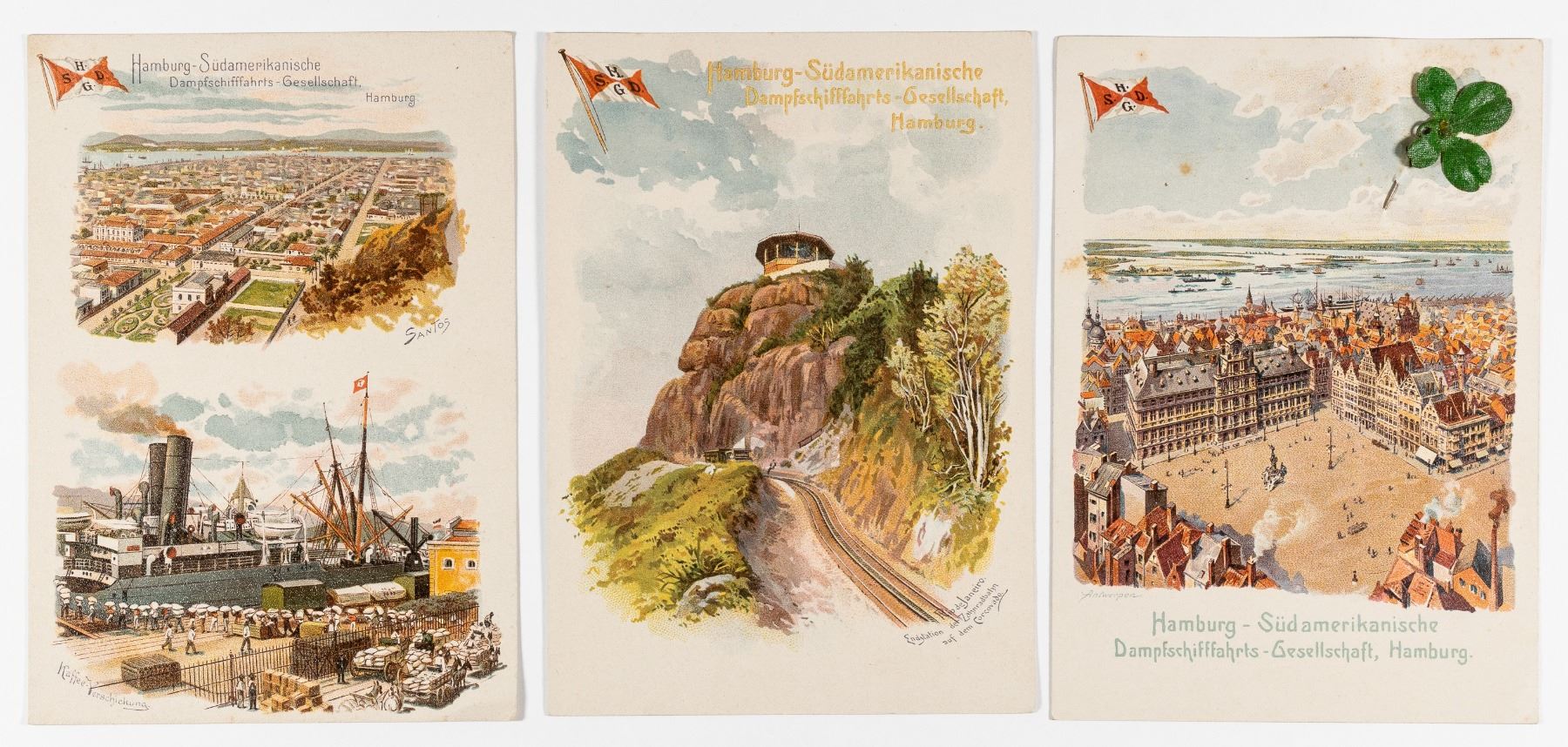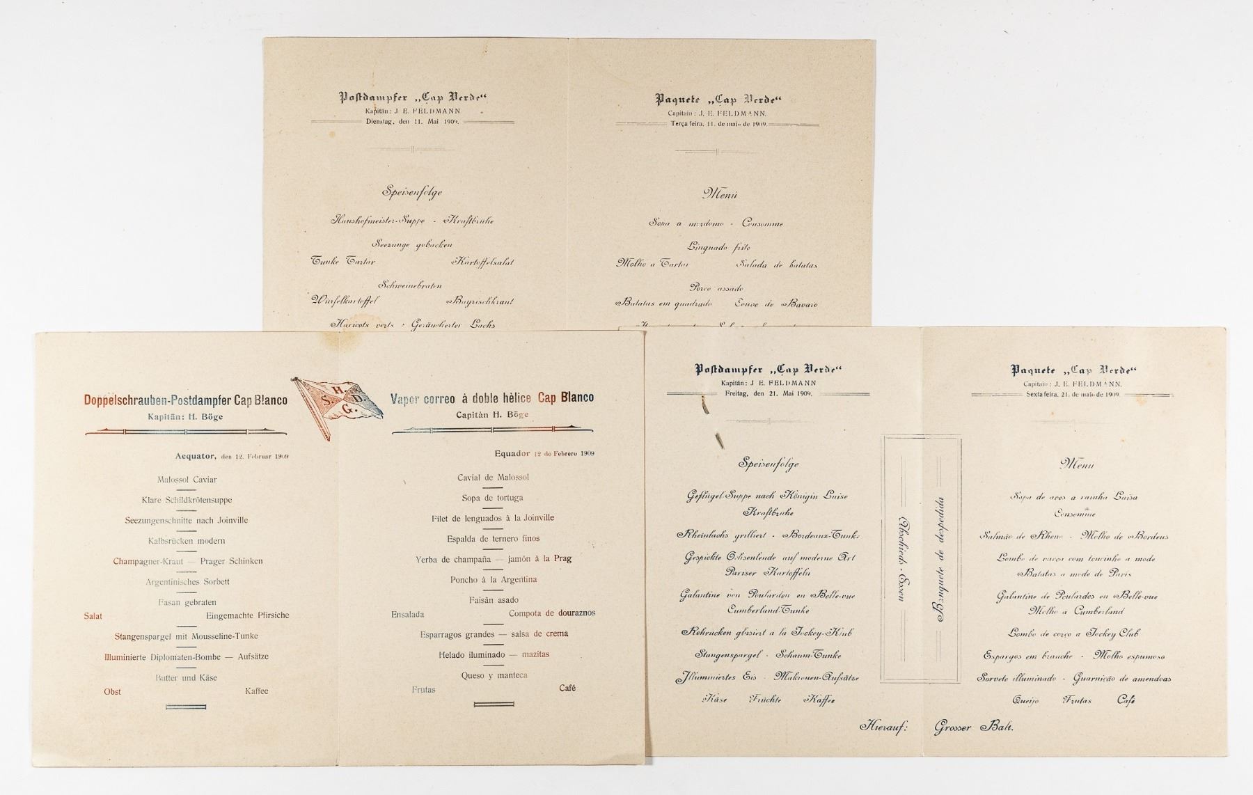 Three menus from the Hamburg Sudamerikanische Dampfschifffahrts-Gesellschaft 'Hamburg–South America Steam Shipping Company' (HSDG). Two menus from the steamer 'Cap Verde' and one from the ship 'Cap Blanco.' Each menu is written in German and Portuguese and dated from 1909. HSDG is a transport company founded in 1871 providing shipping services to Brazil and Argentina. Four pages each, 7.5 x 5.25 inches.