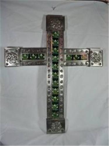 HAMMERED TIN CROSS BORDERING HANDPAINTED TILES IN A FLORAL MOTIF. 30"X25".