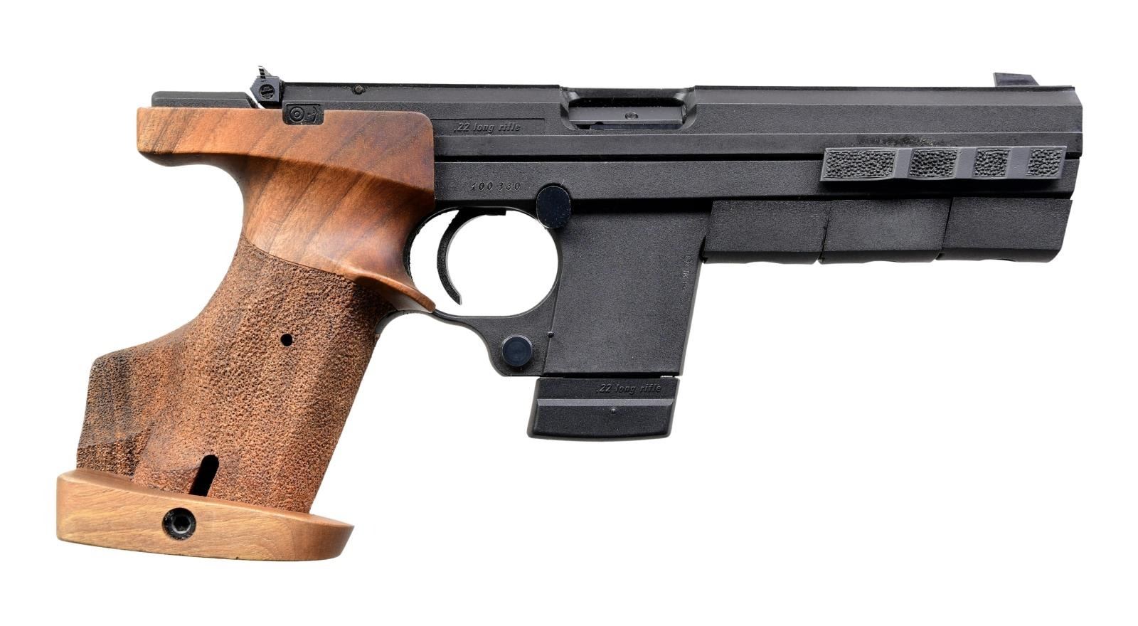 Cal. 22 LR & 32 S&W LWC. S# 100380. Bbl. 4 3/4". Blade front sight. Adjustable rear sight. Swiss target pistol mfg. 1990-93. Left side of slide has WH Anderson import marking. Matte black finish. Hardwood target grip. MAGS: 2-6 rd. 32 S&W & 2-6 rd. 22 LR. Total of 4. UNATTACHED ACCESSORIES: hardcase that's interior foam lining is deteriorating & key. Also included are the manual, two test targets, a 32 S&W LWC conversion unit, cleaning rod, tool kit, 3 bbl. weights & two scope rails. CONDITION: grip shows a couple light dings. Metal shows a couple minor handling marks retaining 99% original finish. Bright near excellent bore. (24-1701/MJC). MODERN. $1000-1500.