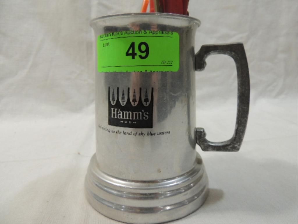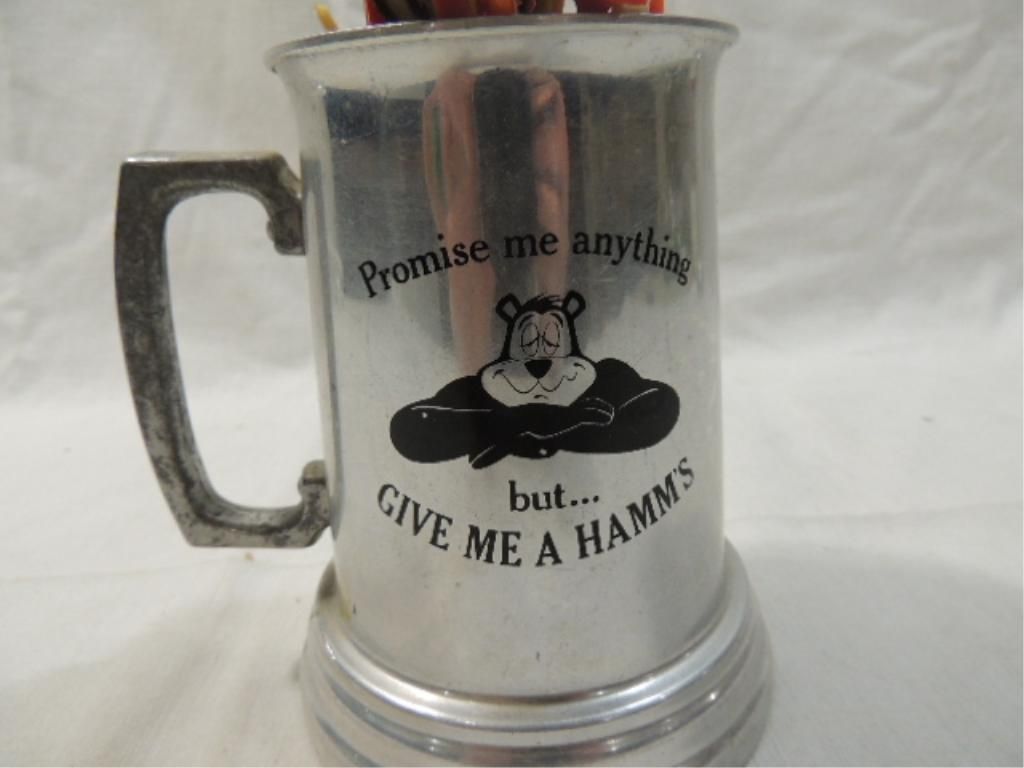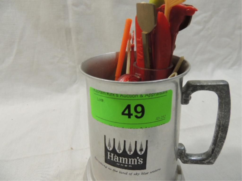 HAMMS BEER STEIN, ASSORTED SWIZZEL STICKS. BRWERIANA COLLECTIBLES AS SHOWN. SEE PHOTO FOR DETAILS
