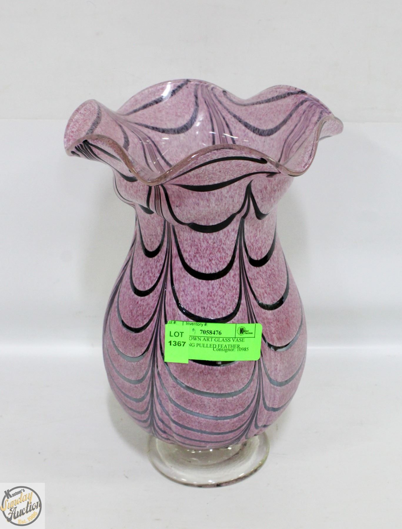 TECHNIQUE WHICH ADDS TEXTURE AND MOVEMENT, PINK IRIDESCENT GLASS WITH BLACK FEATHERING ON CLEAR BASE. **ALL ITEMS MUST BE REMOVED BY 5PM SATURDAY, NOVEMBER 8th 2025. ALL REMAINING ITEMS WILL BE SUBJECT TO A $6.00 PER DAY STORAGE CHARGE. ANY ITEMS REMAINING AFTER MONDAY, NOVEMBER 24TH 2025 WILL BE CONSIDERED FORFEITED. NO REFUNDS WILL BE ISSUED FOR FORFEITED ITEMS. TO SCHEDULE A PICK UP APPOINTMENT CLICK HERE