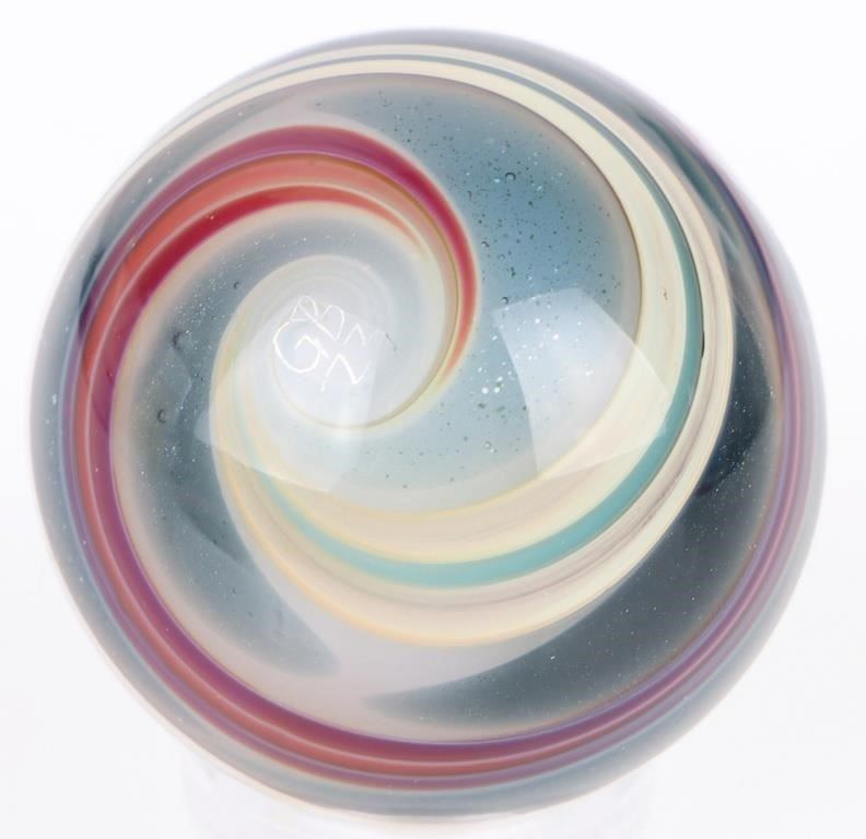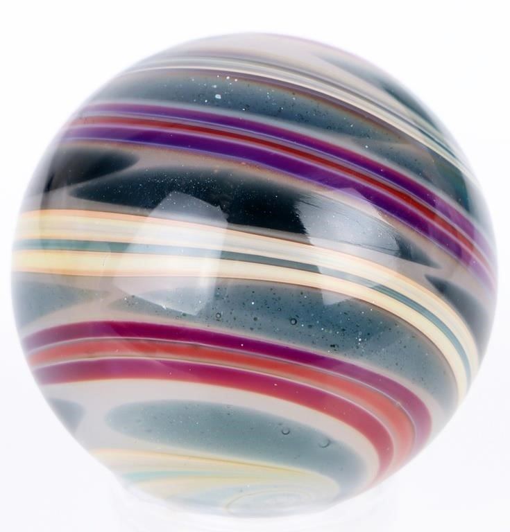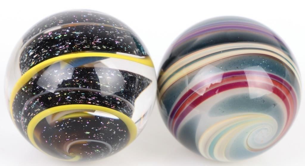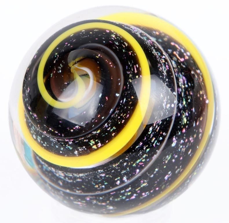 Hand-blown contemporary art glass marbles to include one space-themed 1.10& quot; yellow-swirl marble and one multi-colored striped 1.0& quot; marble.