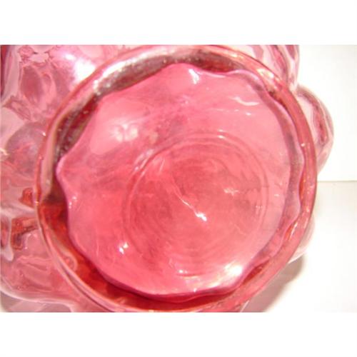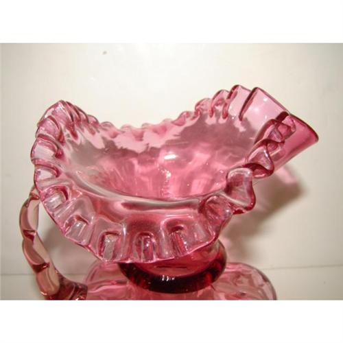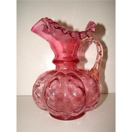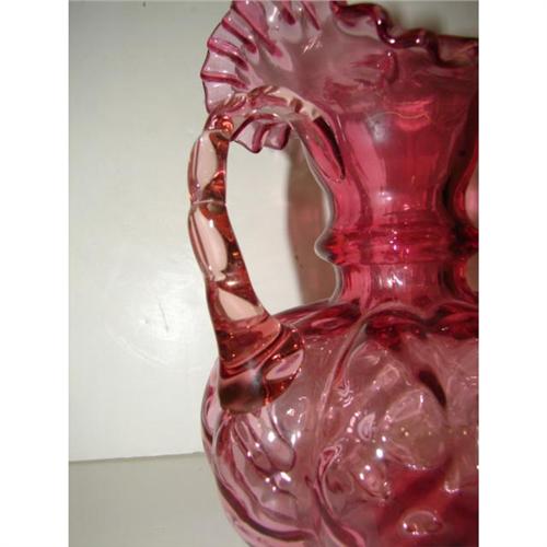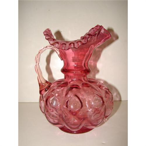 HAND BLOWN CRANBERRY GLASS PITCHER. Pitcher has a puffy paneled bottom with a fluted top and has an applied glass handle. 8” H