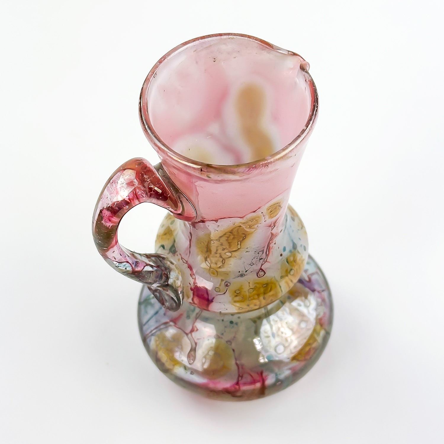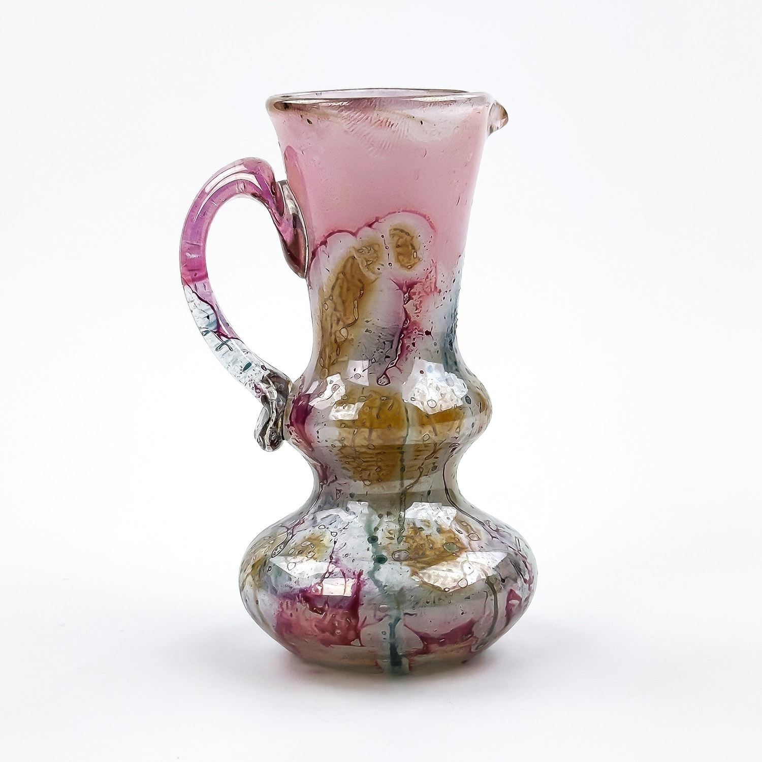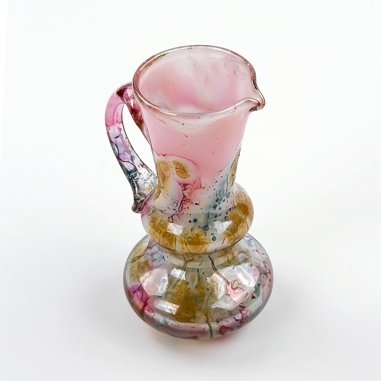 #8033 - COLOURFUL MINIATURE STUDIO ART GLASS PITCHER - AGE AND ARTIST UNKNOWN. MEASURES: 3.5” (9 CM) TALL BY 2” (5 CM) DIAMETER BASE - WIDEST PART.