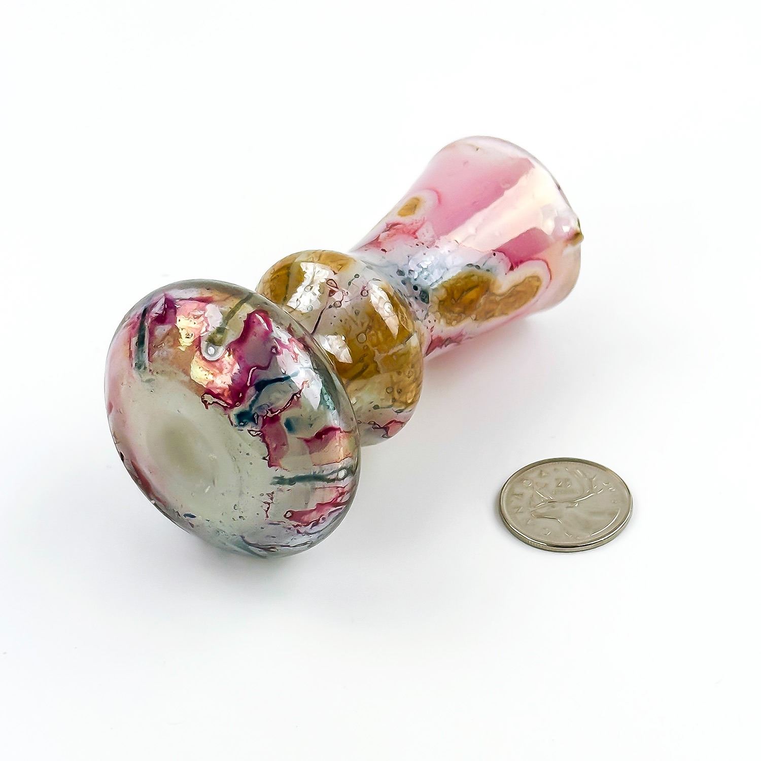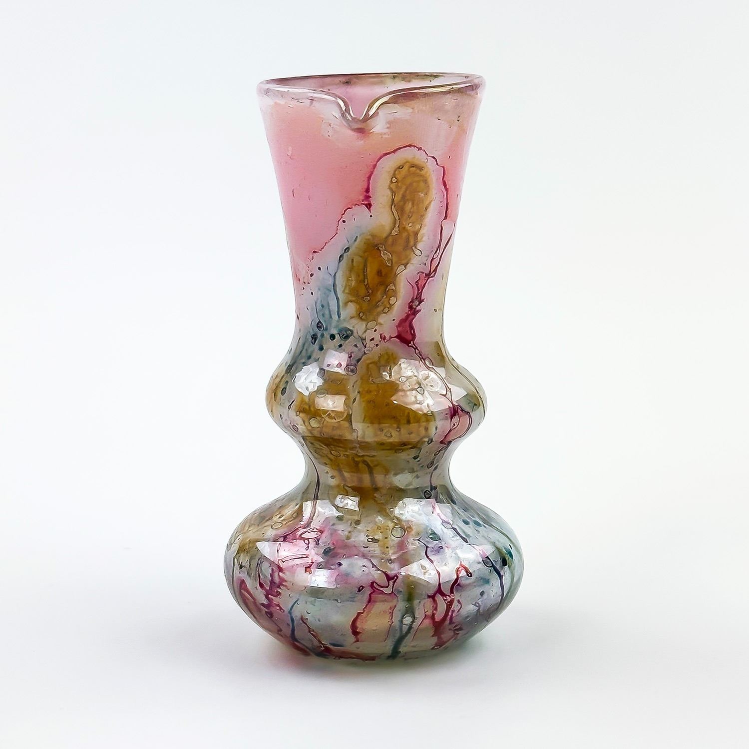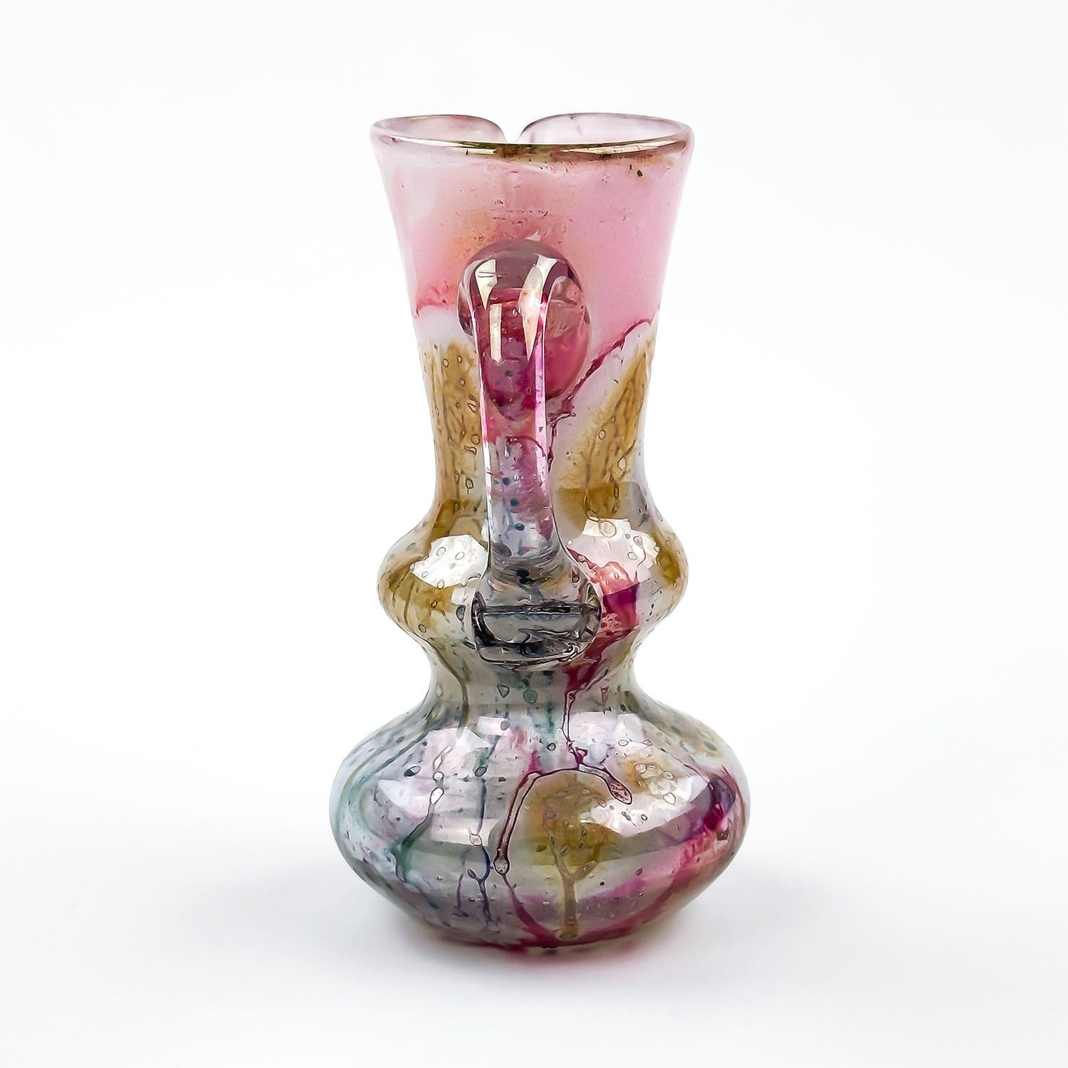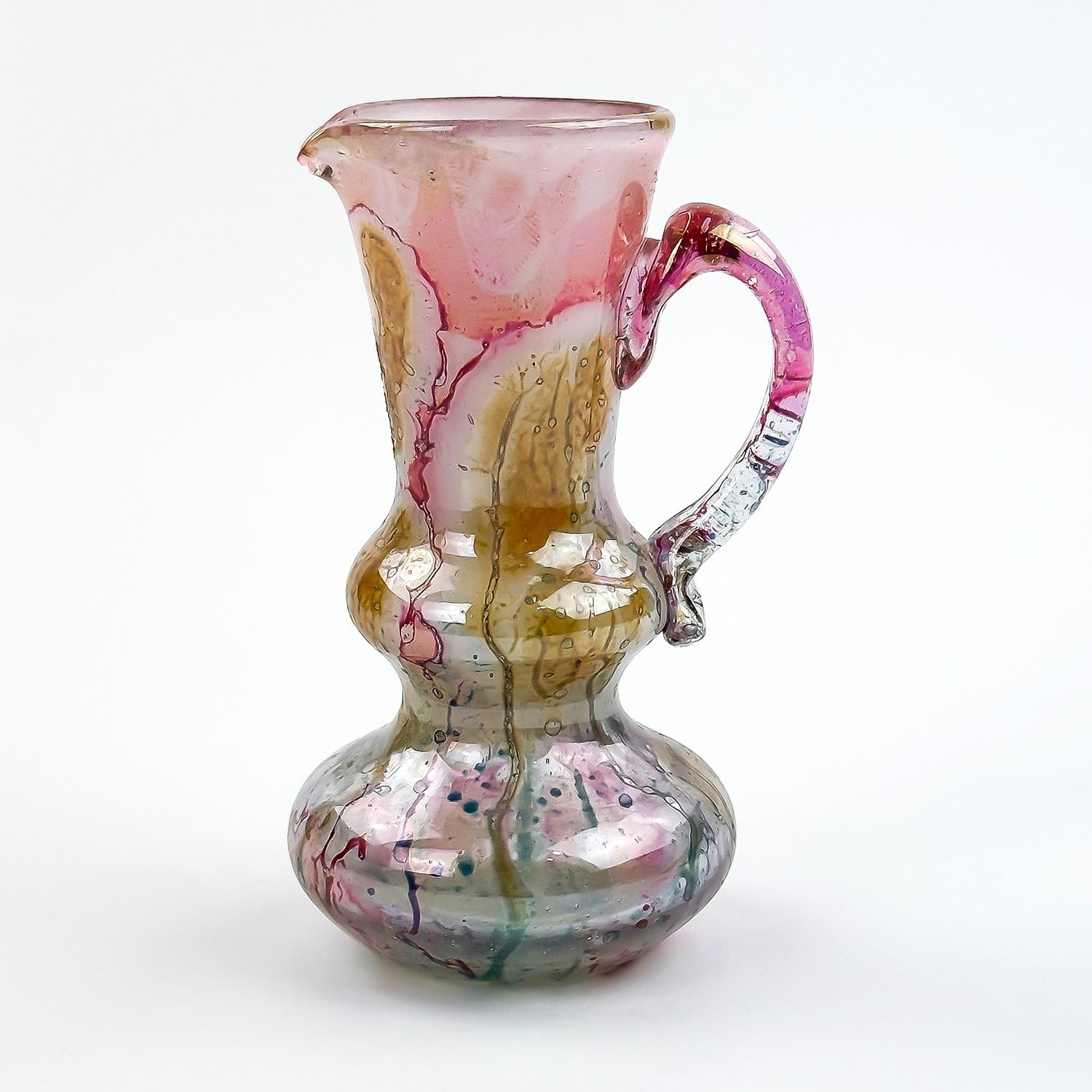 #8033 - COLOURFUL MINIATURE STUDIO ART GLASS PITCHER - AGE AND ARTIST UNKNOWN. MEASURES: 3.5” (9 CM) TALL BY 2” (5 CM) DIAMETER BASE - WIDEST PART.
