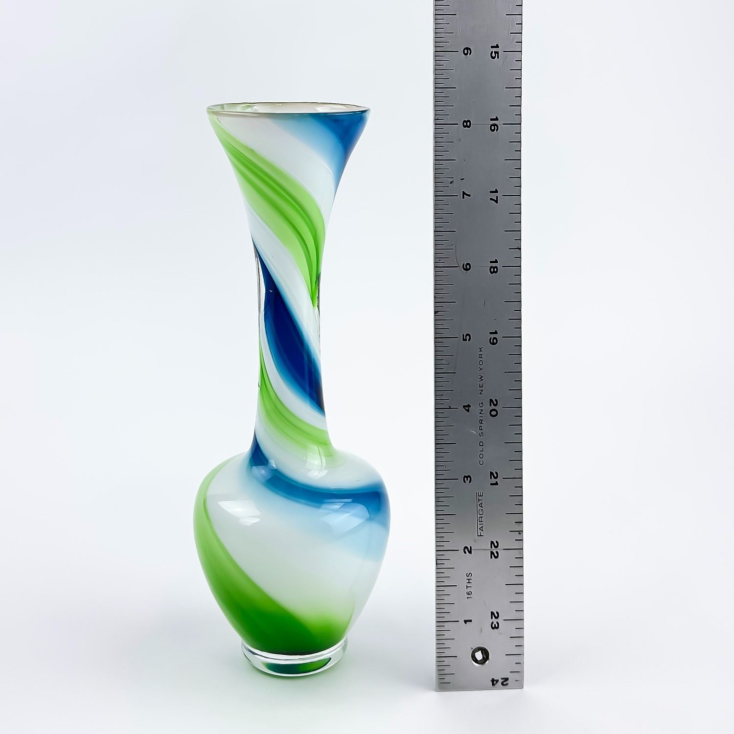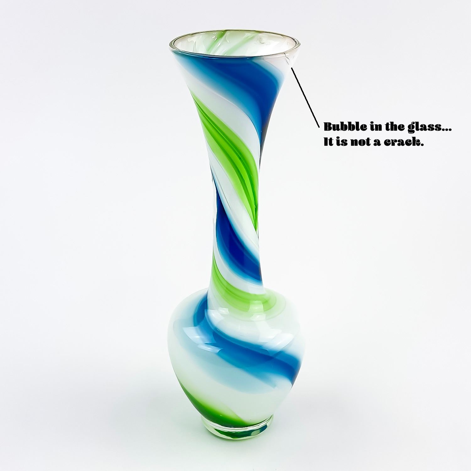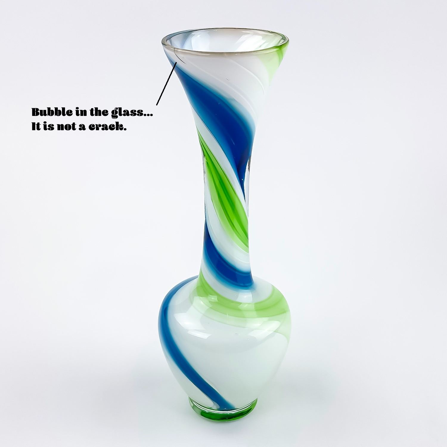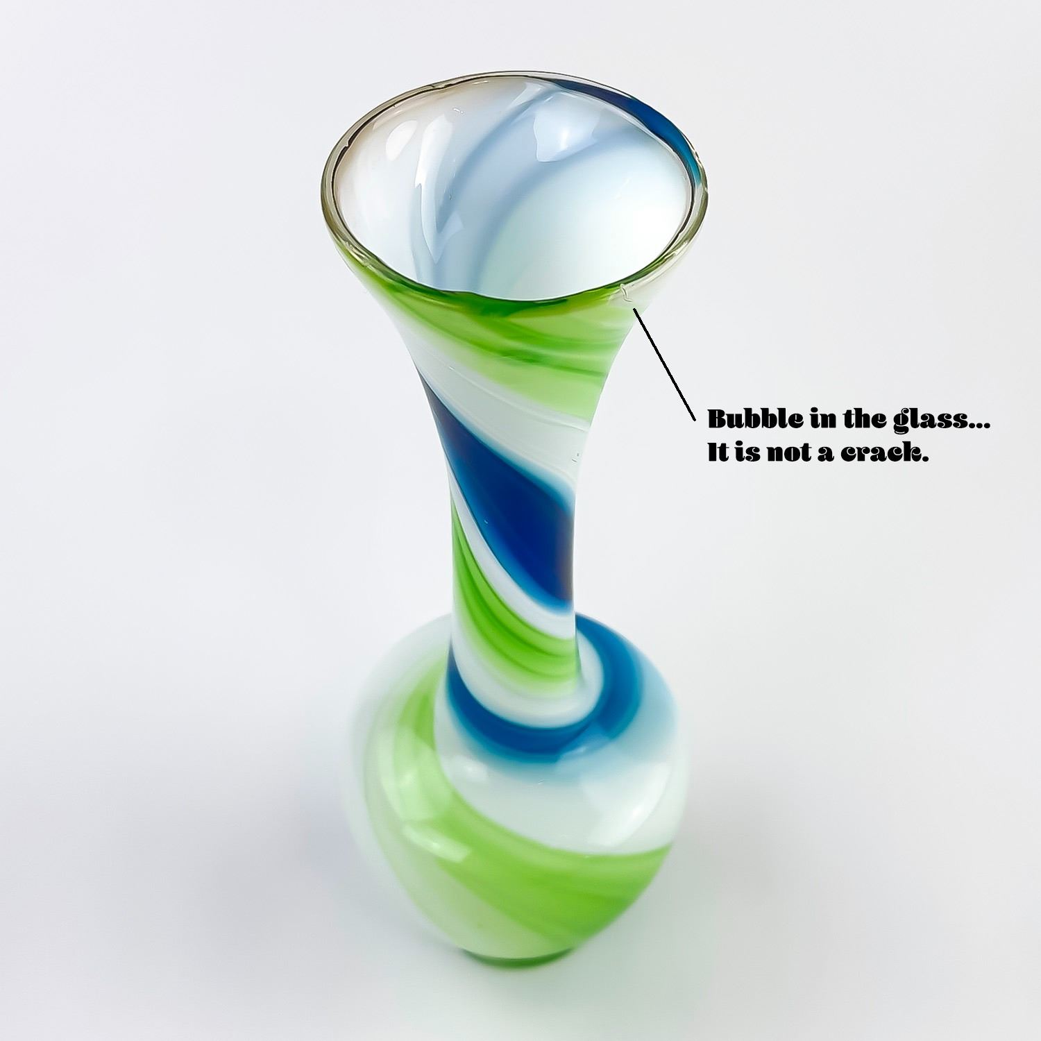 #8150 - VINTAGE MURANO STYLE STUDIO ART GLASS FLOWER VASE. GREEN, BLUE AND WHITE PEPPERMINT SWIRL DESIGN. HOME OR OFFICE DECOR VASE SCULPTURE. NO CRACKS, CHIPS OR REPAIRS. MEASURES 8” (20.5 CM) TALL BY 3” (7.5 CM) WIDEST DIAMETER AND 2.125” (5.5 CM) TOP DIAMETER.