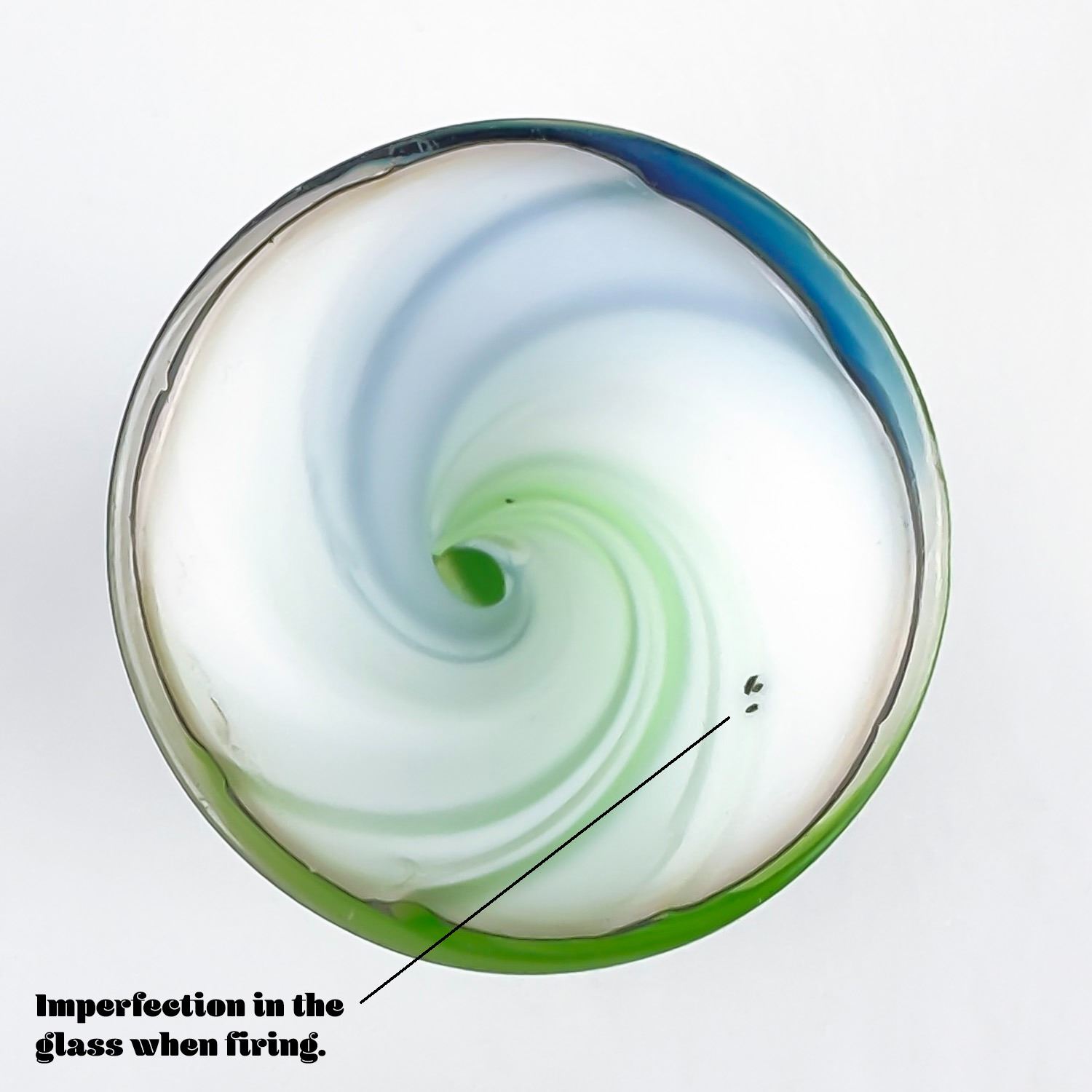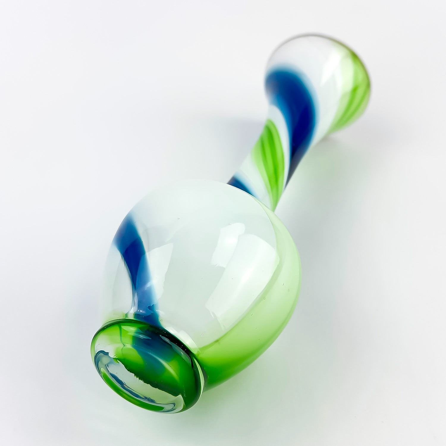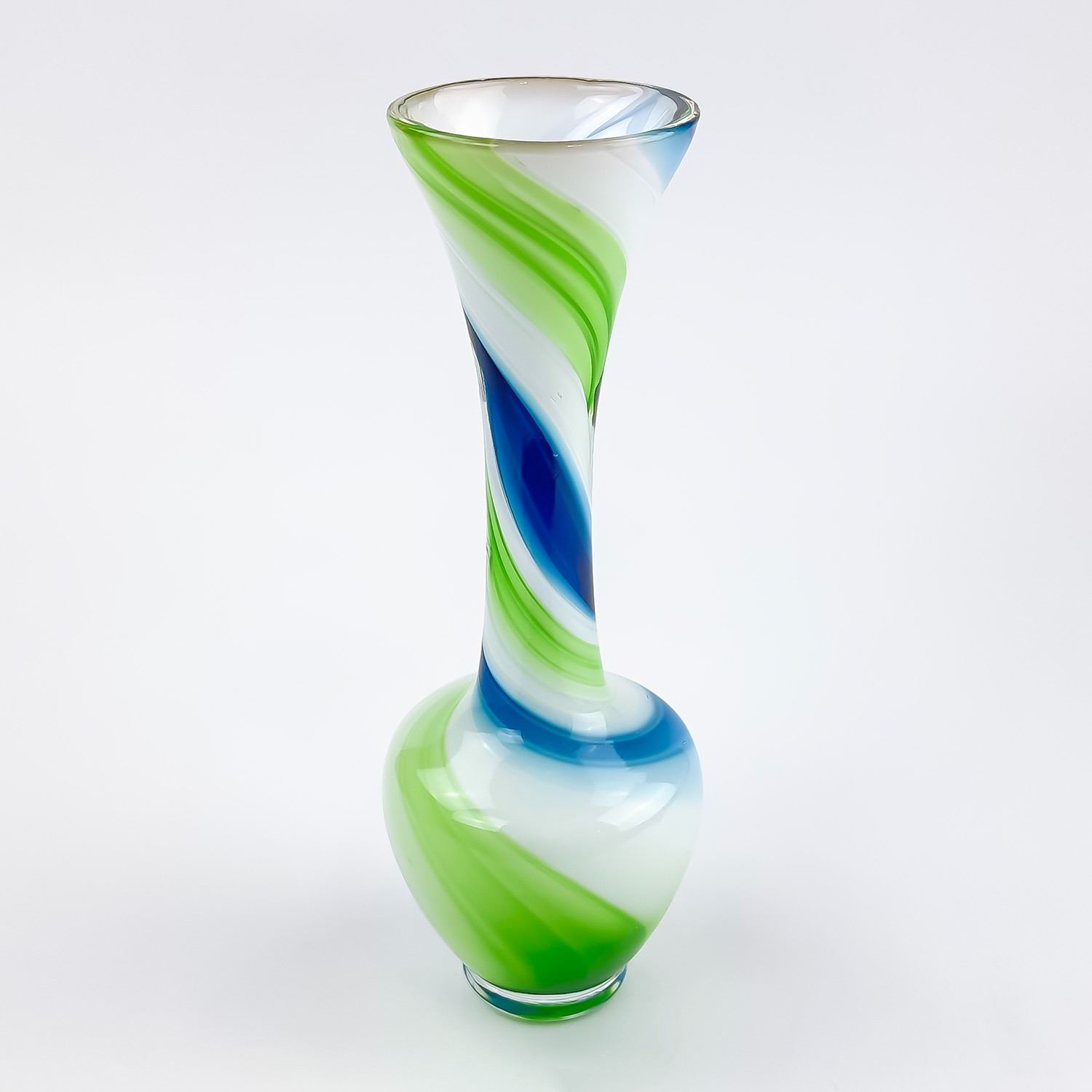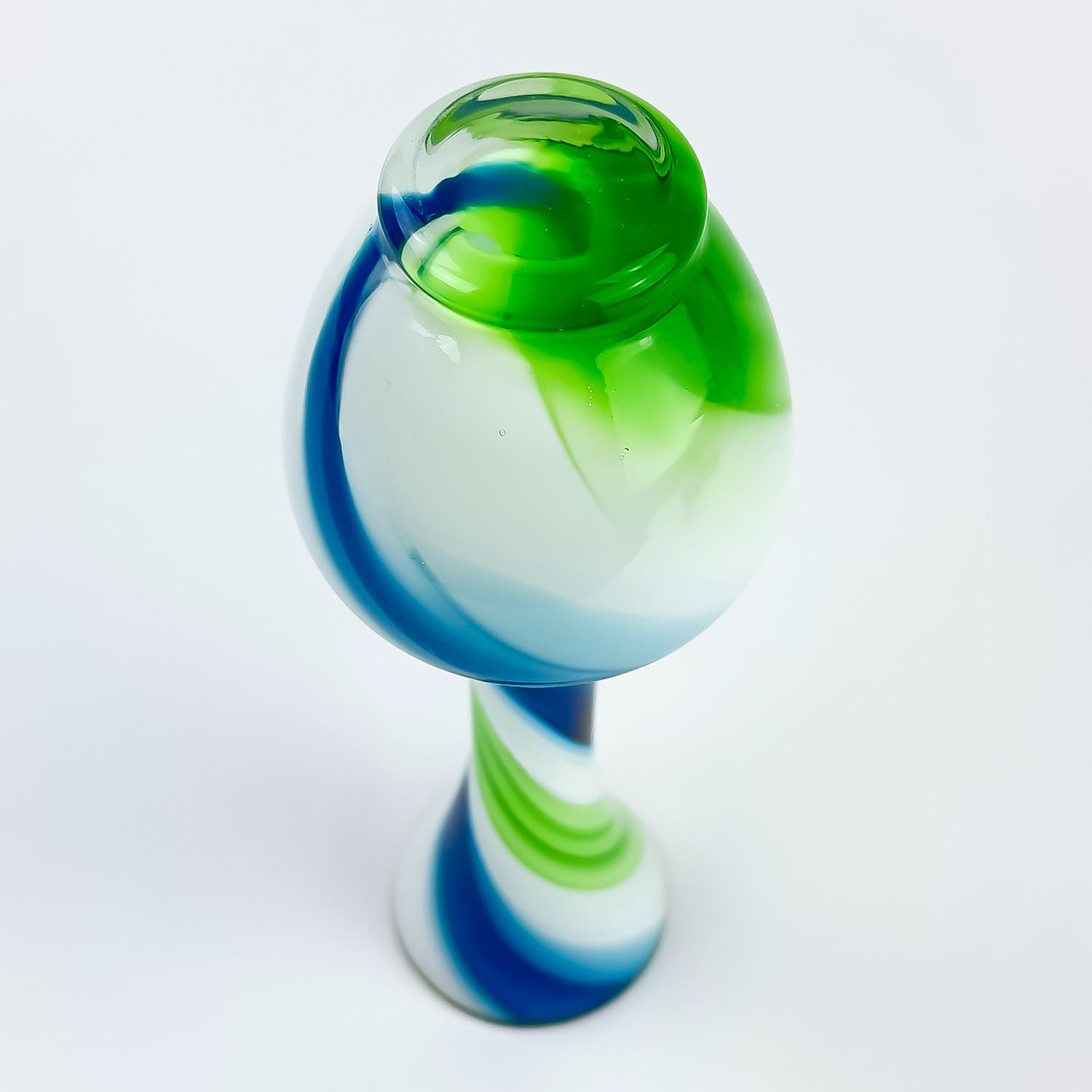 #8150 - VINTAGE MURANO STYLE STUDIO ART GLASS FLOWER VASE. GREEN, BLUE AND WHITE PEPPERMINT SWIRL DESIGN. HOME OR OFFICE DECOR VASE SCULPTURE. NO CRACKS, CHIPS OR REPAIRS. MEASURES 8” (20.5 CM) TALL BY 3” (7.5 CM) WIDEST DIAMETER AND 2.125” (5.5 CM) TOP DIAMETER.