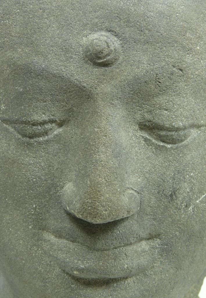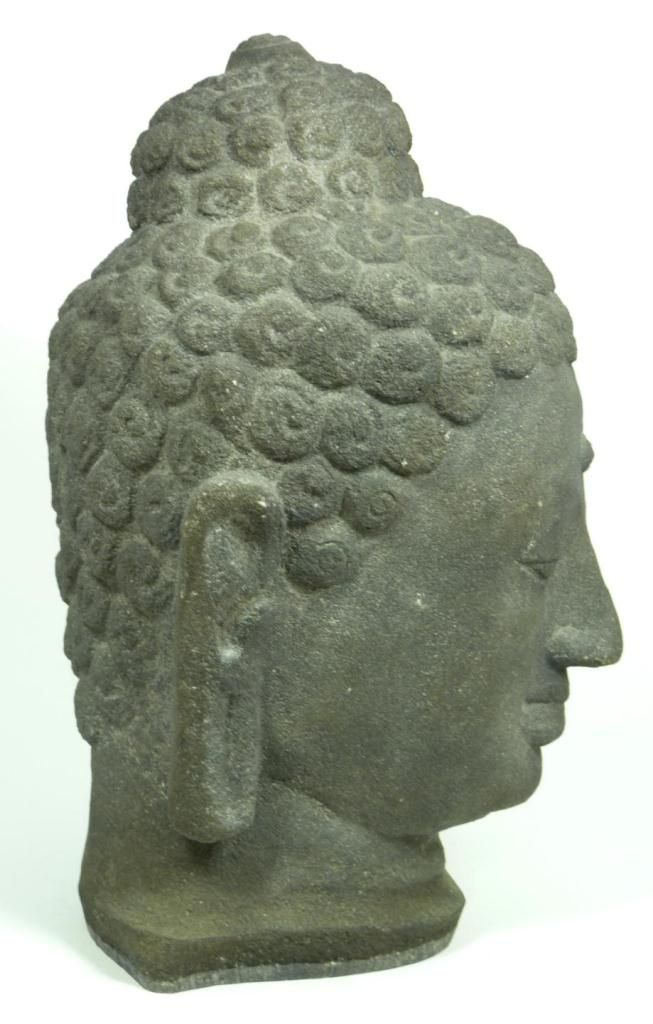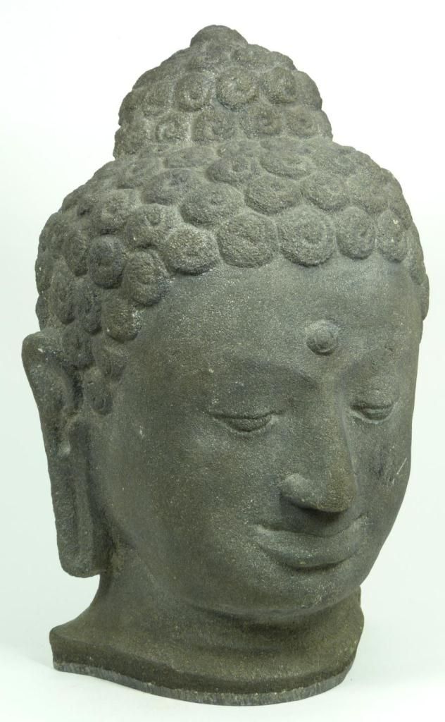 Asian carved black stone Buddha head. 19th/20th century. Measures 12 5/8" height (32cm). Total weight of 5.93 kilograms.