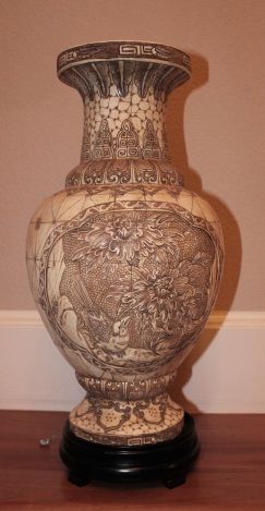 ANTIQUED HAND CARVED BONE VASE ON STAND - EXCELENT CONDITION - MINT - BIRD DESIGN ADORNS FRONT AND BACK - WOOD BASE/ STAND - 18.75" X 9" X 9"