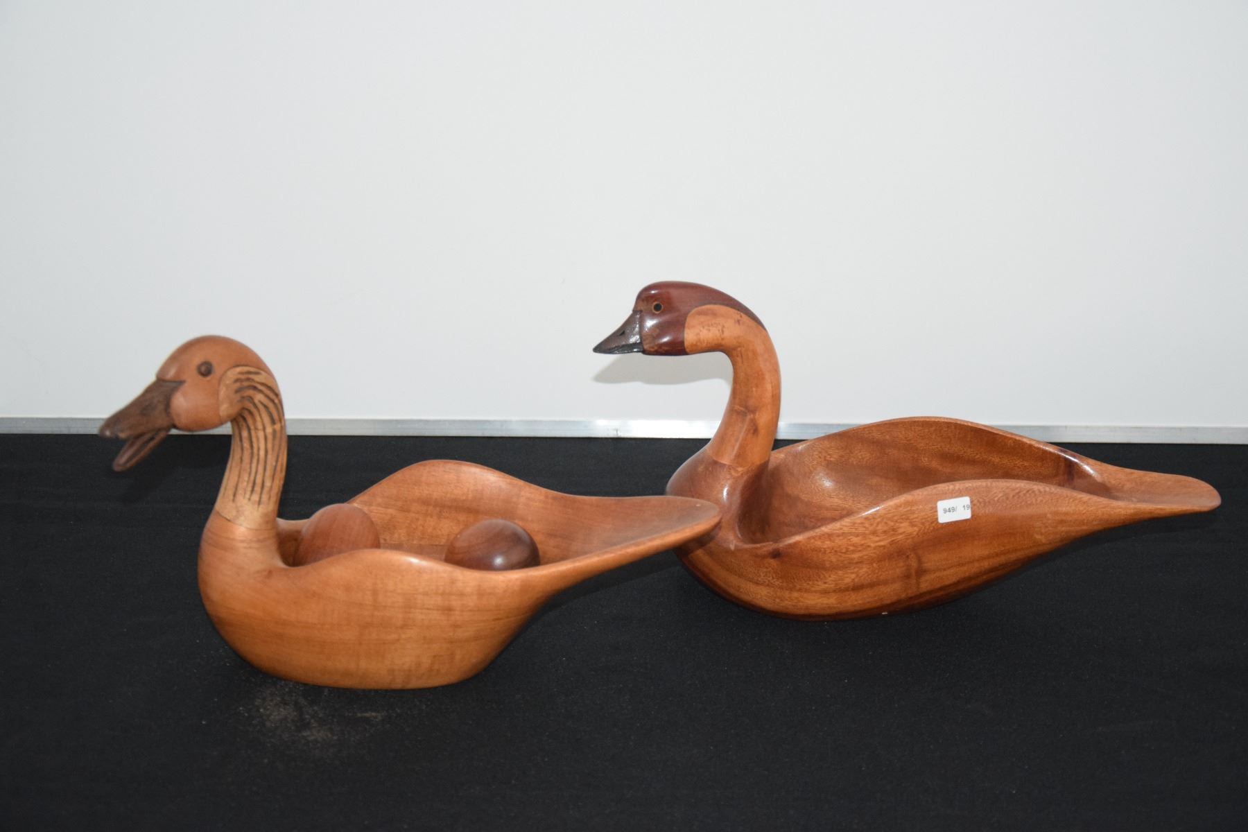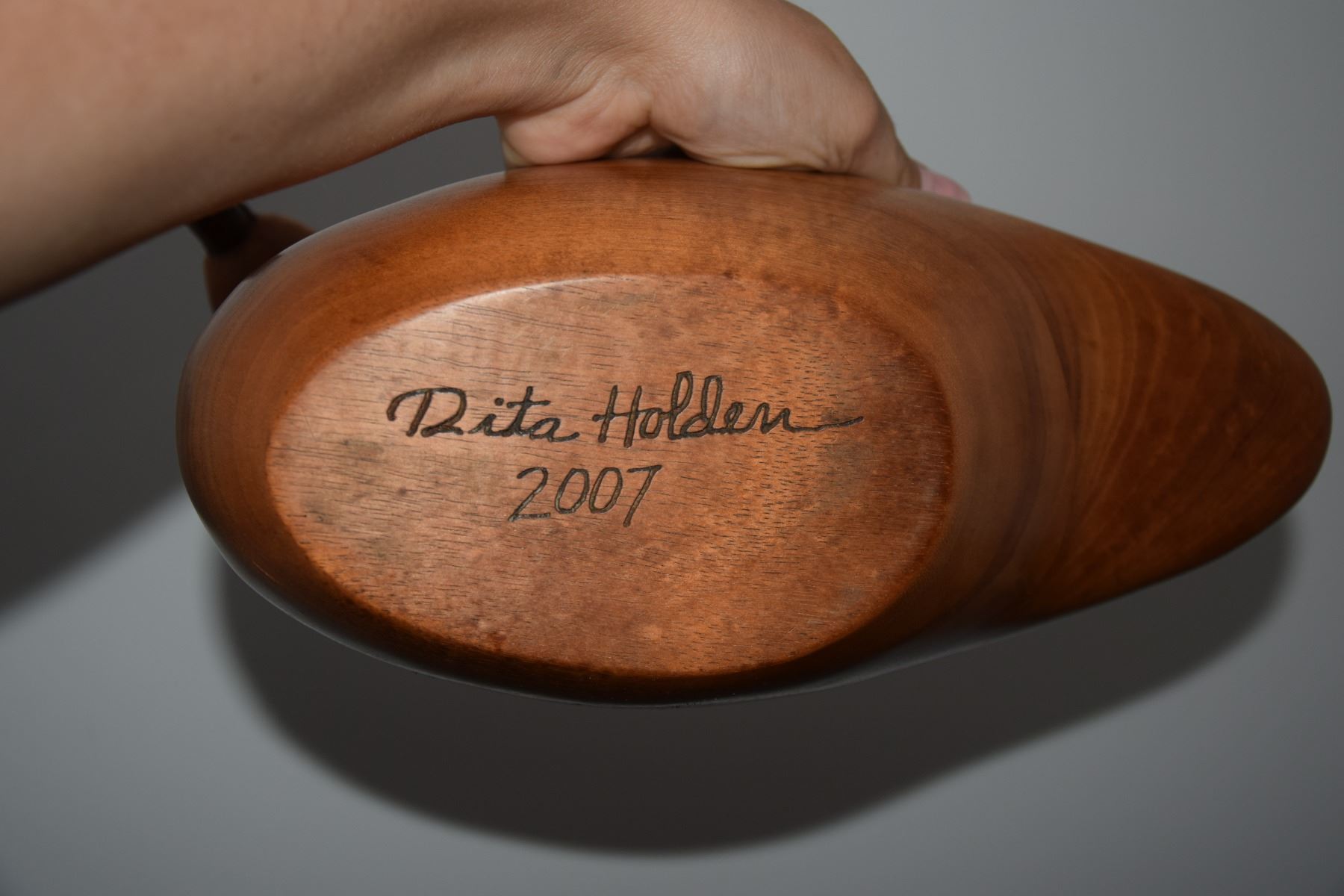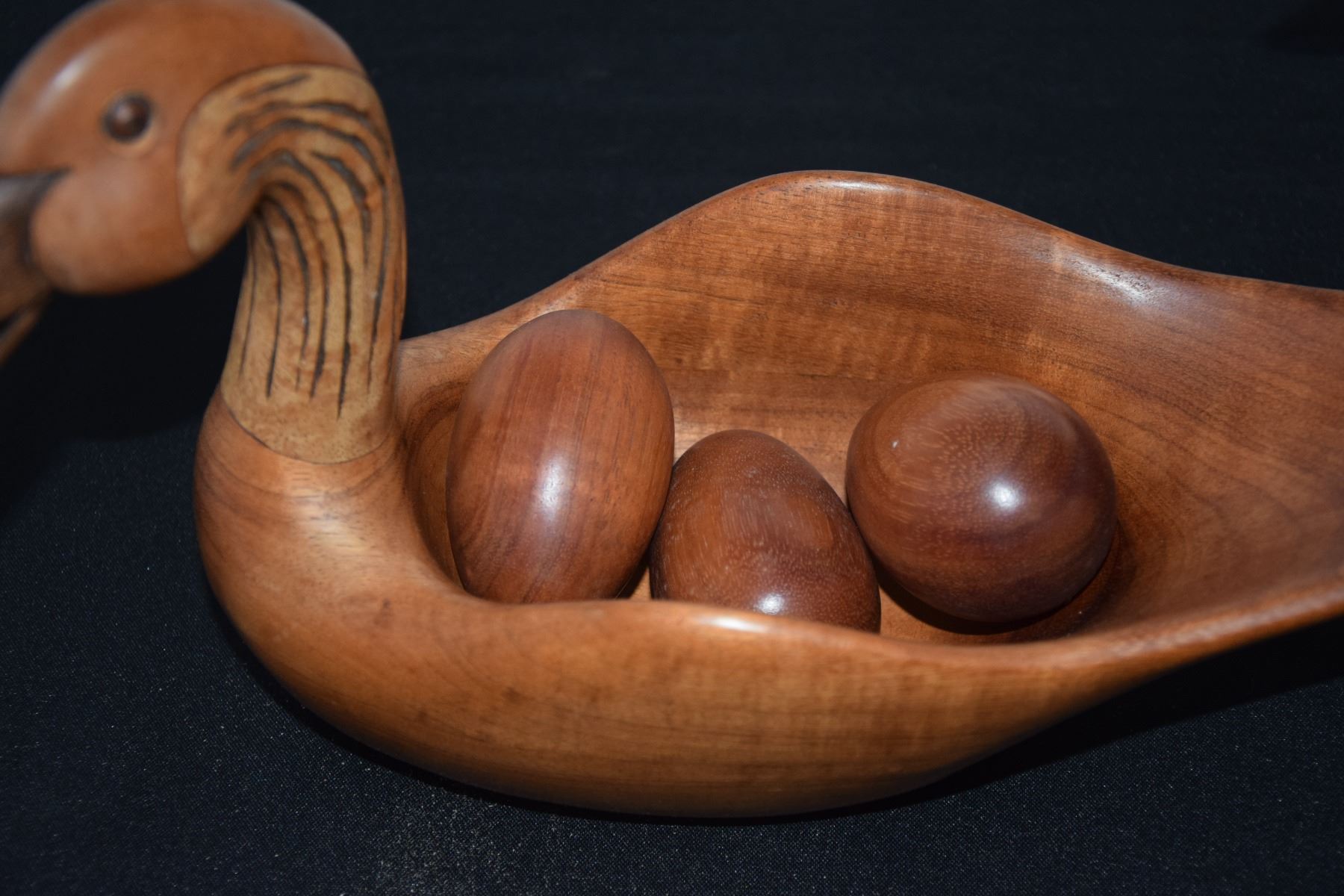 HAND CARVED HAWAIIAN DUCK; SIGNED AND HAND CARVED NENE W/3 EGGS BY RITA HOLDEN (5 PCS)