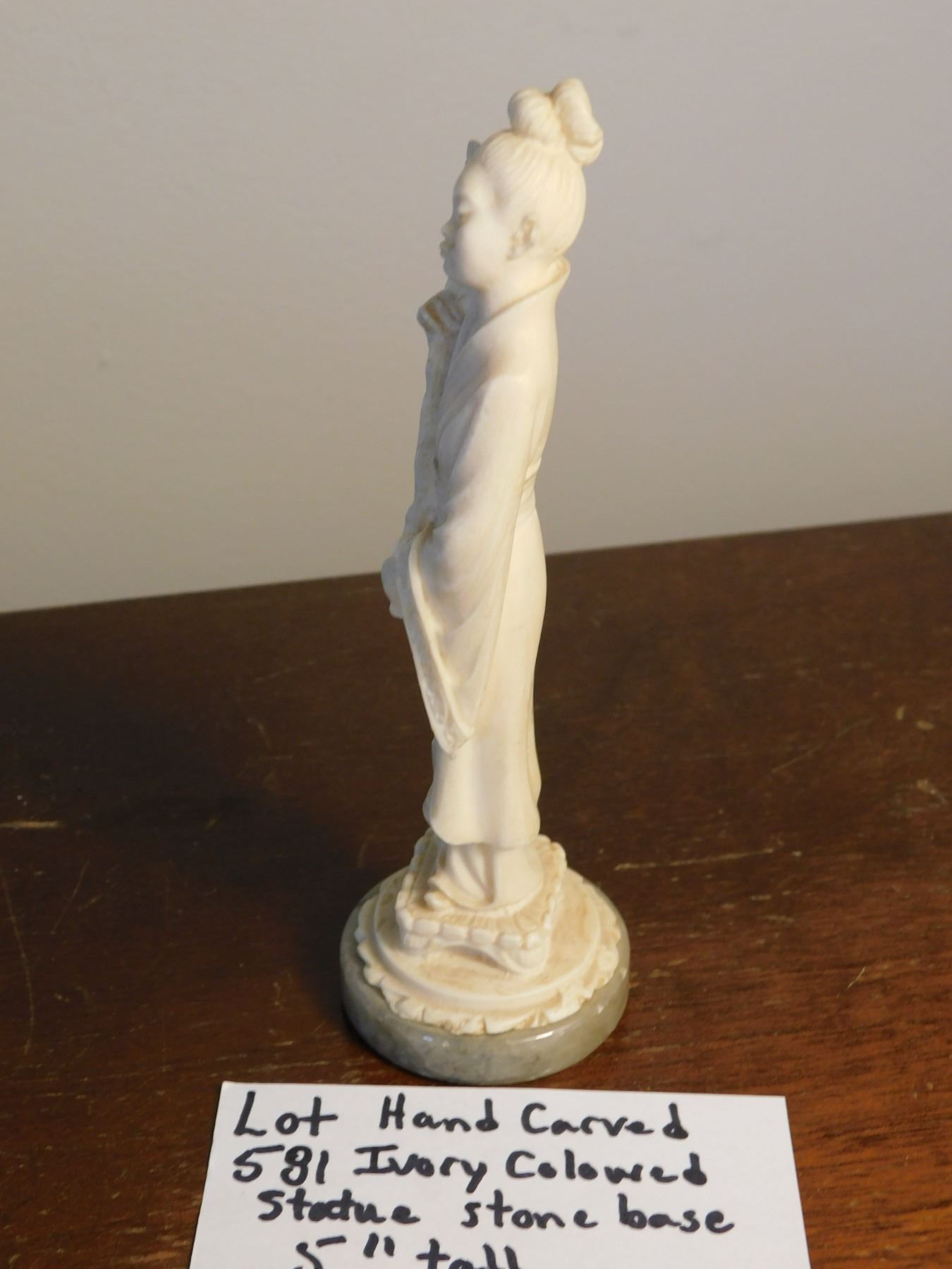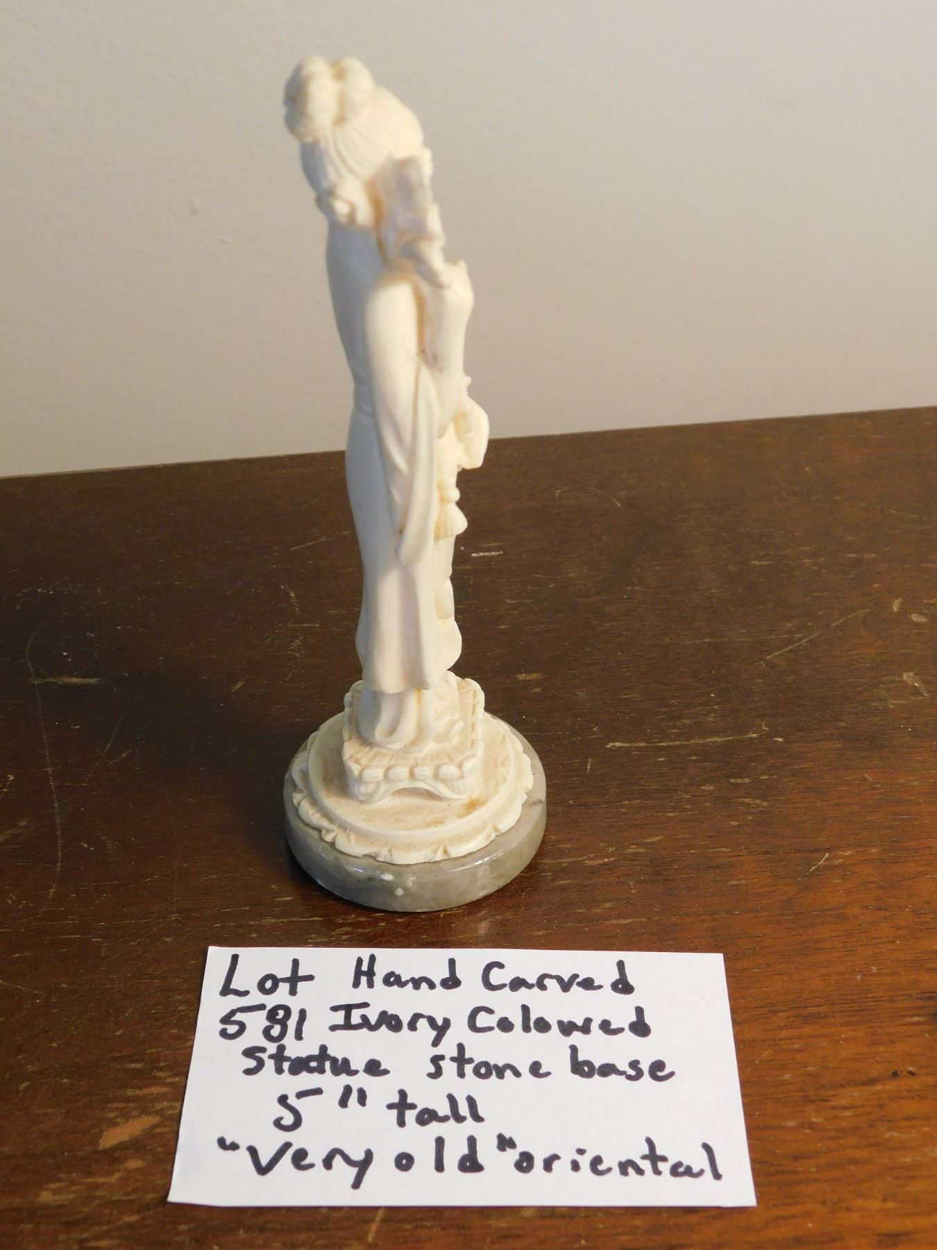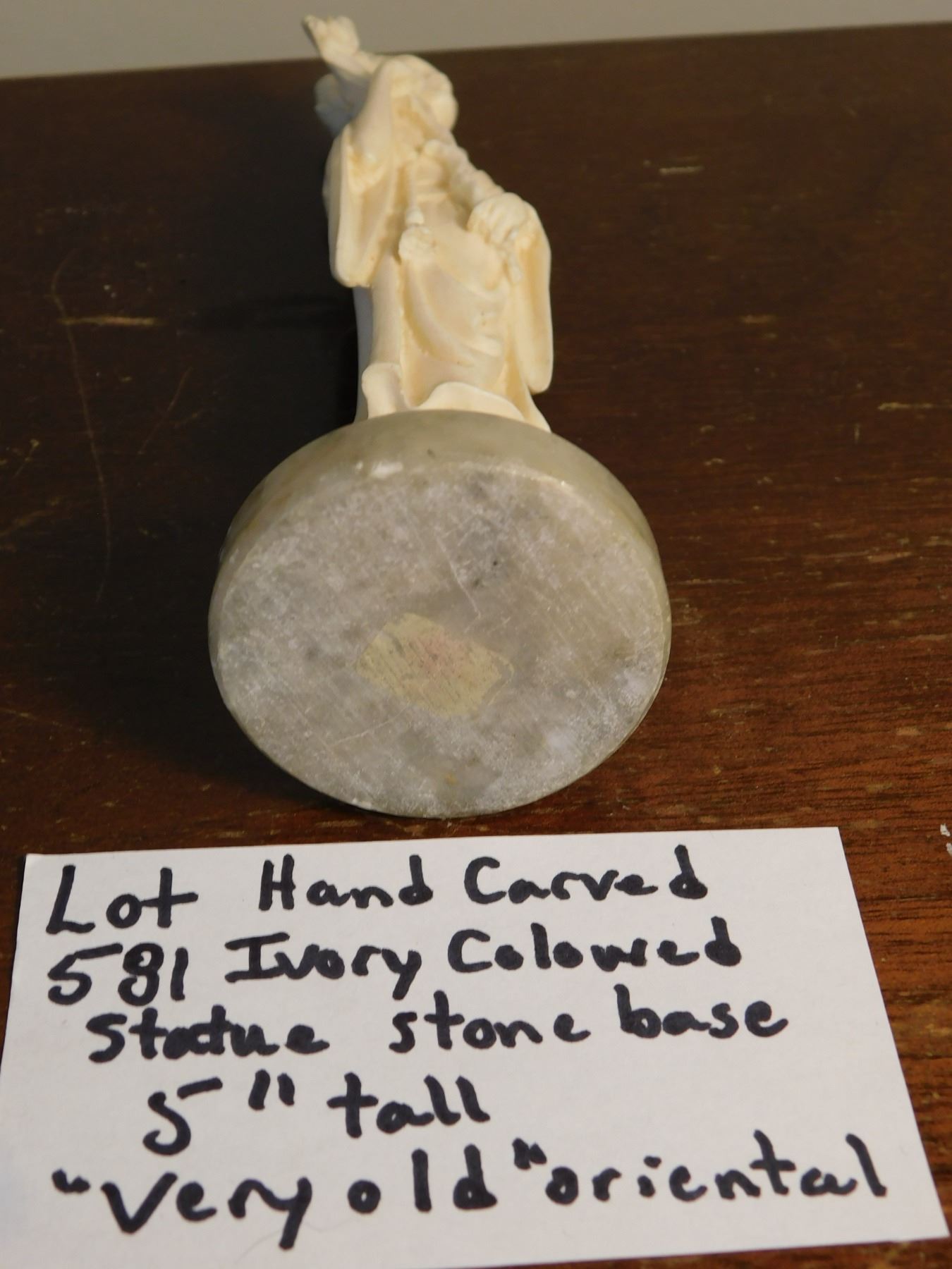 HAND CARVED, IVORY COLOURED STATUE, STONE BASE 5” TALL ORIENTAL FIGURE