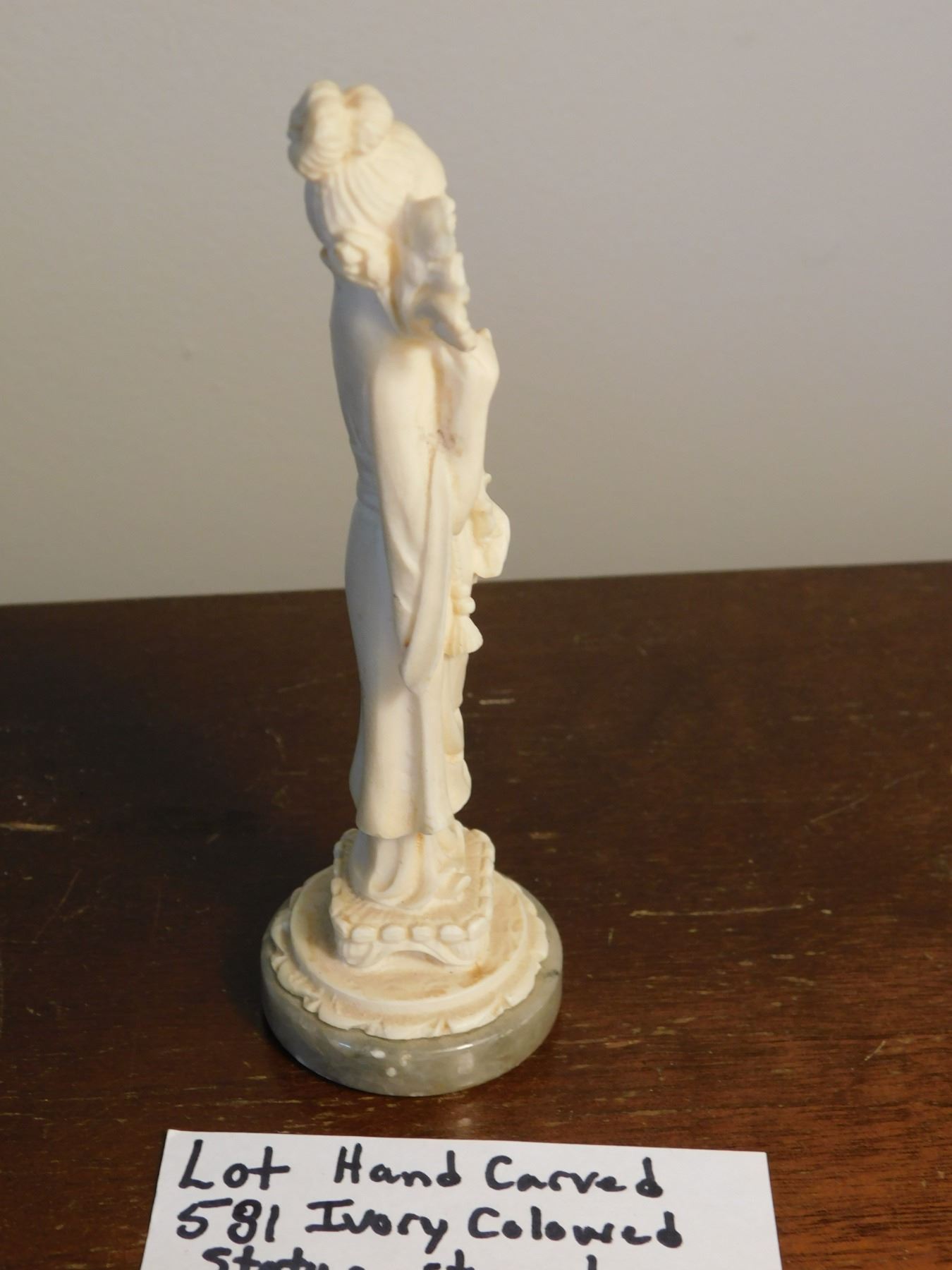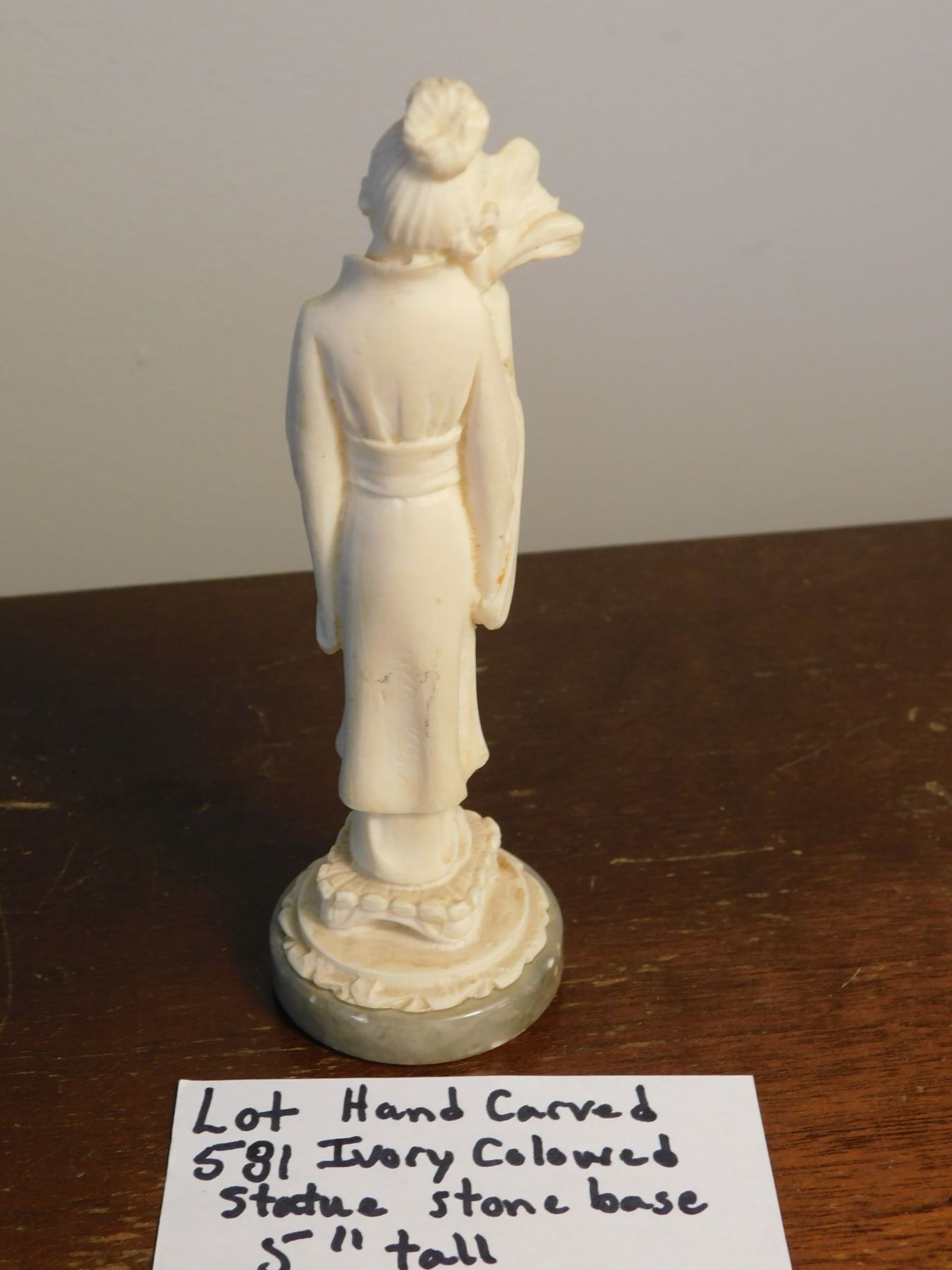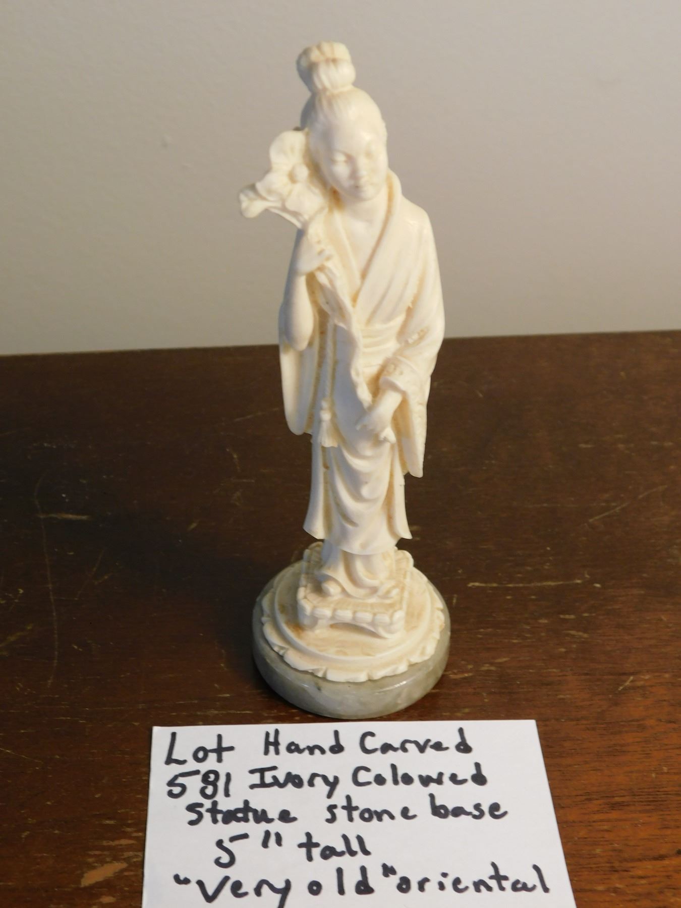 HAND CARVED, IVORY COLOURED STATUE, STONE BASE 5” TALL ORIENTAL FIGURE