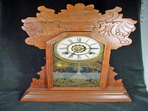 HAND CARVED MAHOGANY KITCHEN CLOCK WITH TIMER BY WATERBURY CLOCK CO. 22.25" X 15" X 4.75" FROM 1926.