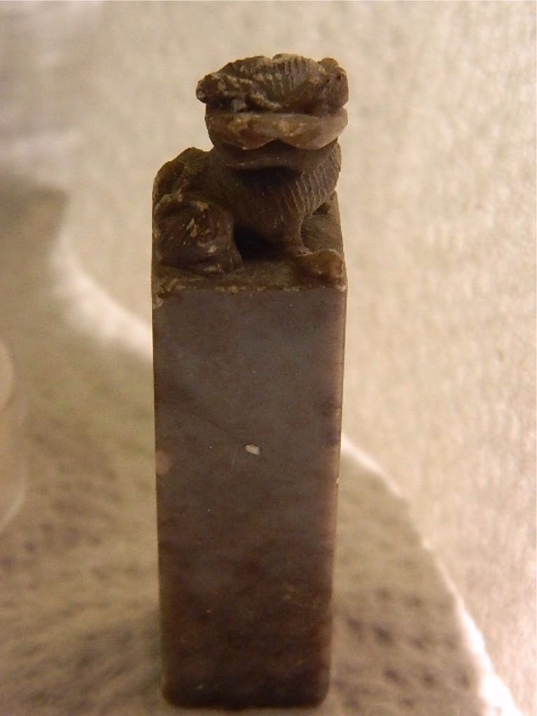 HAND CARVED MARBLE PEDESTAL - ORIENTAL FOODOG ON TOP - 2 3/4" TALL - BROWN MARBLE