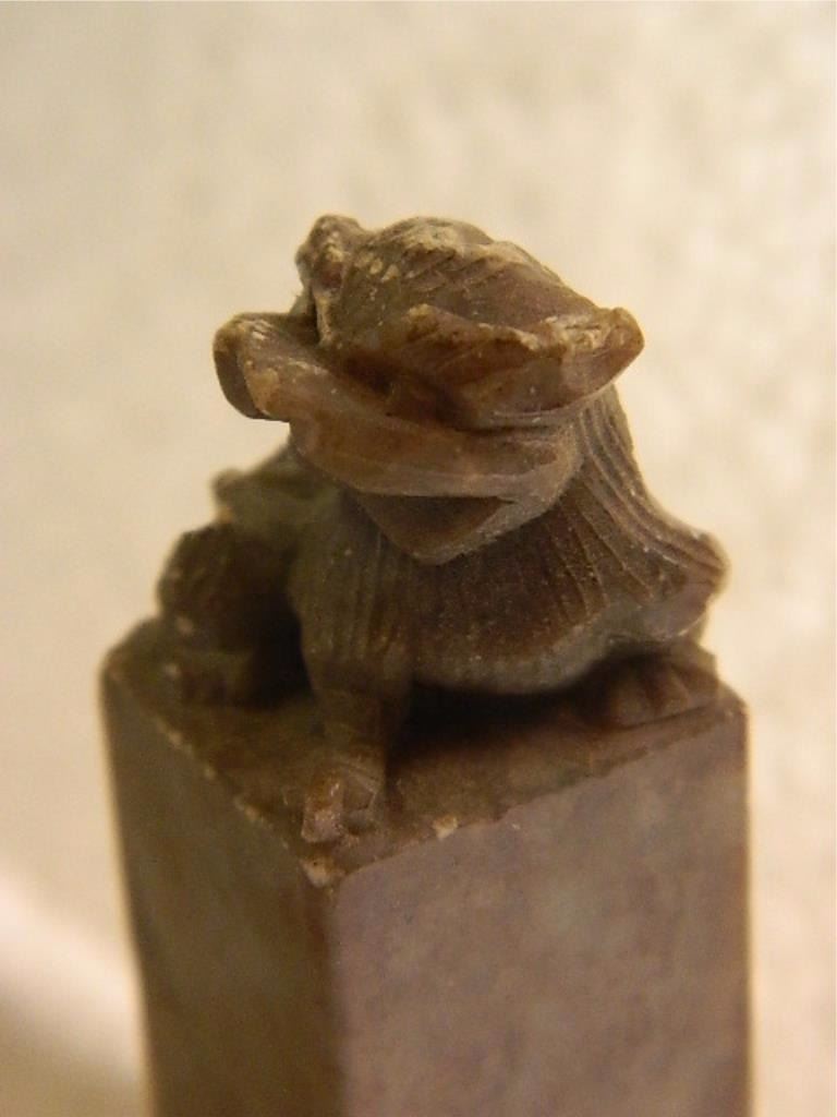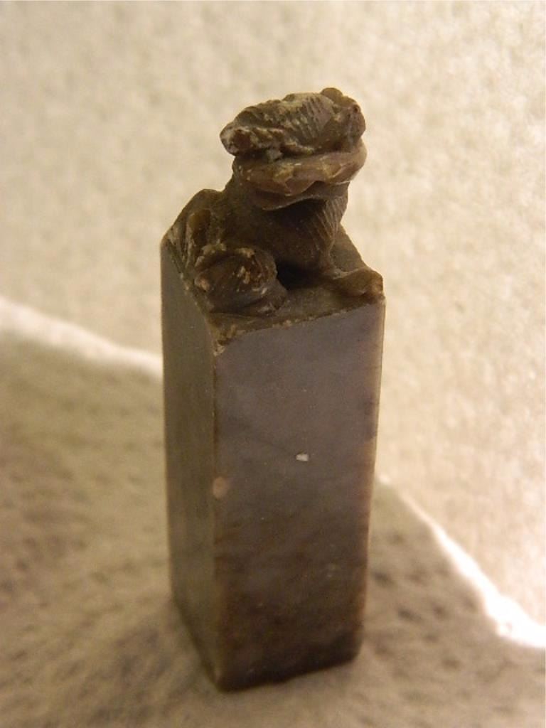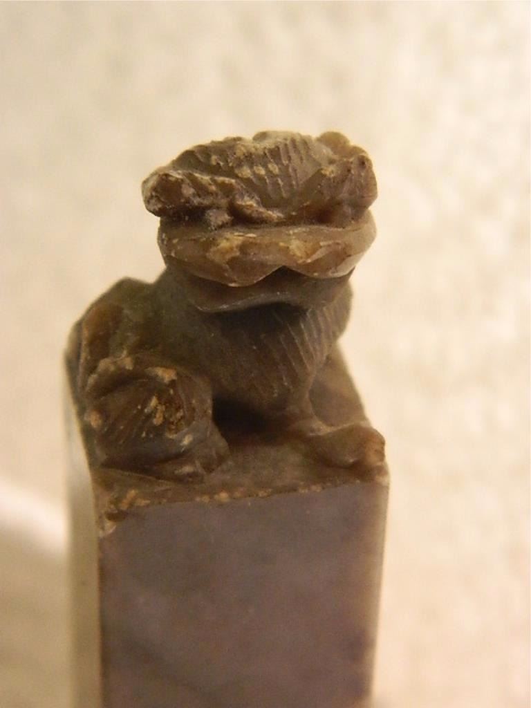 HAND CARVED MARBLE PEDESTAL - ORIENTAL FOODOG ON TOP - 2 3/4" TALL - BROWN MARBLE