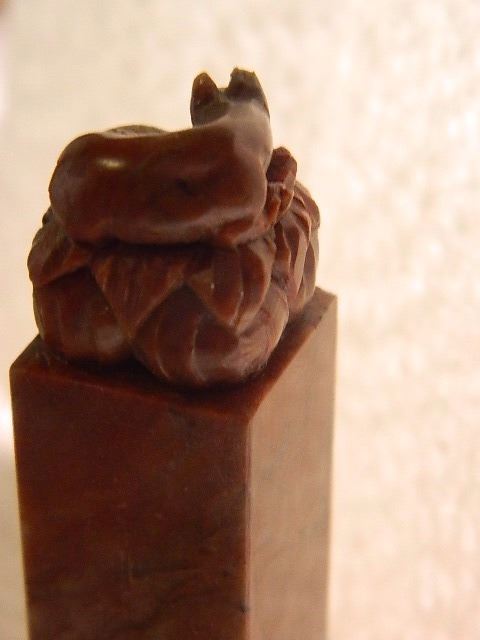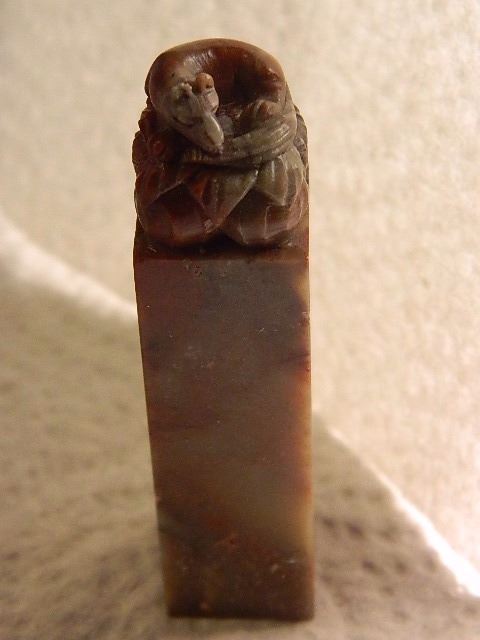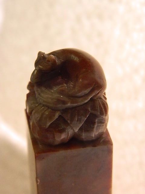 HAND CARVED MARBLE PEDESTAL - ORIENTAL RAT ON TOP - REDISH MARBLE - 2 3/4" TALL - ORIENTAL WRITING ON BASE STAMPED "W.C." WITH ORIGINAL BOX