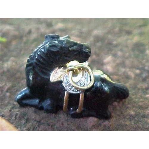 UNIQUE HAND CARVED OBSIDIAN HORSE PENDANT WITH BRILLANT DIAMOND AND GOLD SADDLE. THE DETAIL IS AMAZING IN THE CARVING OF THE HORSE FOR SUCH A HARD SUBSTANCE AS OBSIDIAN. THERE IS A TOTAL OF 10 CUT DIAMONDS ( 5 ON EACH SIDE OF THE SADDLE ).