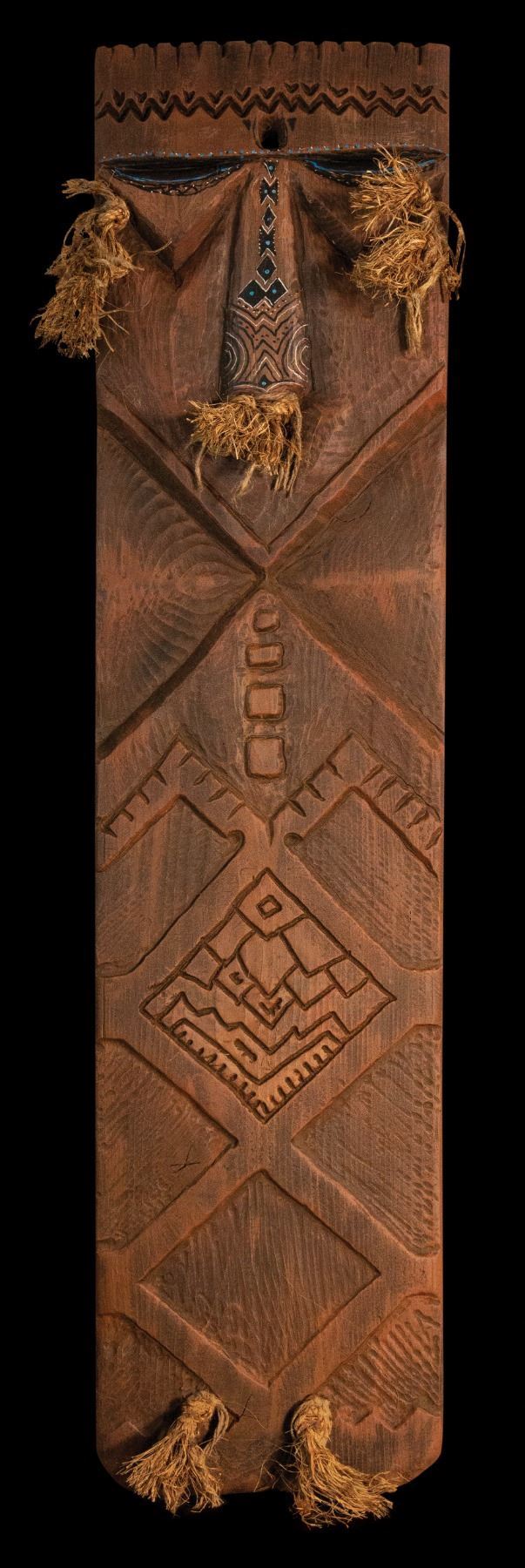 (1980s) A fantastic original one-off hand carving by LeRoy Schmaltz with rope and raffia adornment. Signed and carved signature on the back. 50"x11.5". VG+ with typical wear.
