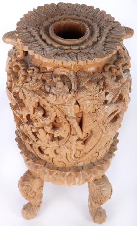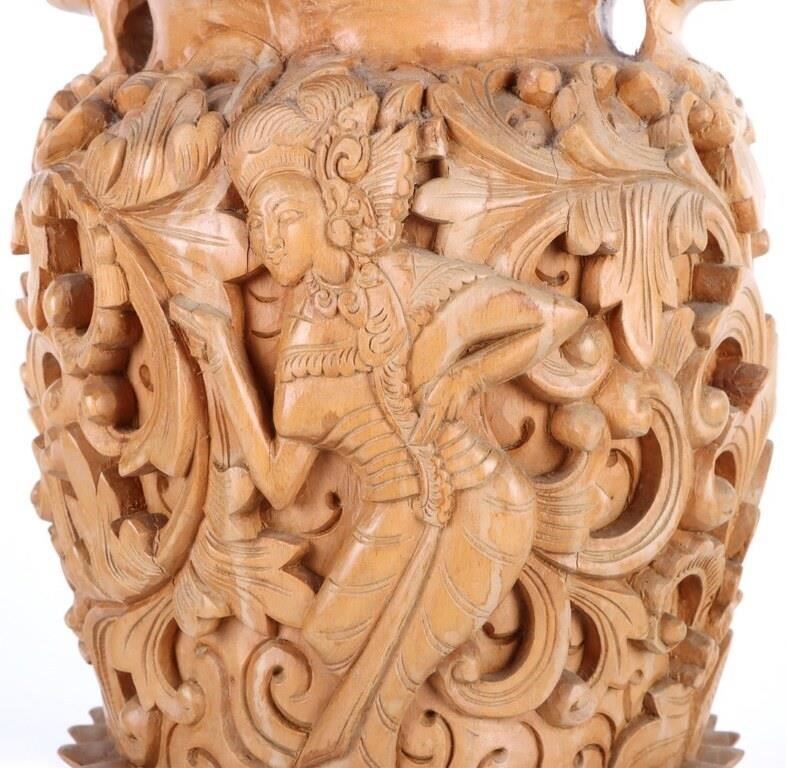 Hand-carved ornate Balinese wooden vase. This vase has beautiful cultural details and motifs.