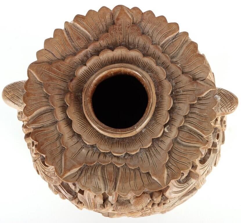 Hand-carved ornate Balinese wooden vase. This vase has beautiful cultural details and motifs.