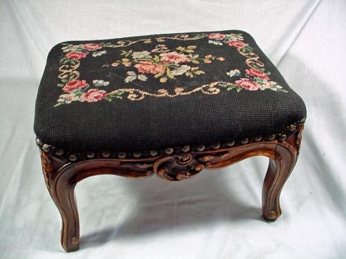 HAND CARVED VICTORIAN FOOTSTOOL CIRCA 1930'S UPHOLSTERED WITH NEEDLEPOINT TAPESTRY IN A FLORAL PATTERN. 9" X15" X 11"