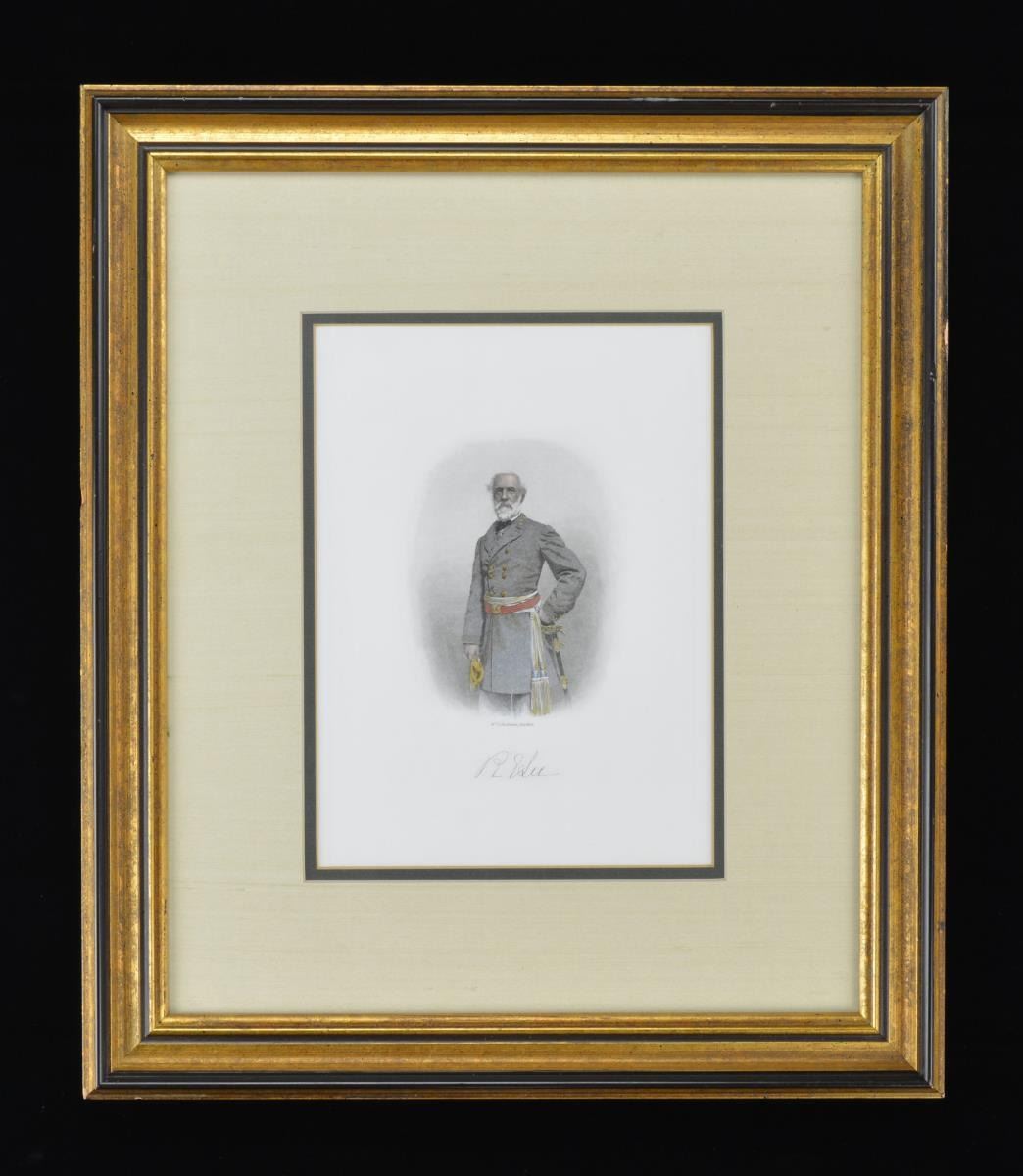 FACSIMILE SIGNATURE. 16” x 19” framed, 7.5” x 10” mat. Wartime engraving by W. G. Jackman, New York, image taken by famous Vannerson photo of Lee with his Maryland presentation Devisme sword. PROVENANCE: The Cullen Smith Estate Collection. (02-17282/JS). $200-300.