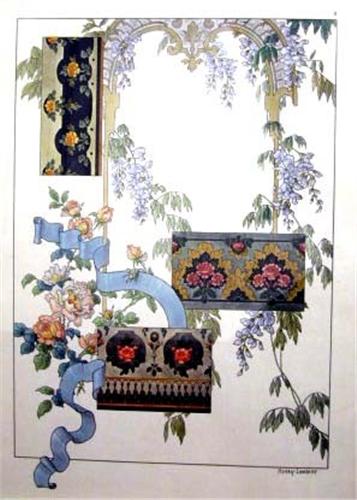 HAND COLORED ENGRAVING; depicting wisteria and wall paper borders, signed ll, Henry Lambert, 16"h x 12"w