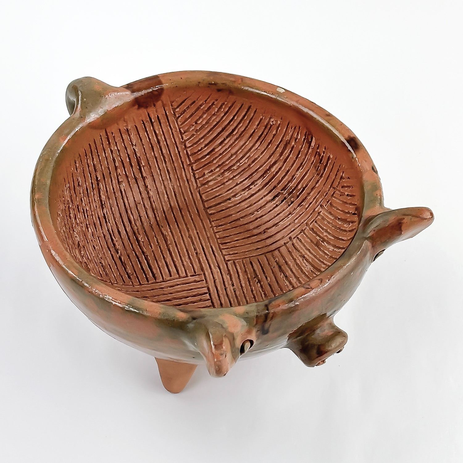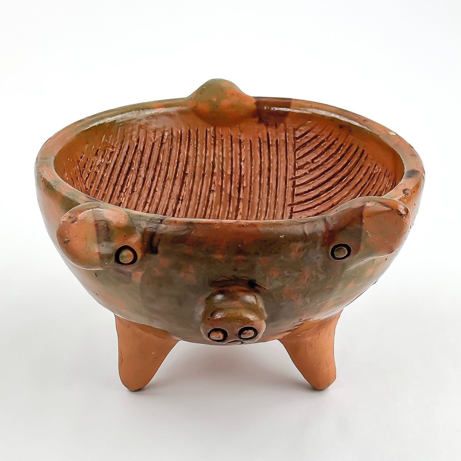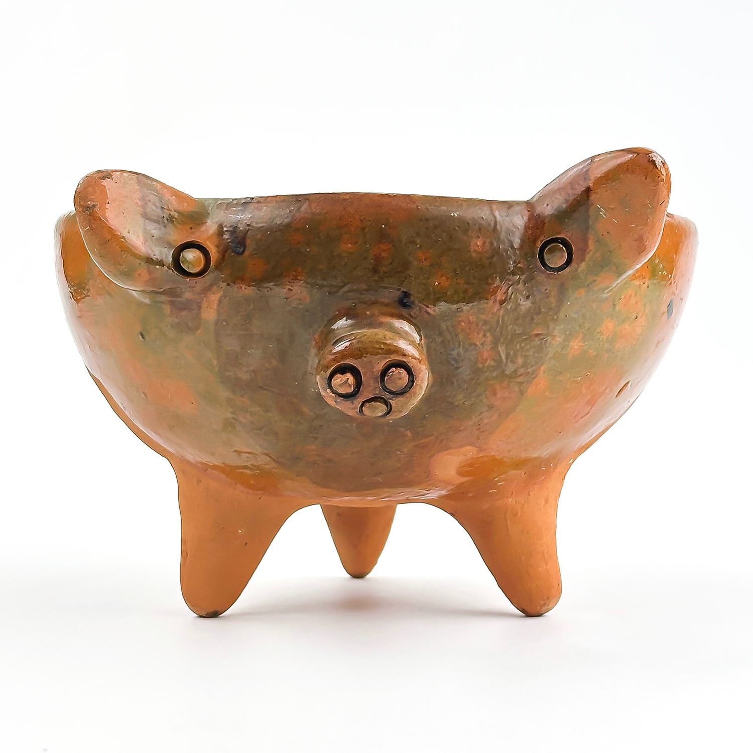 #8166 - UNMARKED HAND CRAFTED TERRACOTTA CLAY SCULPTURE - 3-LEGGED PIG BOWL. ARTIST UNKNOWN, BUT I BELIEVE IT WAS MADE IN MEXICO. THIS ONE OF A KIND FOLK ART STYLE FARM PIG DISH MEASURES: 9” (23 CM) LONG BY 7.5” (19 CM) WIDE AND STANDS 5” (12.5 CM) HIGH