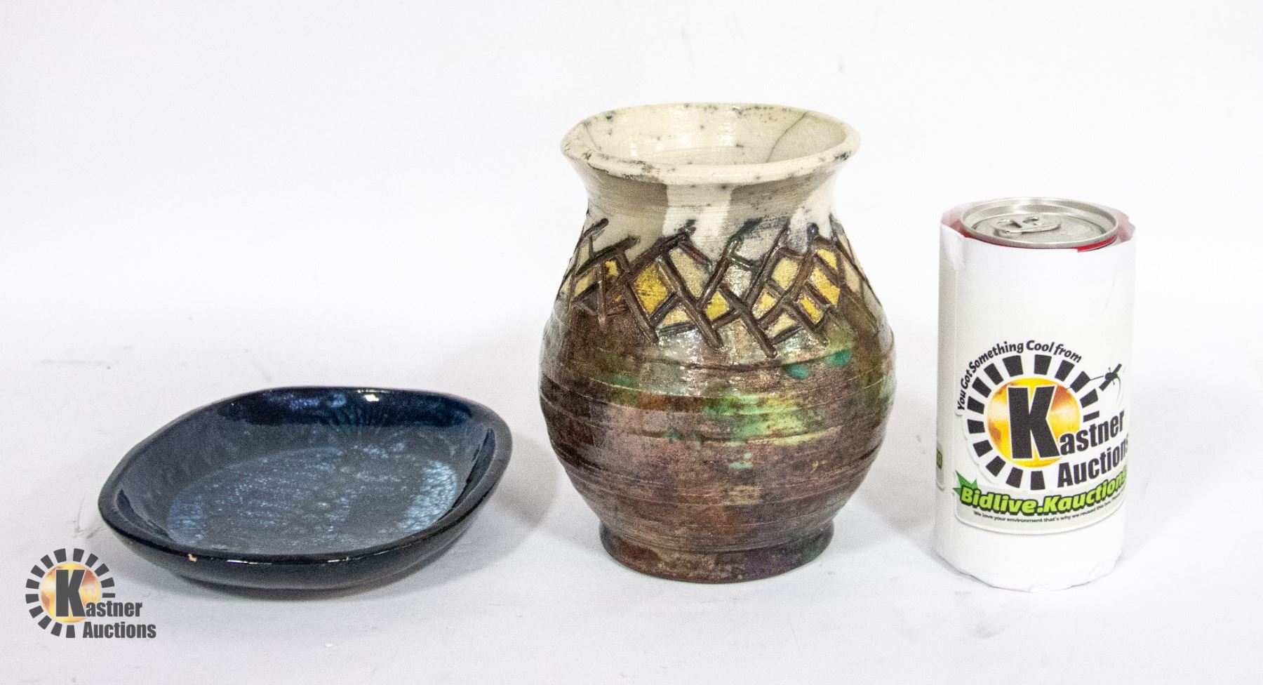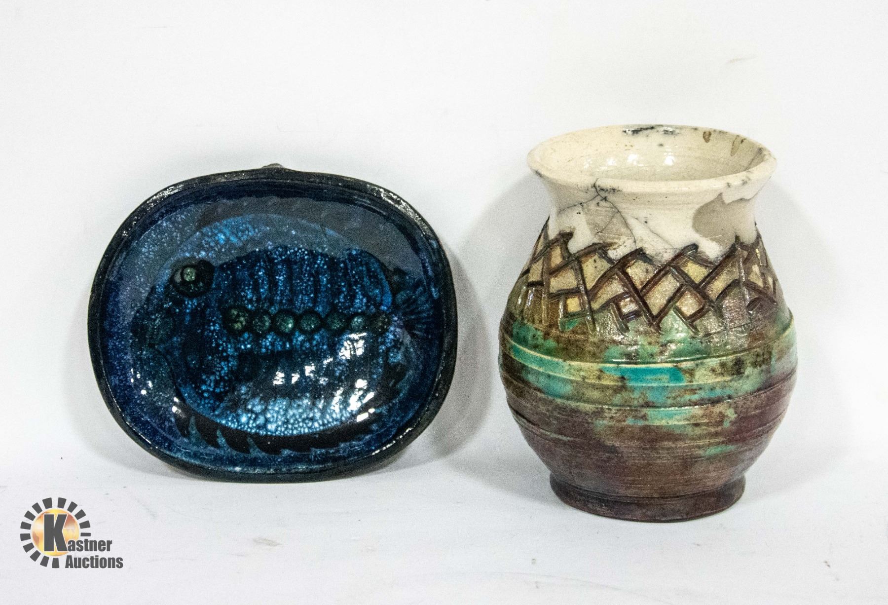 MOUNTAIN VASE BY COLETTE EVANS UK & FISH WALL HANGING PLATE BY SHAWNIGAN LAKE POTTERY BC     **ALL ITEMS MUST BE REMOVED BY 5PM SATURDAY, JULY 8ST 2023. ALL REMAINING ITEMS WILL BE SUBJECT TO A $6.00 PER DAY STORAGE CHARGE. ANY ITEMS REMAINING AFTER MONDAY, JULY 24TH, 2023 WILL BE CONSIDERED FORFEITED. NO REFUNDS WILL BE ISSUED FOR FORFEITED ITEMS. TO SCHEDULE A PICK UP APPOINTMENT CLICK HERE