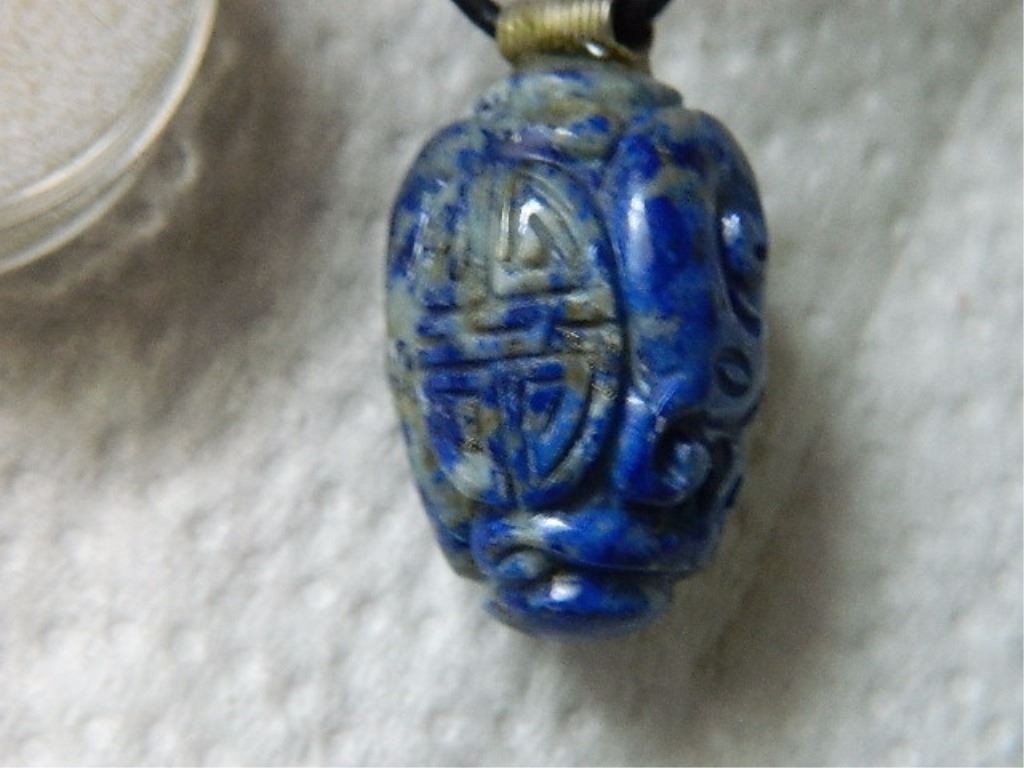 HAND CRAFTED CARVED LAPIS ON ROPE - 1 1/2" TALL X 1" DIAMETER - HAS UNIQUE SWAN CLASP/HOOK (non-ferous) not marked but probably silver