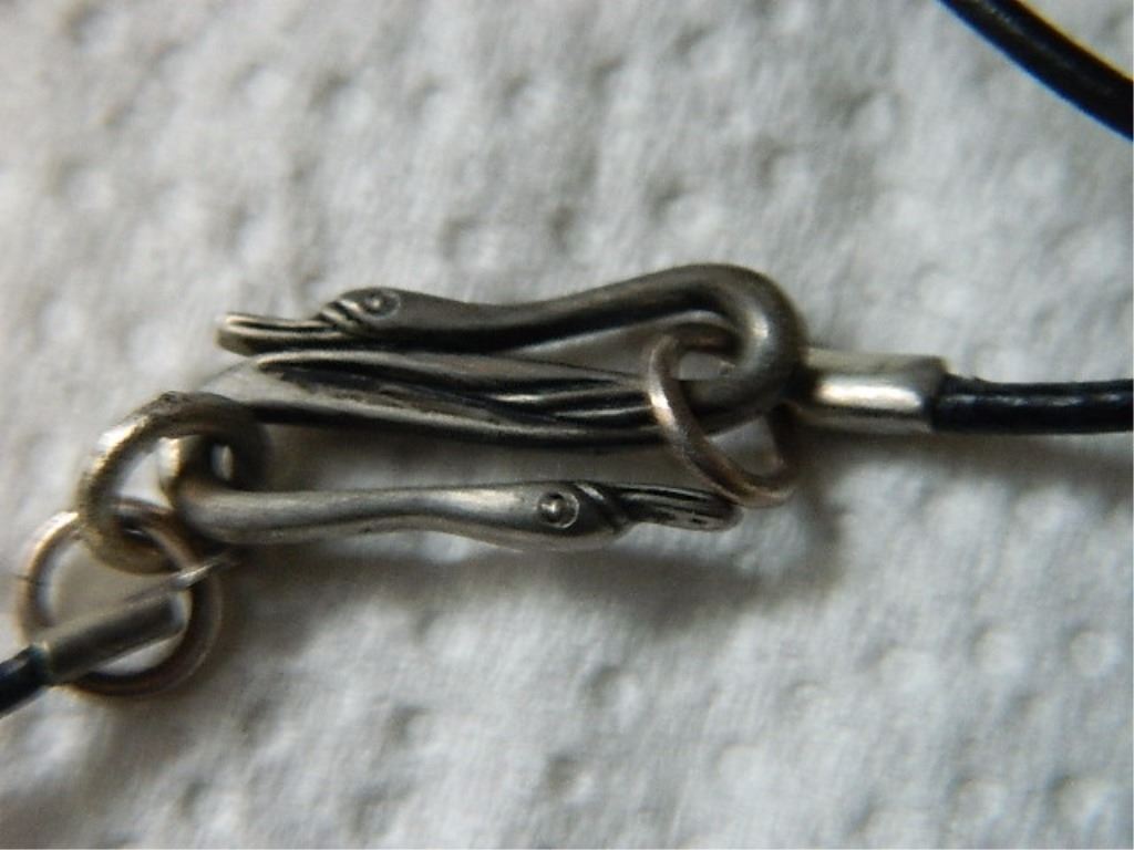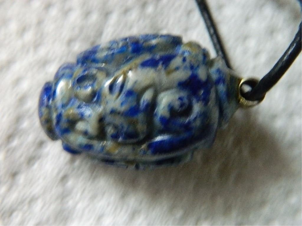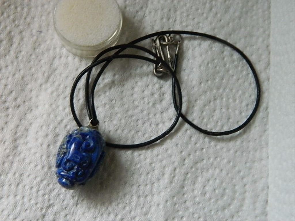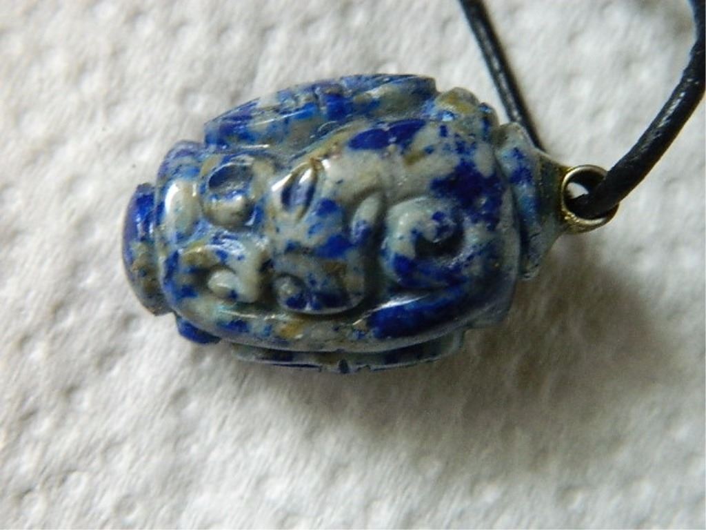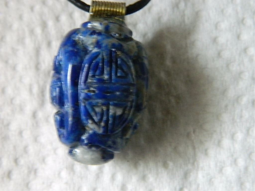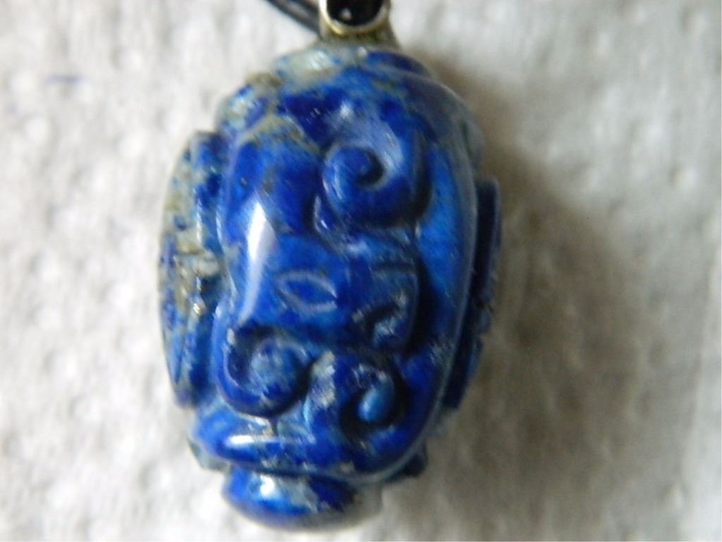 HAND CRAFTED CARVED LAPIS ON ROPE - 1 1/2" TALL X 1" DIAMETER - HAS UNIQUE SWAN CLASP/HOOK (non-ferous) not marked but probably silver