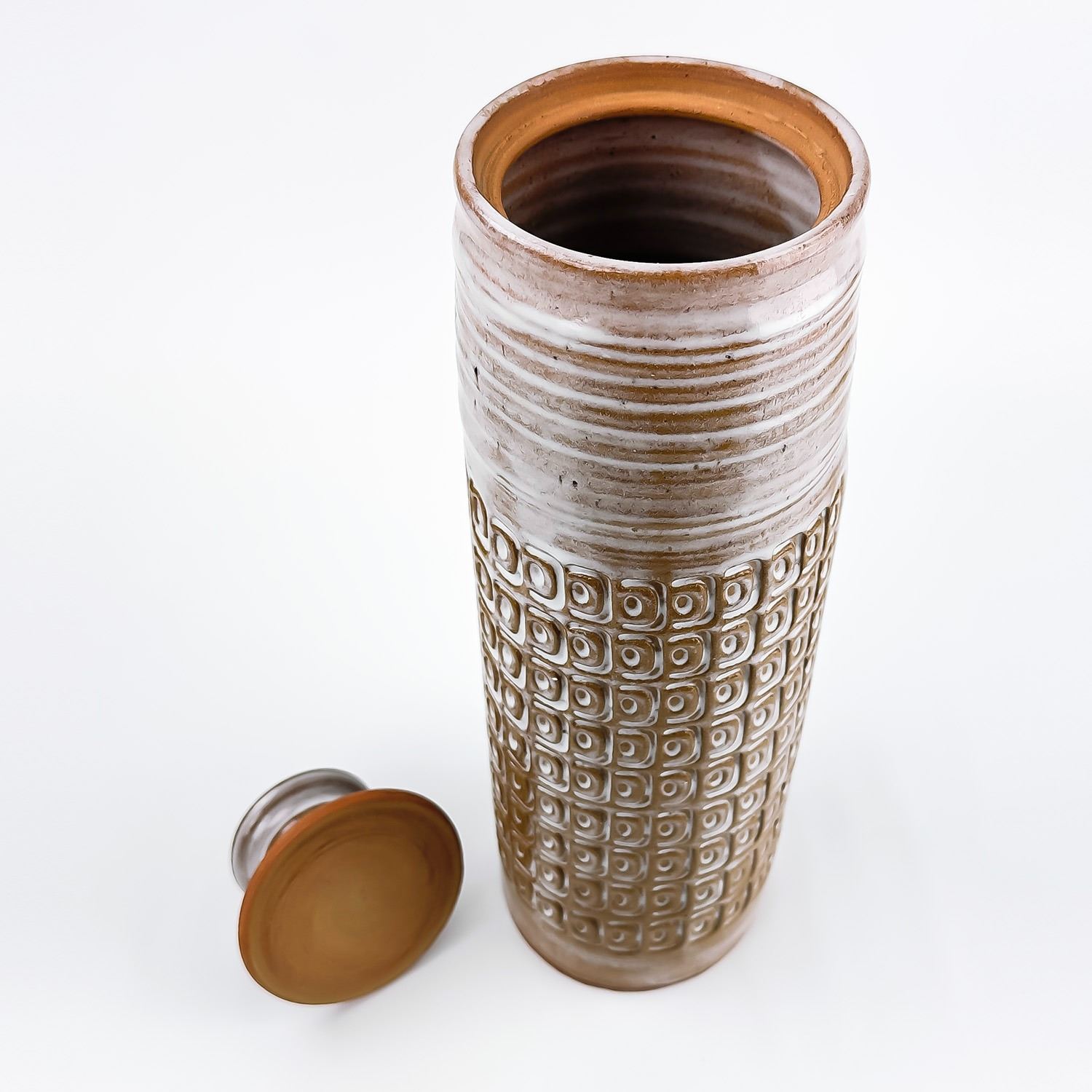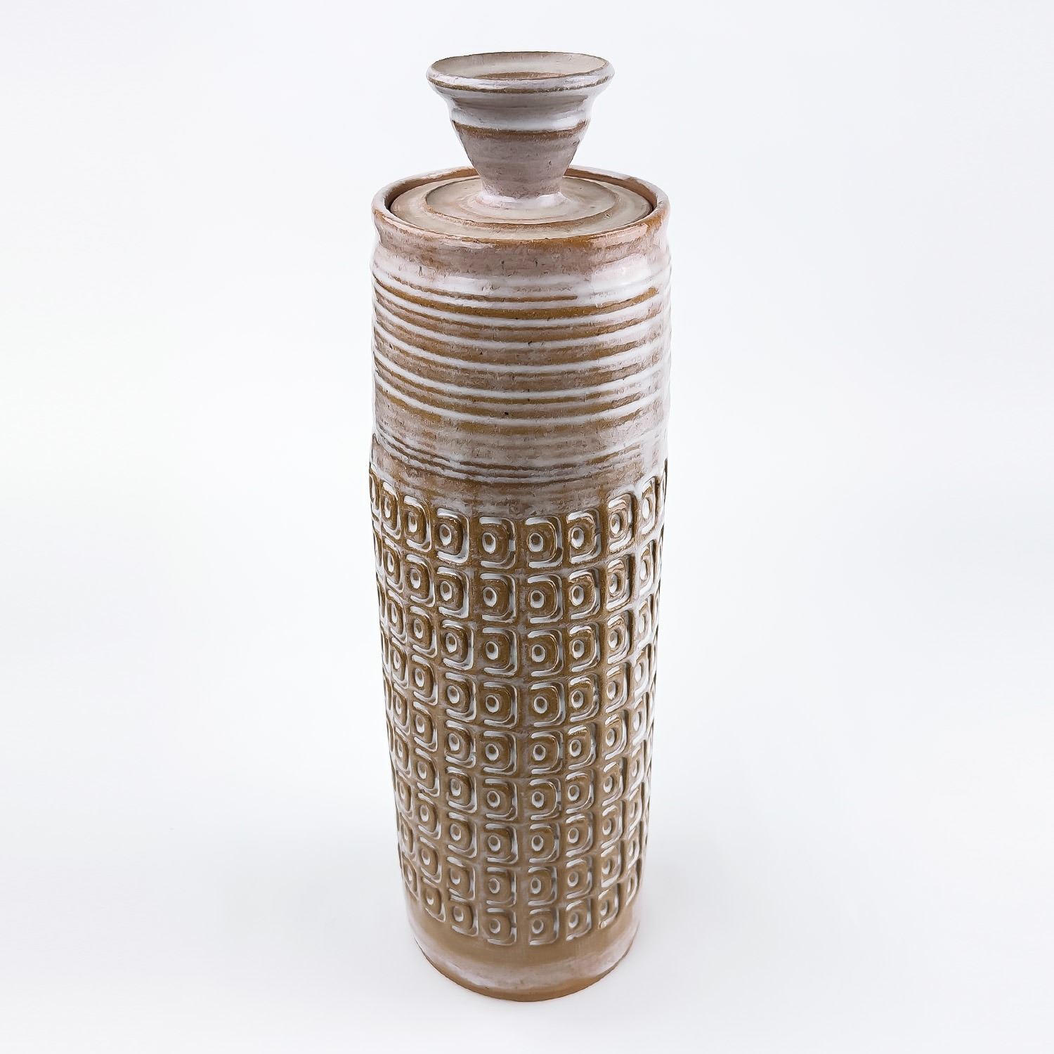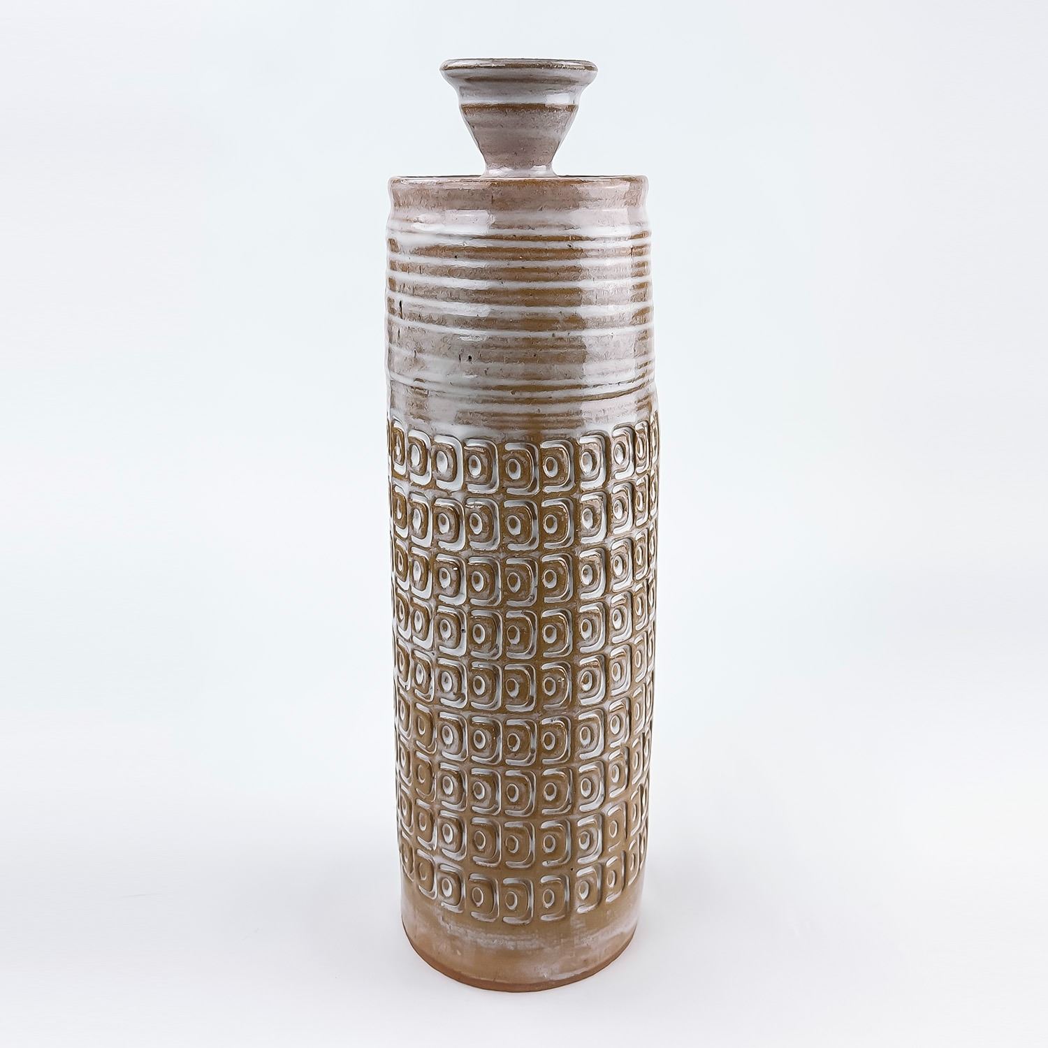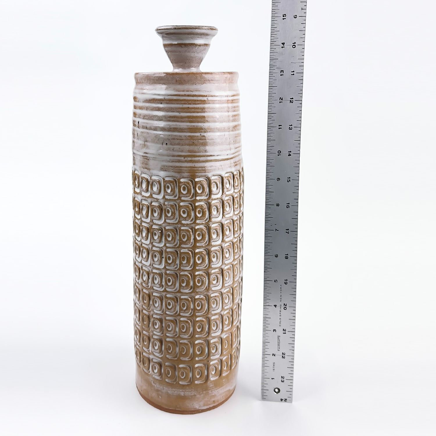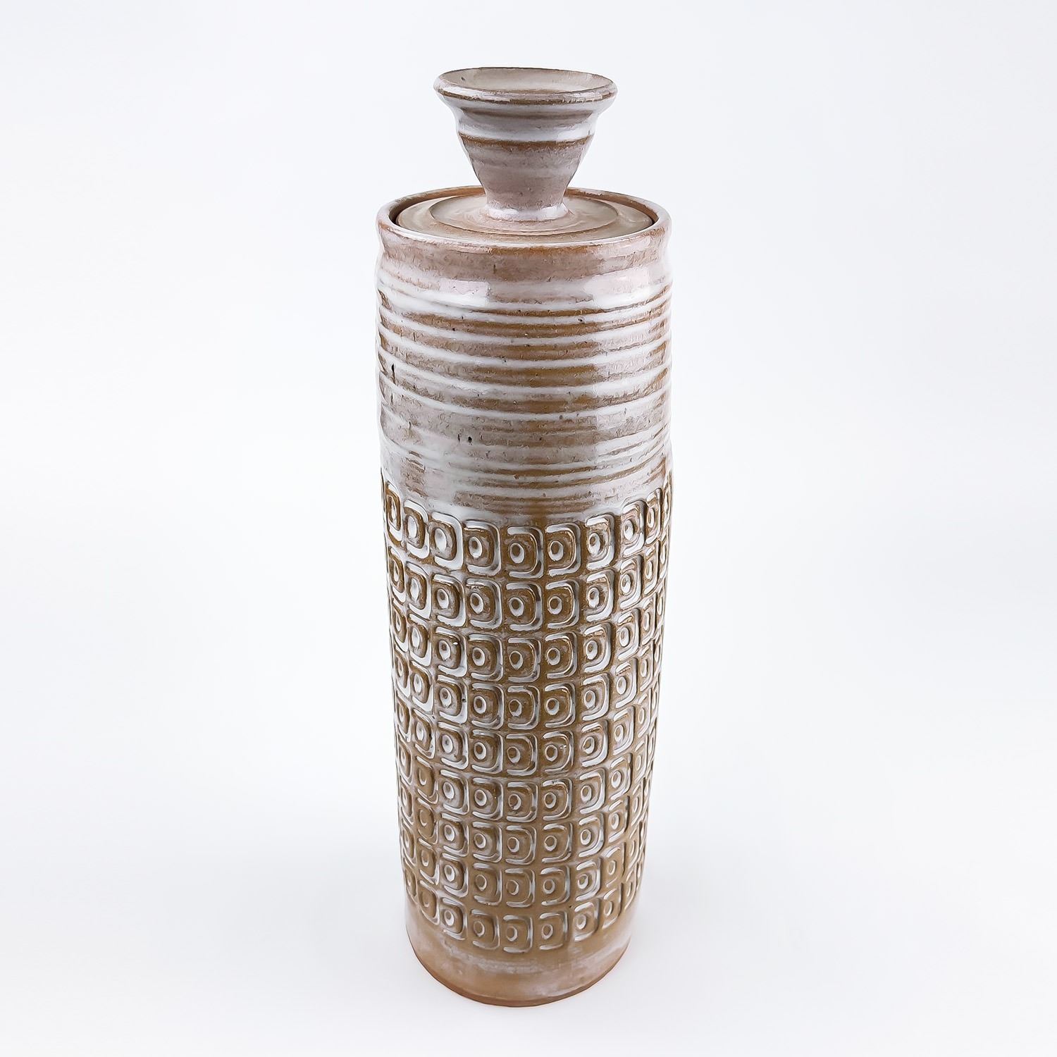 #9037 - HAND THROWN STUDIO ART STONEWARE POTTERY. TALL WHITE GLAZED ART SCULPTURE. MAKER UNKNOWN, BUT SIGNED “J” ON THE BOTTOM. STYLISH MID-CENTURY-MODERN VESSEL WITH REPEATING RELIEF DESIGN. NOT POSITIVE, BUT IT COULD BE A WEST GERMANY PIECE - MADE WITH RED TERRACOTTA TYPE CLAY. EITHER WAY, A BEAUTIFULLY CRAFTED PIECE. POSSIBLE USES: RUMTOPF (FRUIT FERMENTATION JAR), DECORATIVE STORAGE CANISTER, LIDDED VASE/GINGER JAR ETC. NO CRACKS, CHIPS OR REPAIRS. MEASURES 14.5” (37 CM) TALL WITH LID AND 4.125” (10.5 CM) BASE DIAMETER.