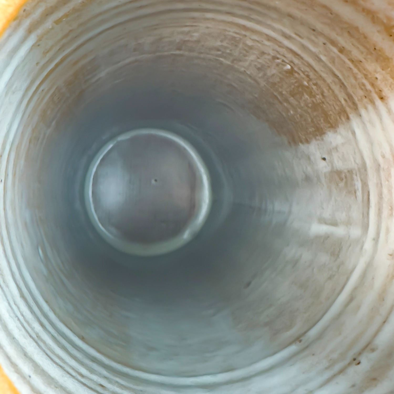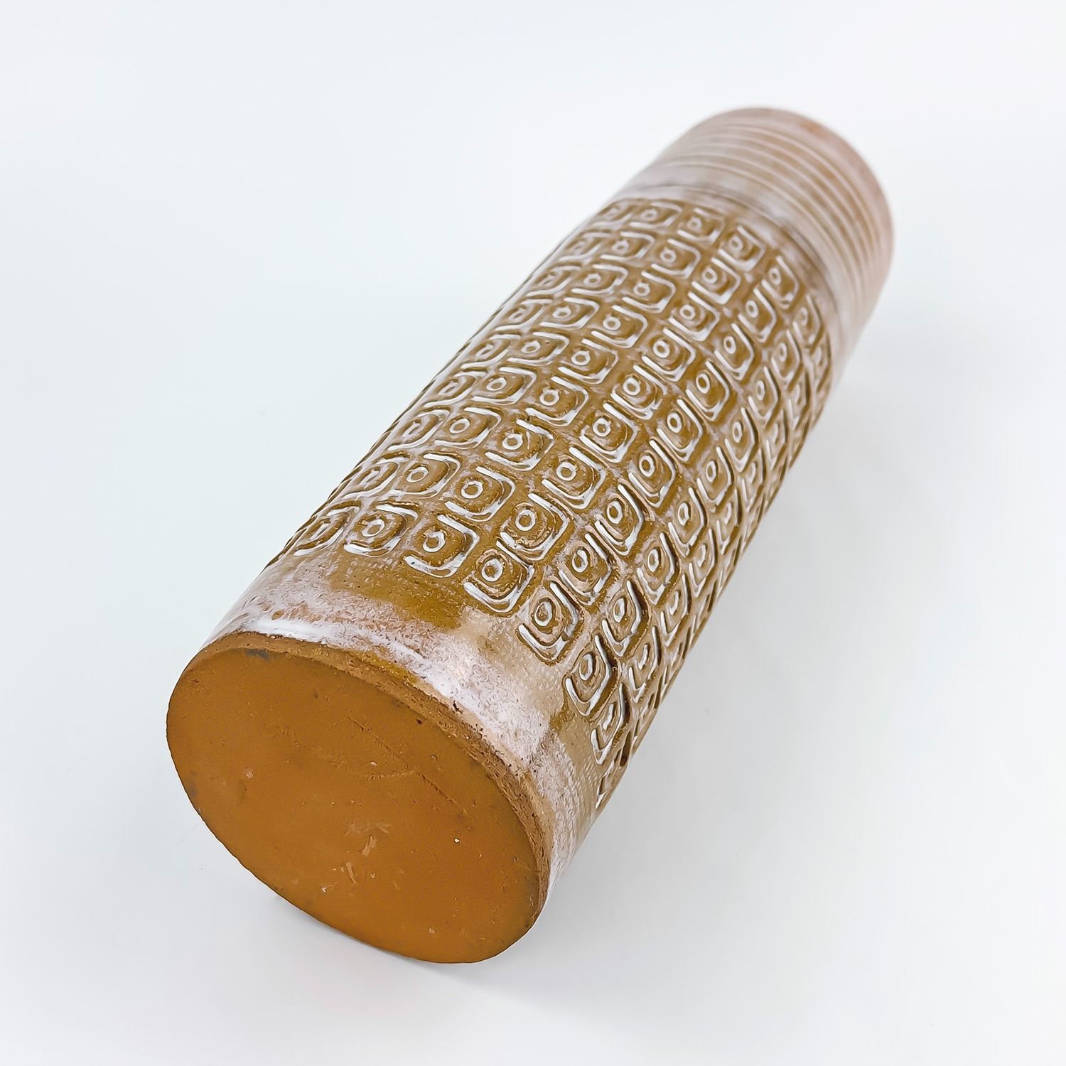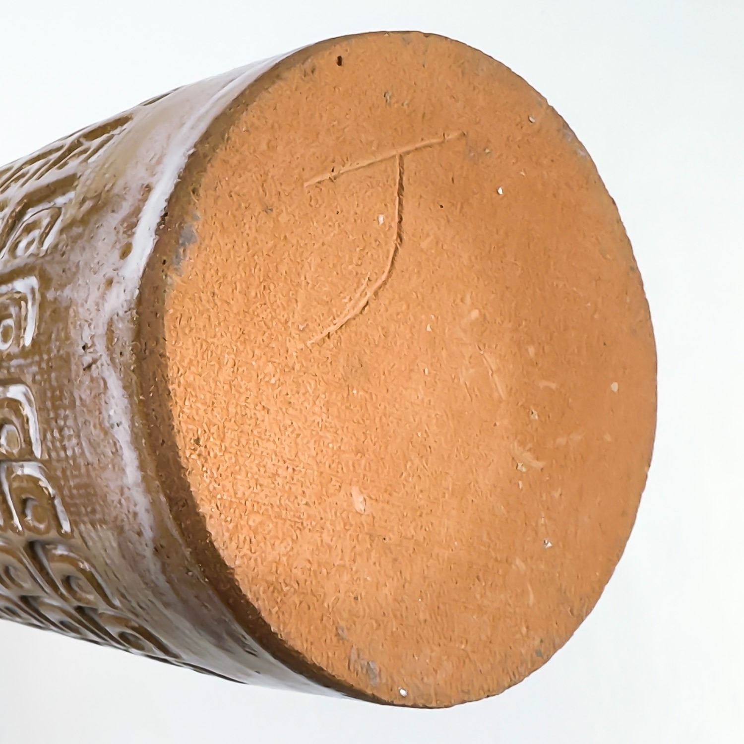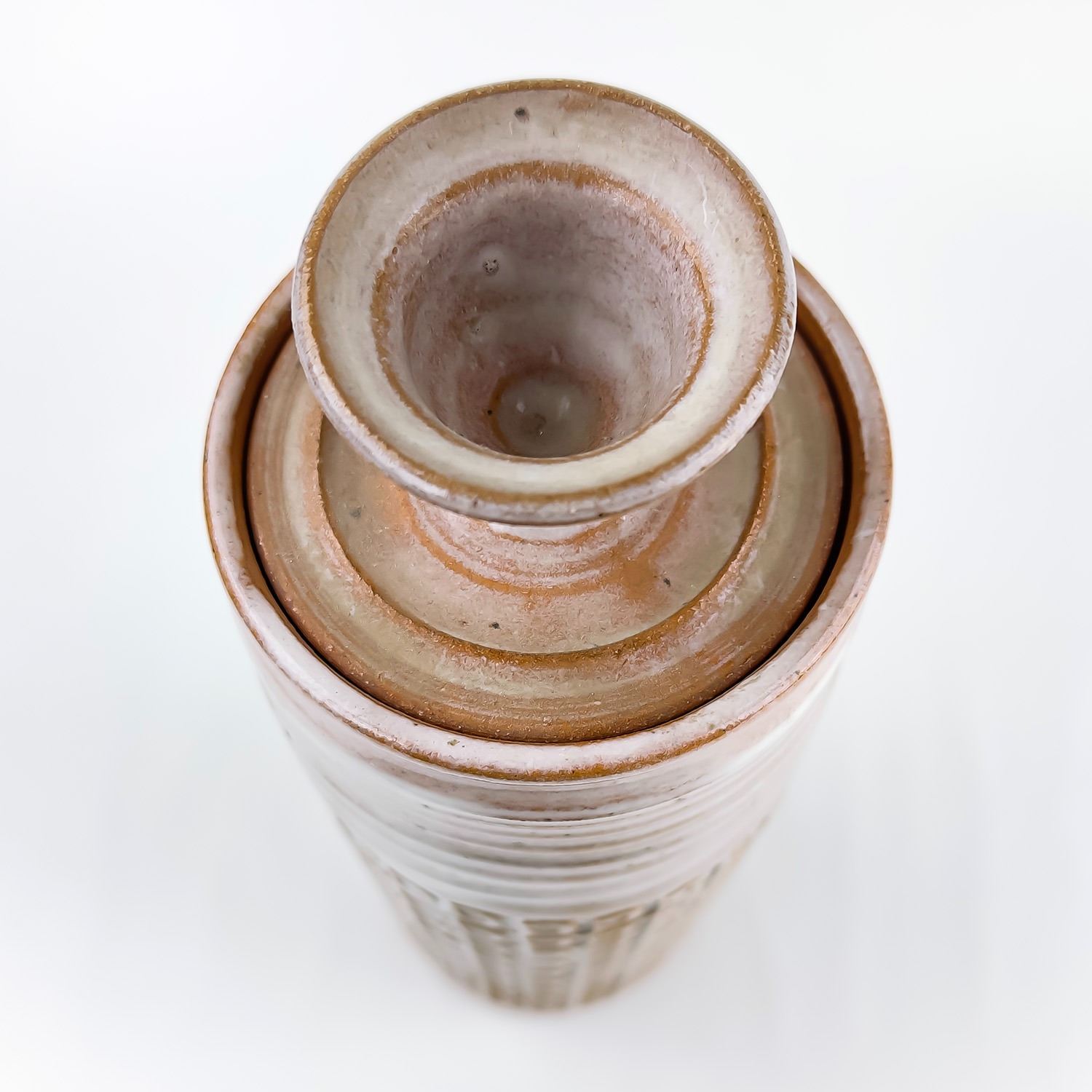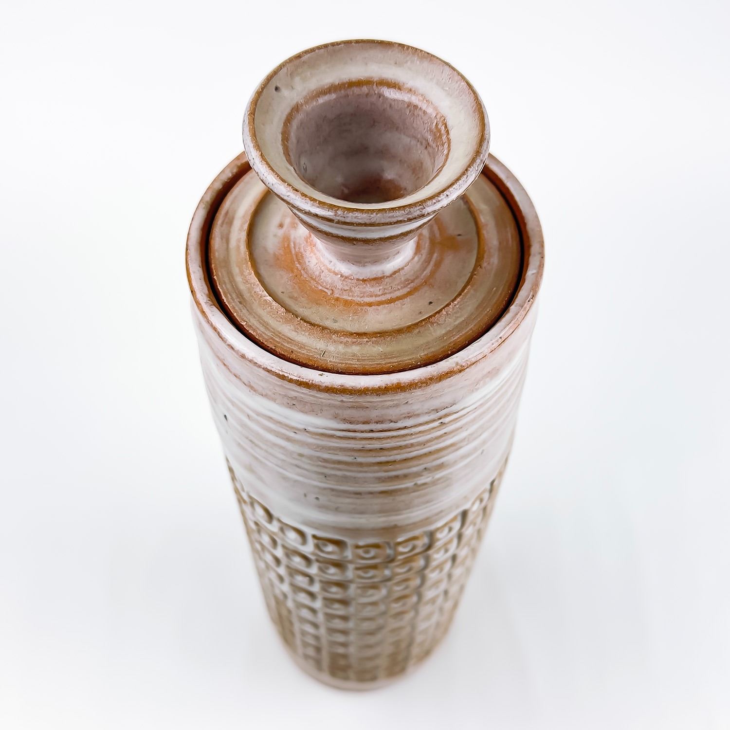 #9037 - HAND THROWN STUDIO ART STONEWARE POTTERY. TALL WHITE GLAZED ART SCULPTURE. MAKER UNKNOWN, BUT SIGNED “J” ON THE BOTTOM. STYLISH MID-CENTURY-MODERN VESSEL WITH REPEATING RELIEF DESIGN. NOT POSITIVE, BUT IT COULD BE A WEST GERMANY PIECE - MADE WITH RED TERRACOTTA TYPE CLAY. EITHER WAY, A BEAUTIFULLY CRAFTED PIECE. POSSIBLE USES: RUMTOPF (FRUIT FERMENTATION JAR), DECORATIVE STORAGE CANISTER, LIDDED VASE/GINGER JAR ETC. NO CRACKS, CHIPS OR REPAIRS. MEASURES 14.5” (37 CM) TALL WITH LID AND 4.125” (10.5 CM) BASE DIAMETER.