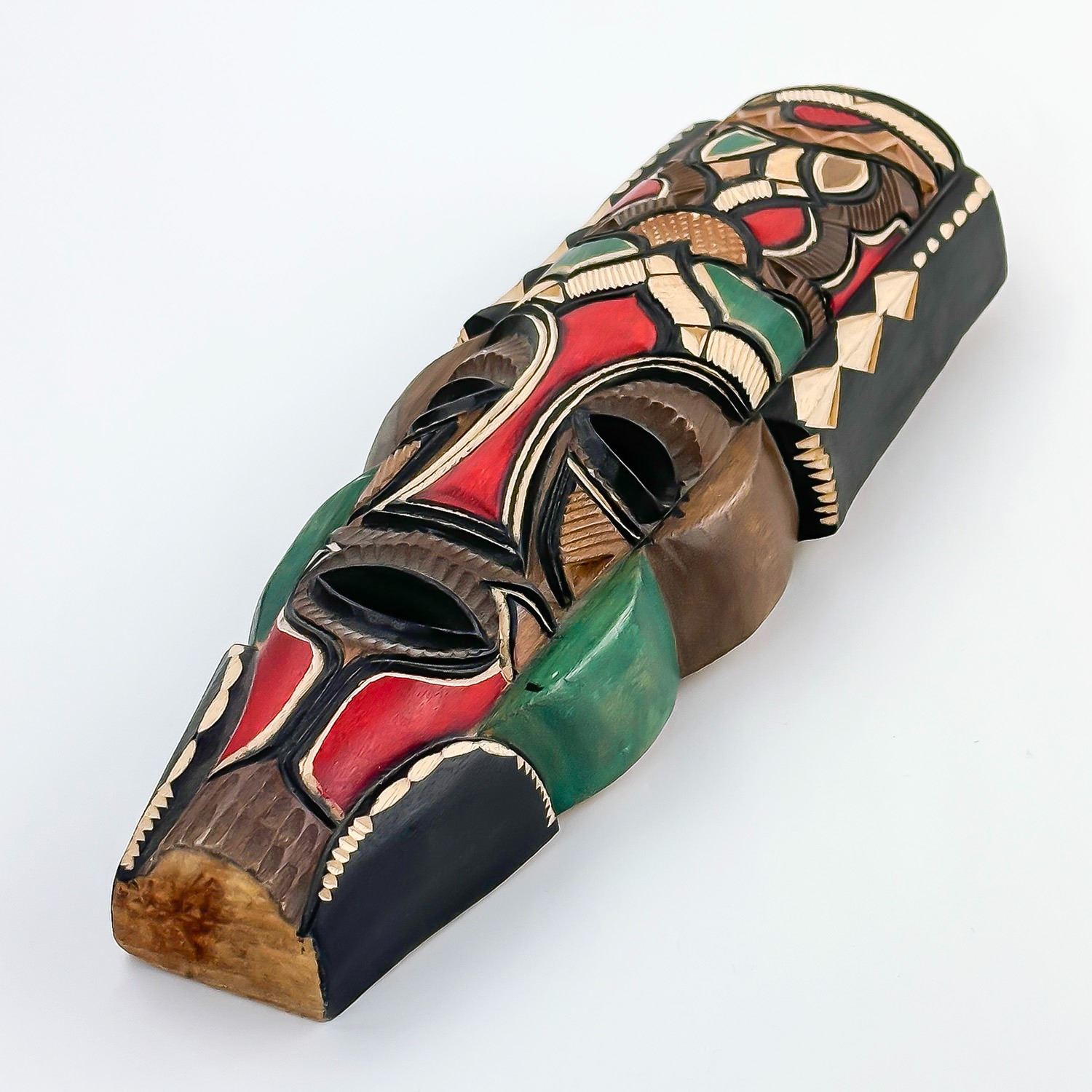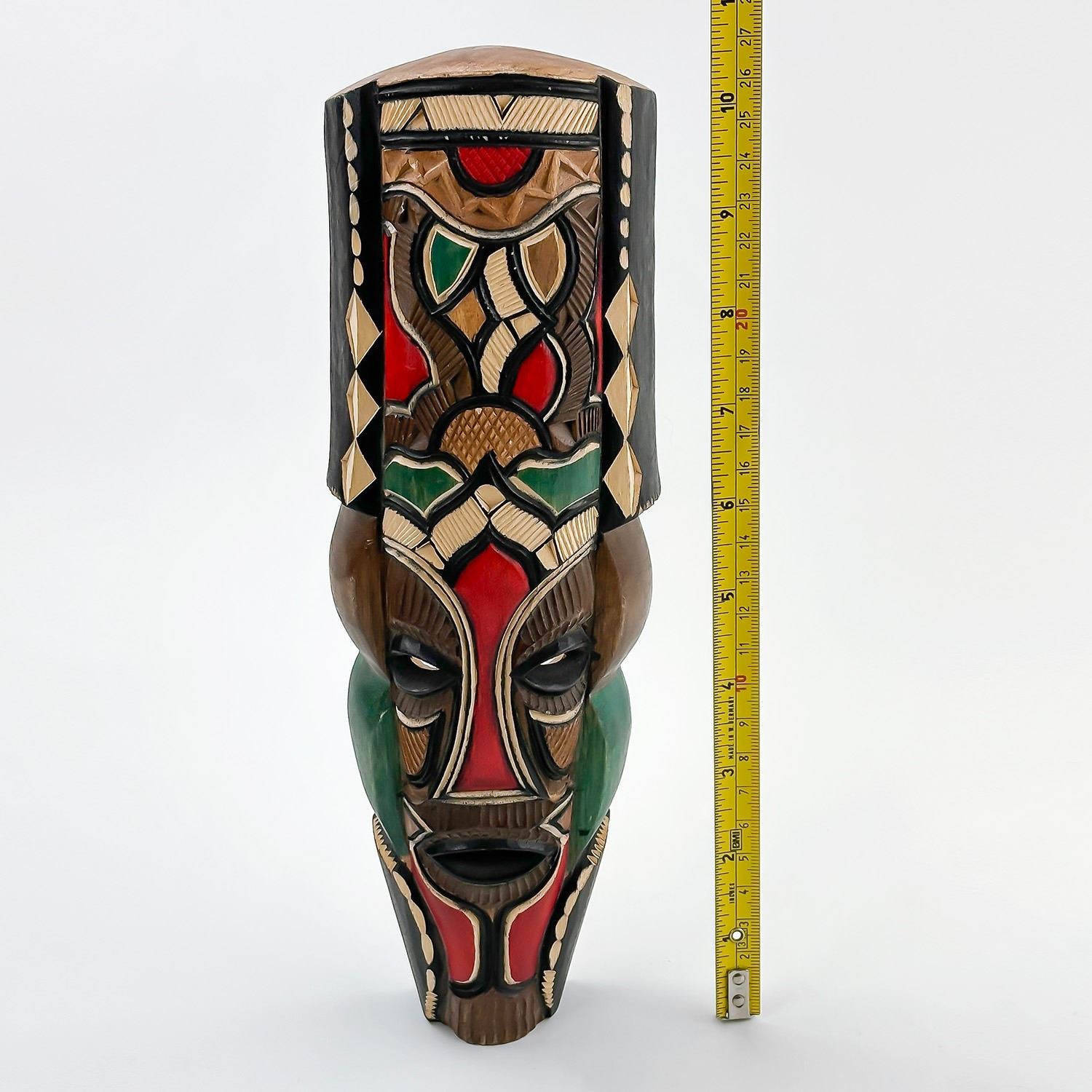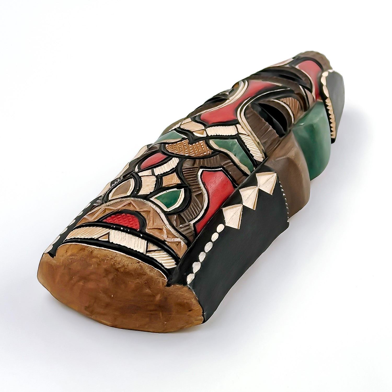 #8037 - HAND MADE COLOURFUL WOODEN MASK CARVING - AGE AND ORIGIN UNKNOWN. HOME OR OFFICE FACE FIGURE SCULPTURE WALL DECOR. MEASURES: 10.5” (27 CM) LONG BY 3.5” (9 CM) WIDE AND 2” (5 CM) DEEP
