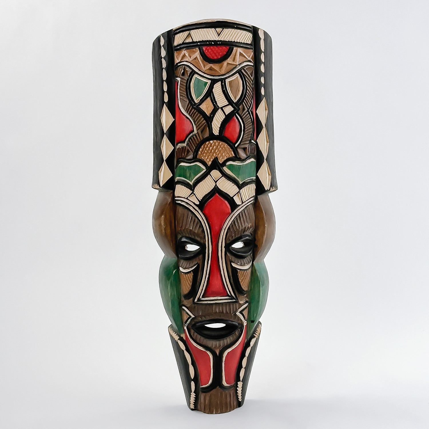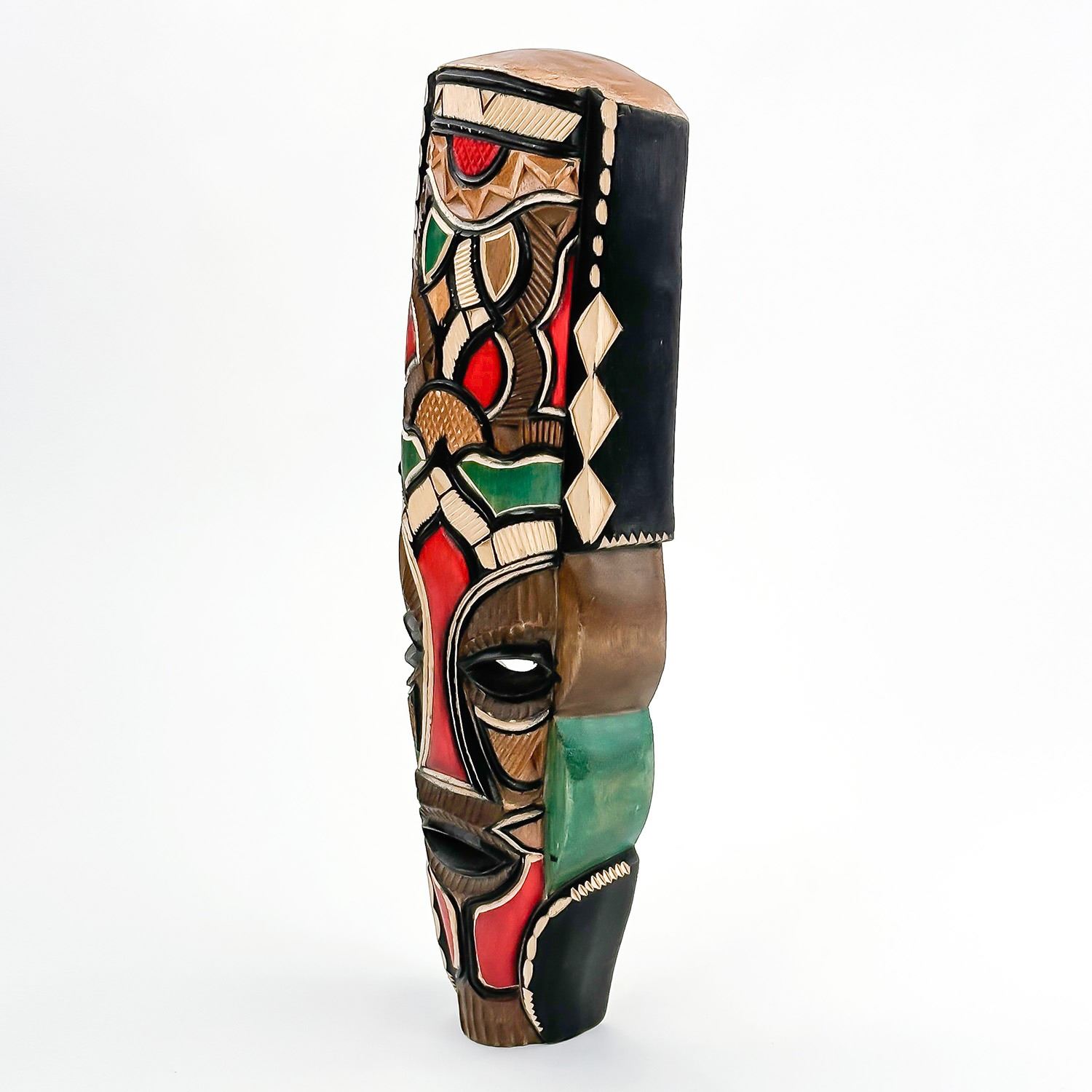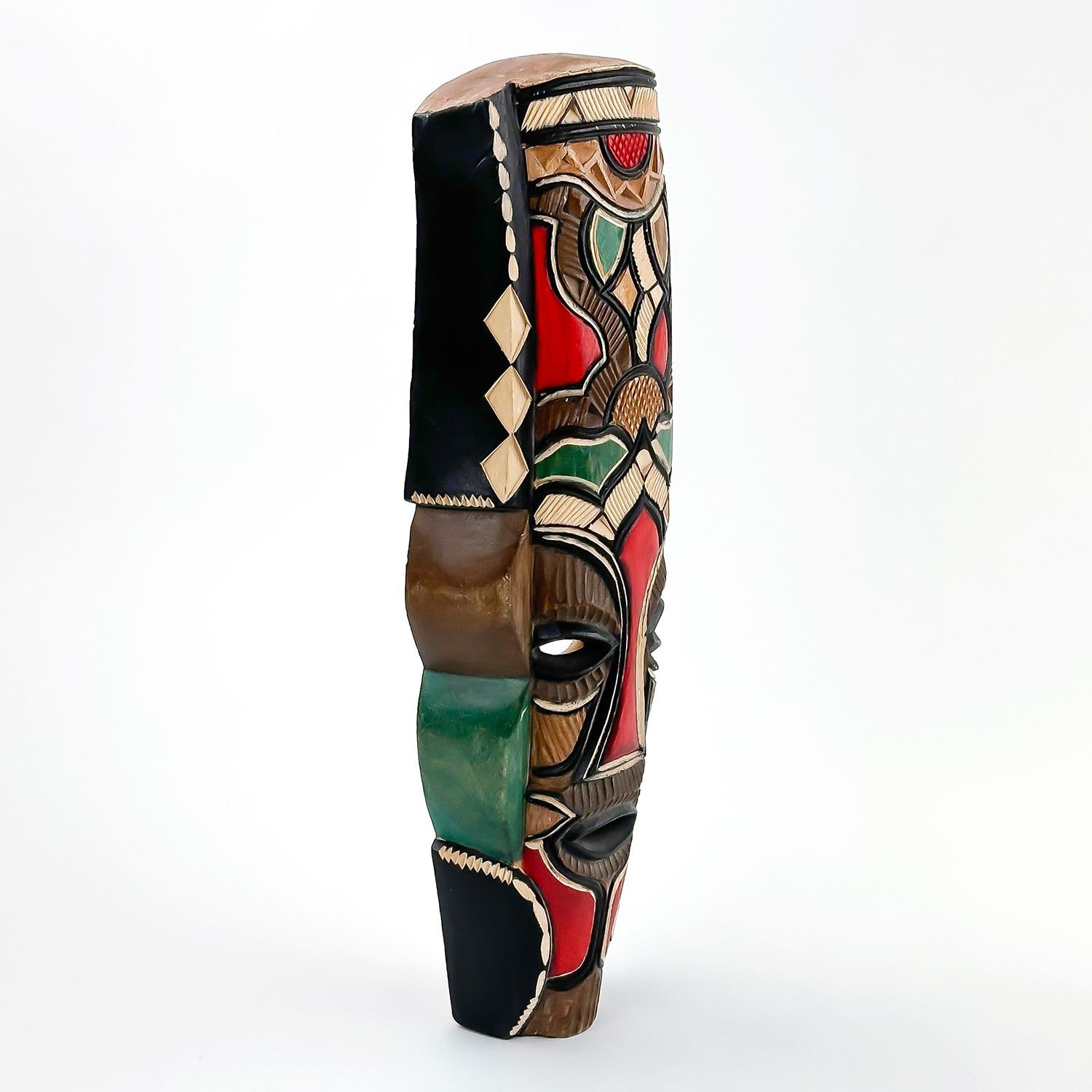#8037 - HAND MADE COLOURFUL WOODEN MASK CARVING - AGE AND ORIGIN UNKNOWN. HOME OR OFFICE FACE FIGURE SCULPTURE WALL DECOR. MEASURES: 10.5” (27 CM) LONG BY 3.5” (9 CM) WIDE AND 2” (5 CM) DEEP
