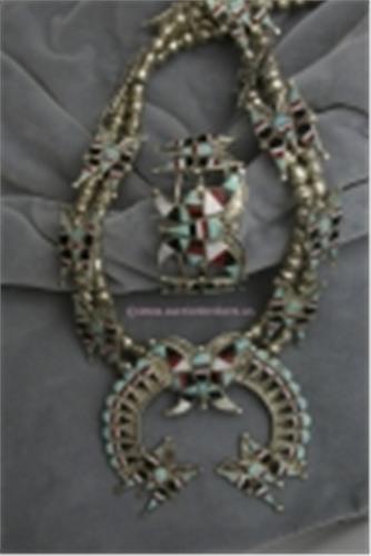 HAND CRAFTED OLD INDIAN PAWN JEWELRY SET INCLUDING A CUFF STYLE BRACELET AND A MATCHING SQUASH BLOSS