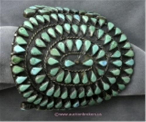 HAND CRAFTED OLD INDIAN PAWN JEWELRY SILVER TURQUOISE CLUSTER BRACELET. THIS HEAVY COLLECTORS BRACELET FEATURES 82 AUTHENTIC TURQUOISE STONES SET IN A BEAUTIFUL CLUSTER BRACELET AND MASTERFUL SILVERWORK. THIS PIECE HAS NO DISTINGUISHABLE MARKINGS. IT IS ESTIMATED THAT THIS PIECE WAS MADE PRIOR TO 1970. 15 GRAMS.