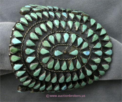 HAND CRAFTED OLD INDIAN PAWN JEWELRY SILVER TURQUOISE CLUSTER BRACELET. THIS HEAVY COLLECTORS BRACELET FEATURES 82 AUTHENTIC TURQUOISE STONES SET IN A BEAUTIFUL CLUSTER BRACELET AND MASTERFUL SILVERWORK. THIS PIECE HAS NO DISTINGUISHABLE MARKINGS. IT IS ESTIMATED THAT THIS PIECE WAS MADE PRIOR TO 1970. 15 GRAMS.