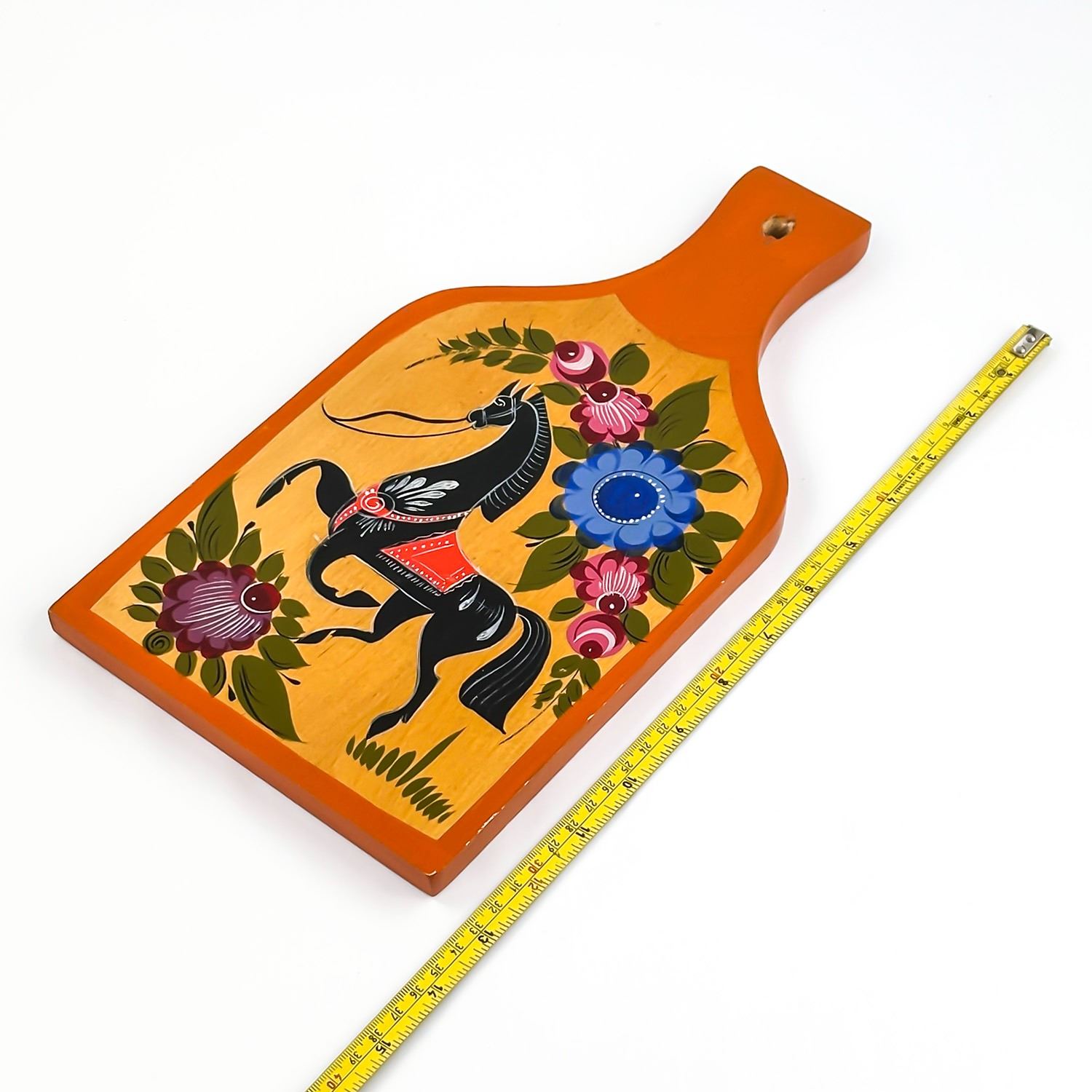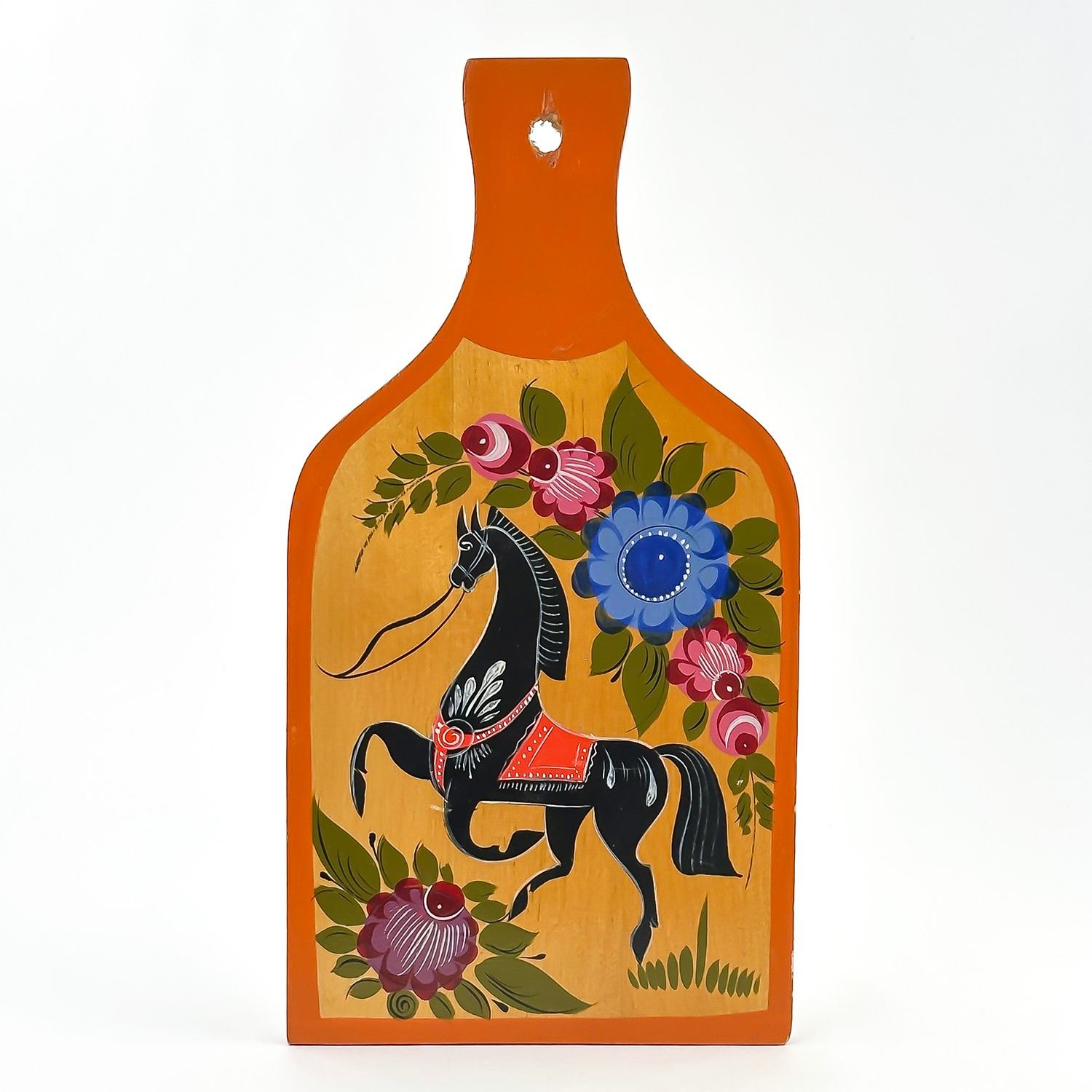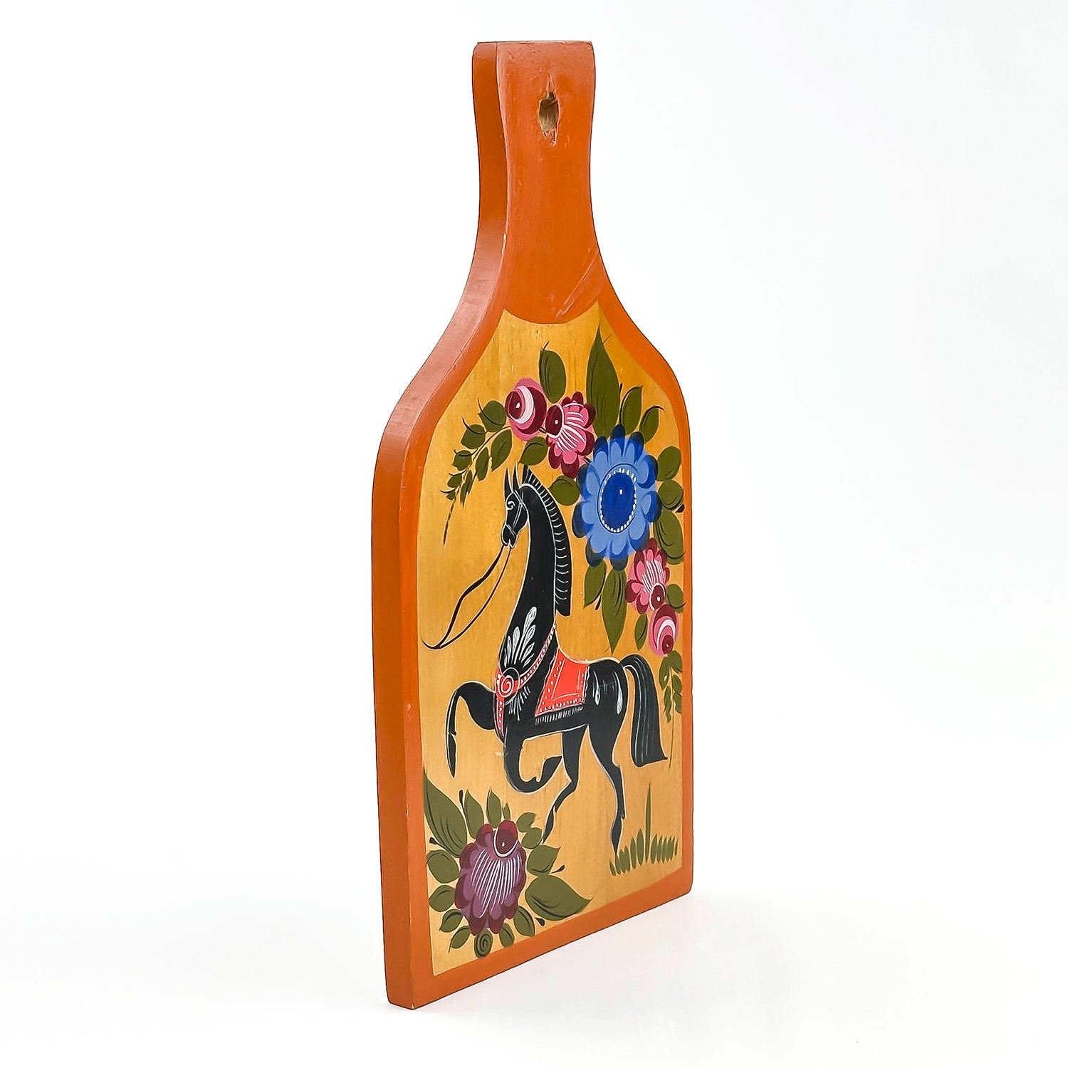 #8693 - FOLK ART STYLE DECORATIVE CUTTING BOARD - PAINTING OF FLOWERS AND HORSE. KITCHEN BOARD OR WOODEN WALL PLAQUE DECOR. MEASURES: 6.75” (17 CM) WIDE BY 13” (33 CM) LONG