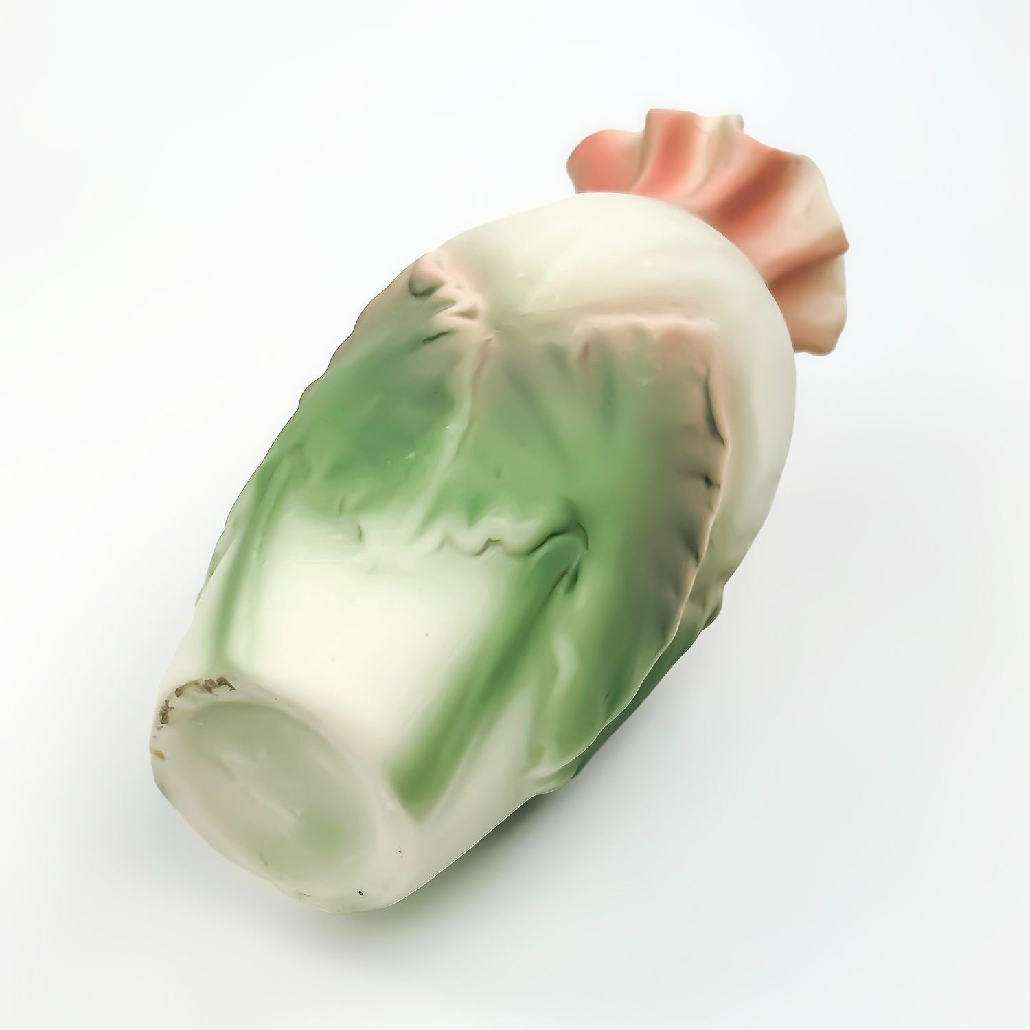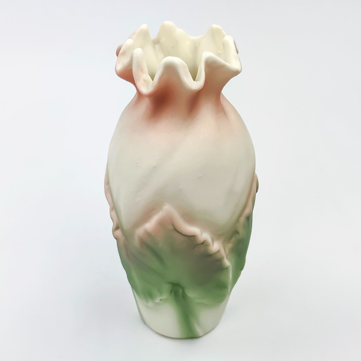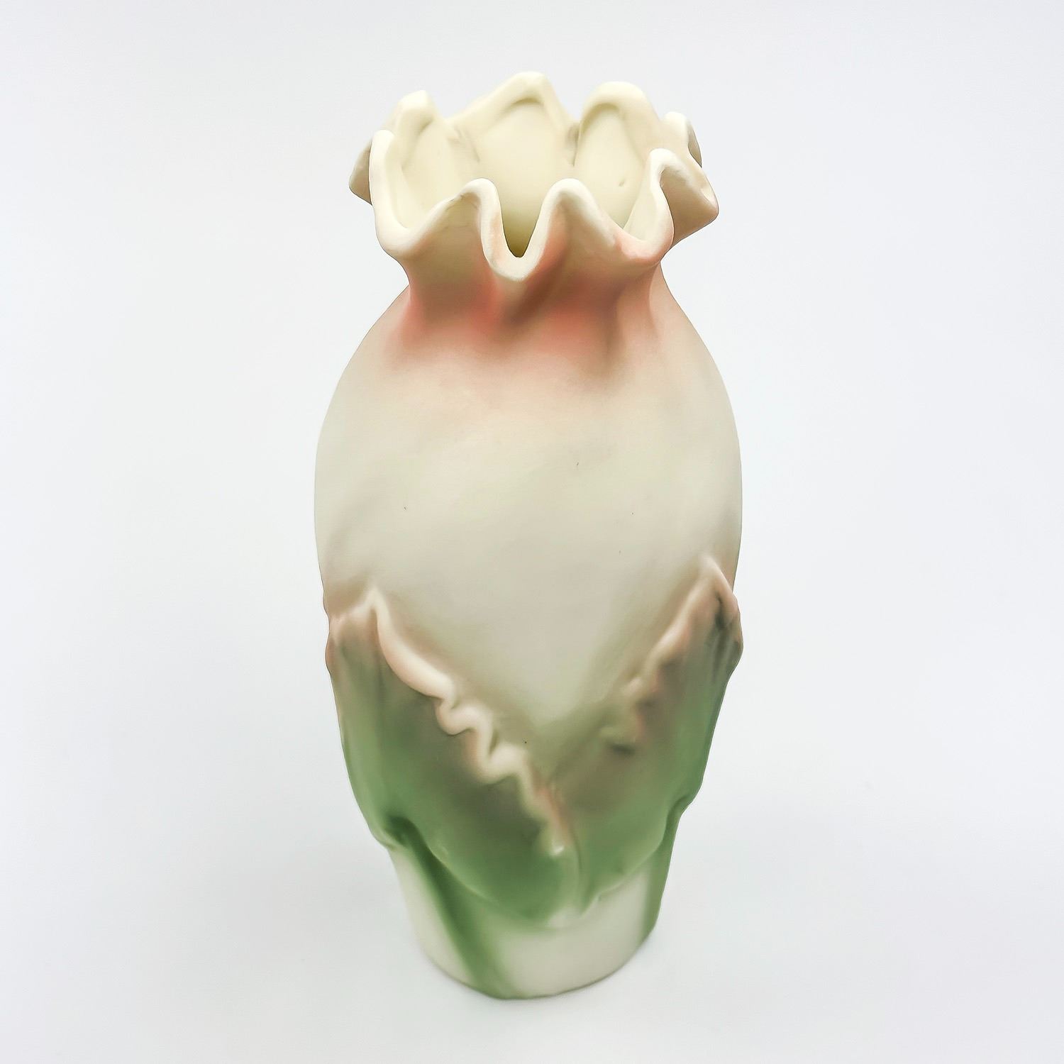 #8861 - UNMARKED PASTEL COLORED MATTE VASE. LEAF THEME AND RUFLED TOP. SMALL BUD VASE MEASURES: 6.25” (16 CM) TALL BY 3” (7.5 CM) WIDEST DIAMETER***ITEM(S) LOCATED IN LETHBRIDGE ALBERTA. FREE TRANSPORT TO EDMONTON OFFICE AVAILABLE FOR THIS AUCTION. WORLDWIDE SHIPPING IS AVAILABLE FOR ALL ITEMS