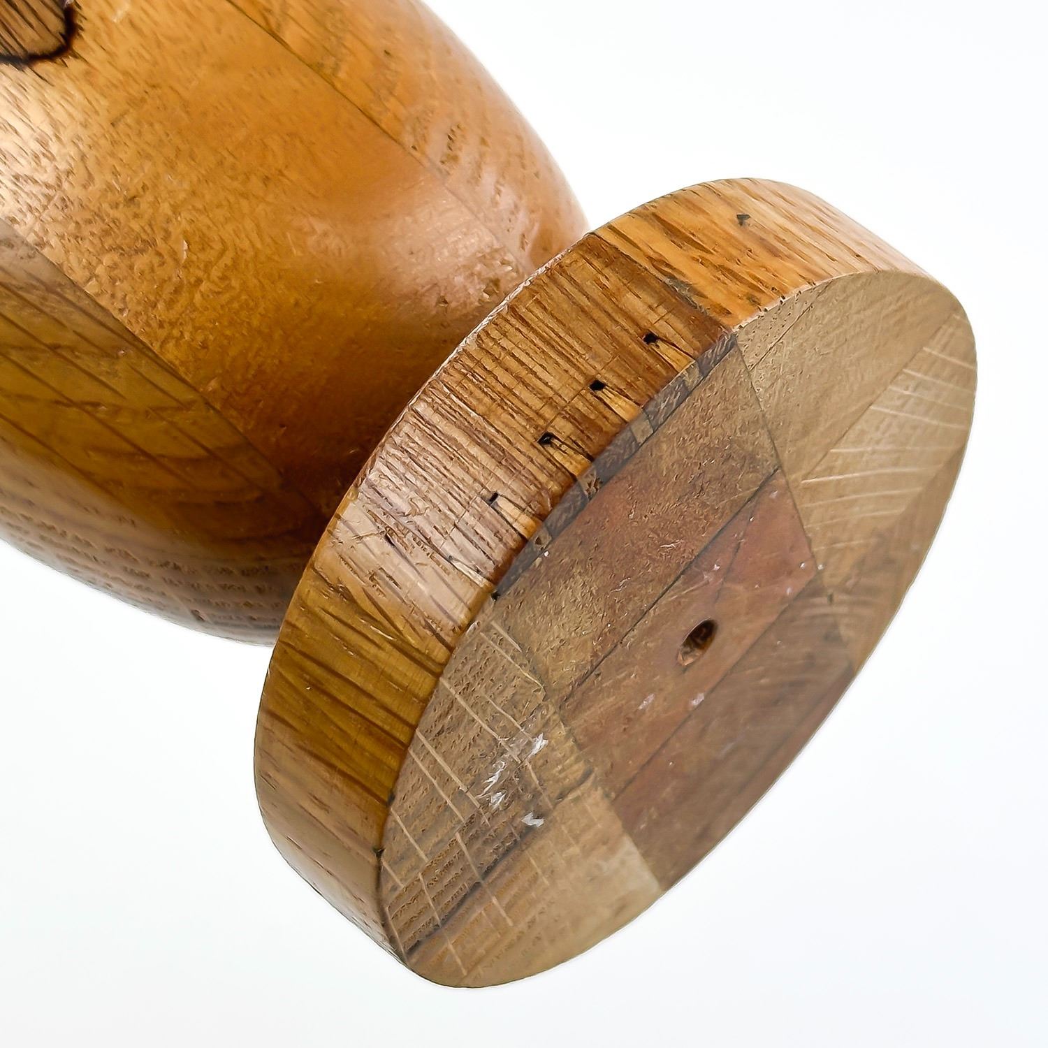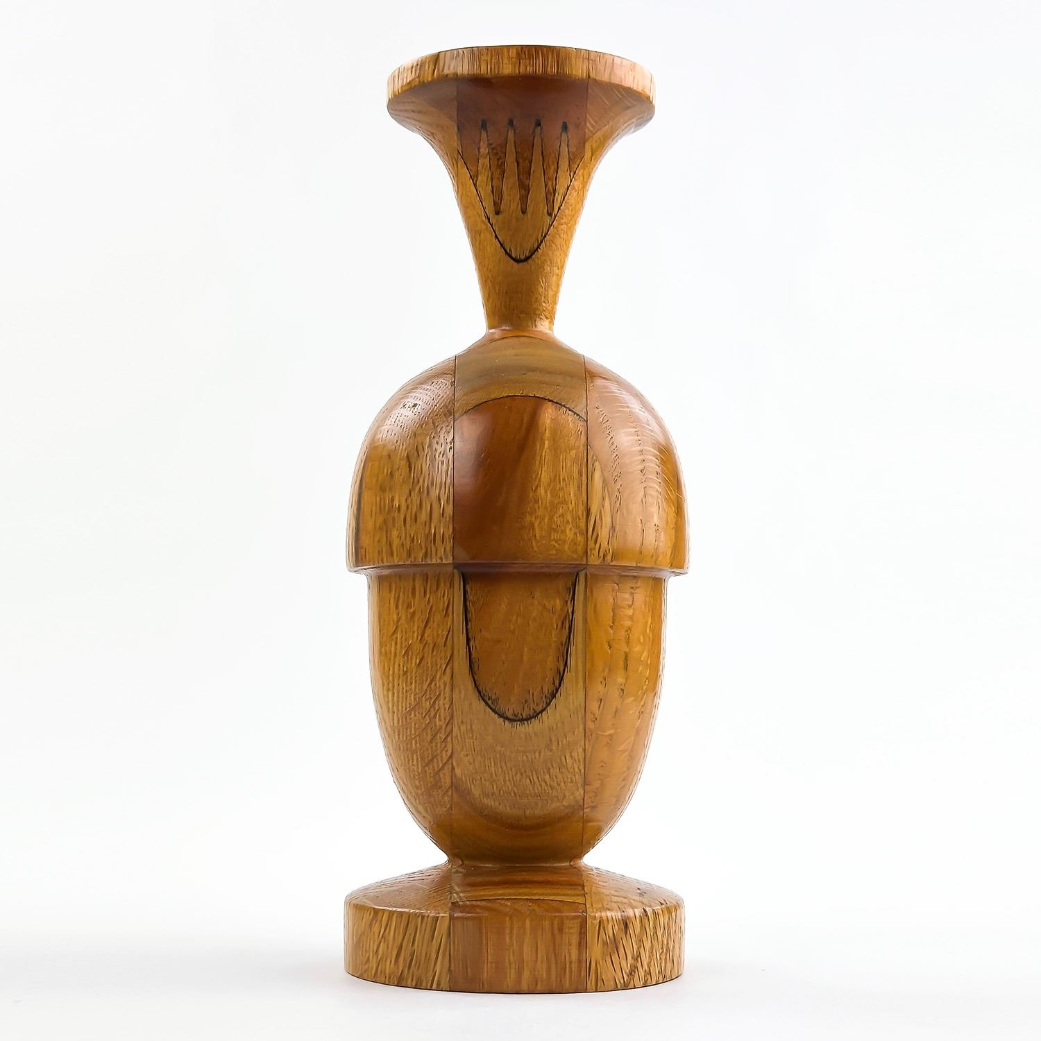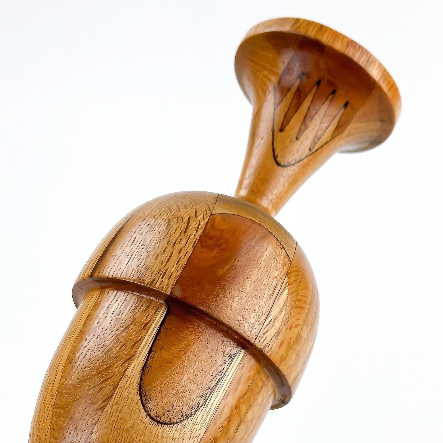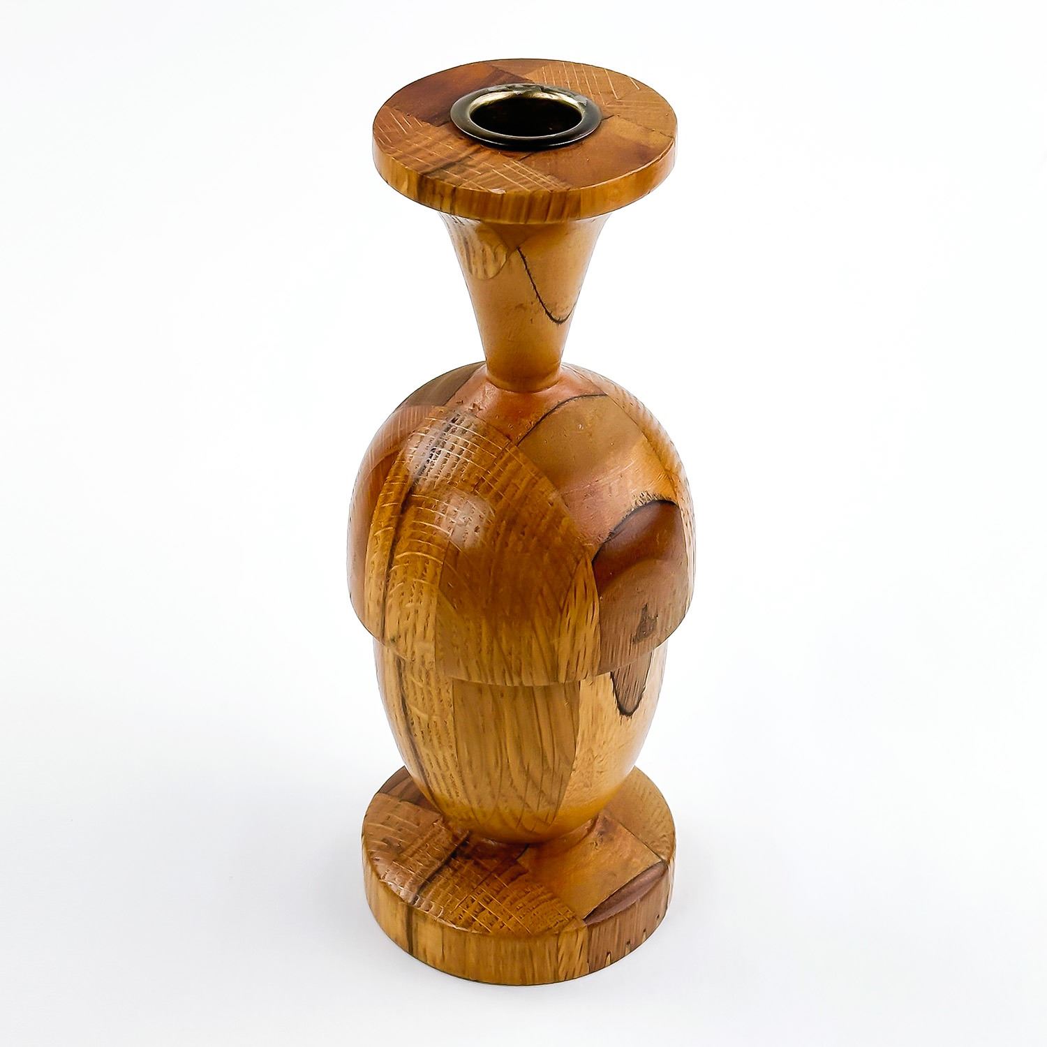#8013 - HAND TURNED WOODEN CANDLE STICK SCULPTURE. UNMARKED - AGE AND MAKER UNKNOWN. BEAUTIFULLY CRAFTED PIECE - APPEARS TO BE MADE FROM VARIOUS TYPES OF WOOD. HOME, OFFICE OR BAR DECOR. MEASURES: 8.25” (21 CM) TALL BY 3.125” (8 CM) DIAMETER BASE