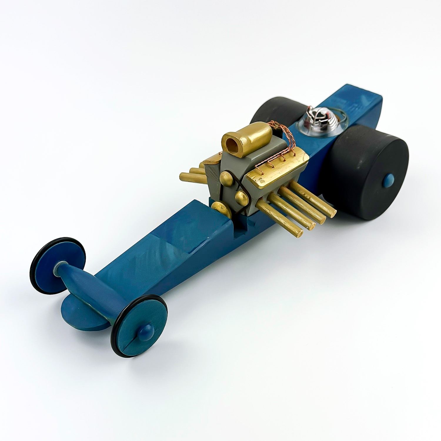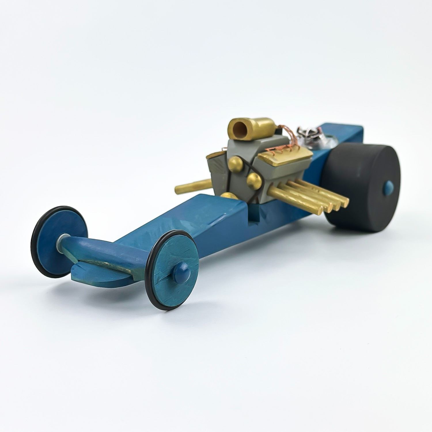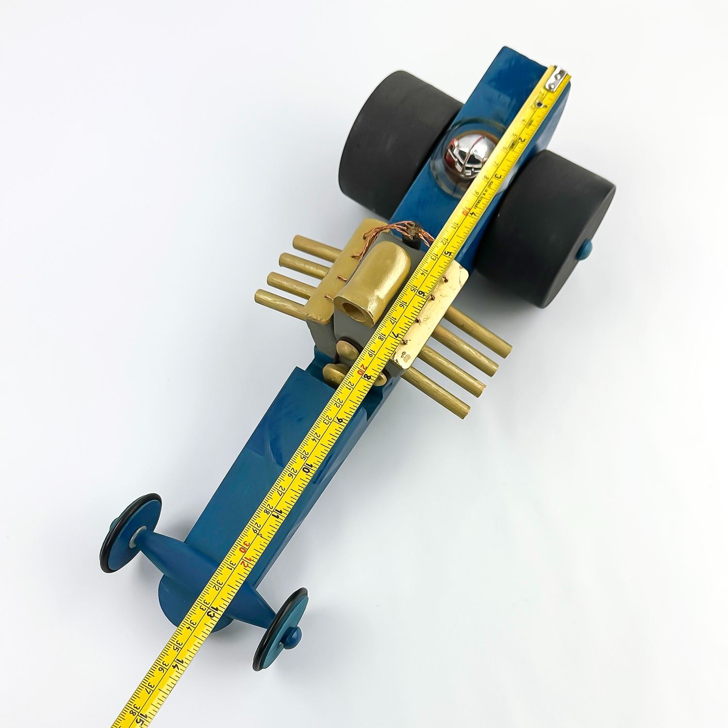 #8005 - VINTAGE HAND CRAFTED CARVED WOOD DRAG RACER DRAGSTER CAR - PUSH THE TOY AND THE WHEELS ROLL. MEASURES” 13.5” (34 CM) LONG BY 5.25” (13.5 CM) WIDE AT BACK WHEELS