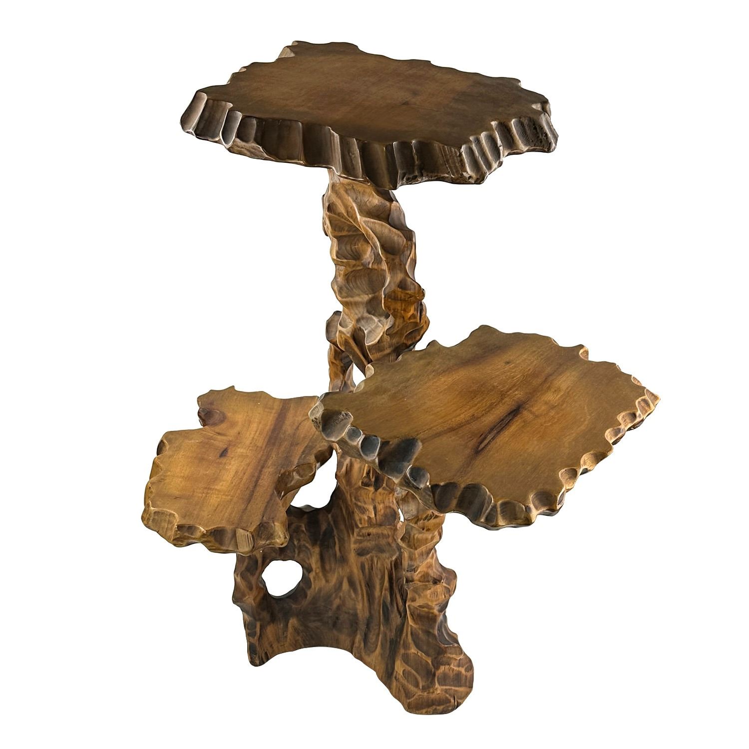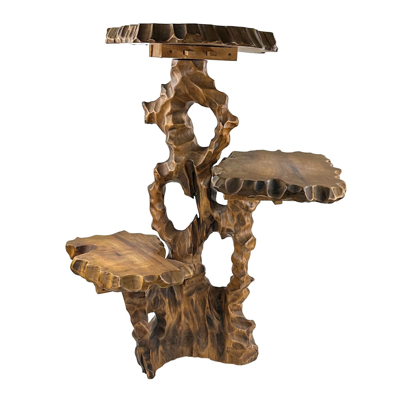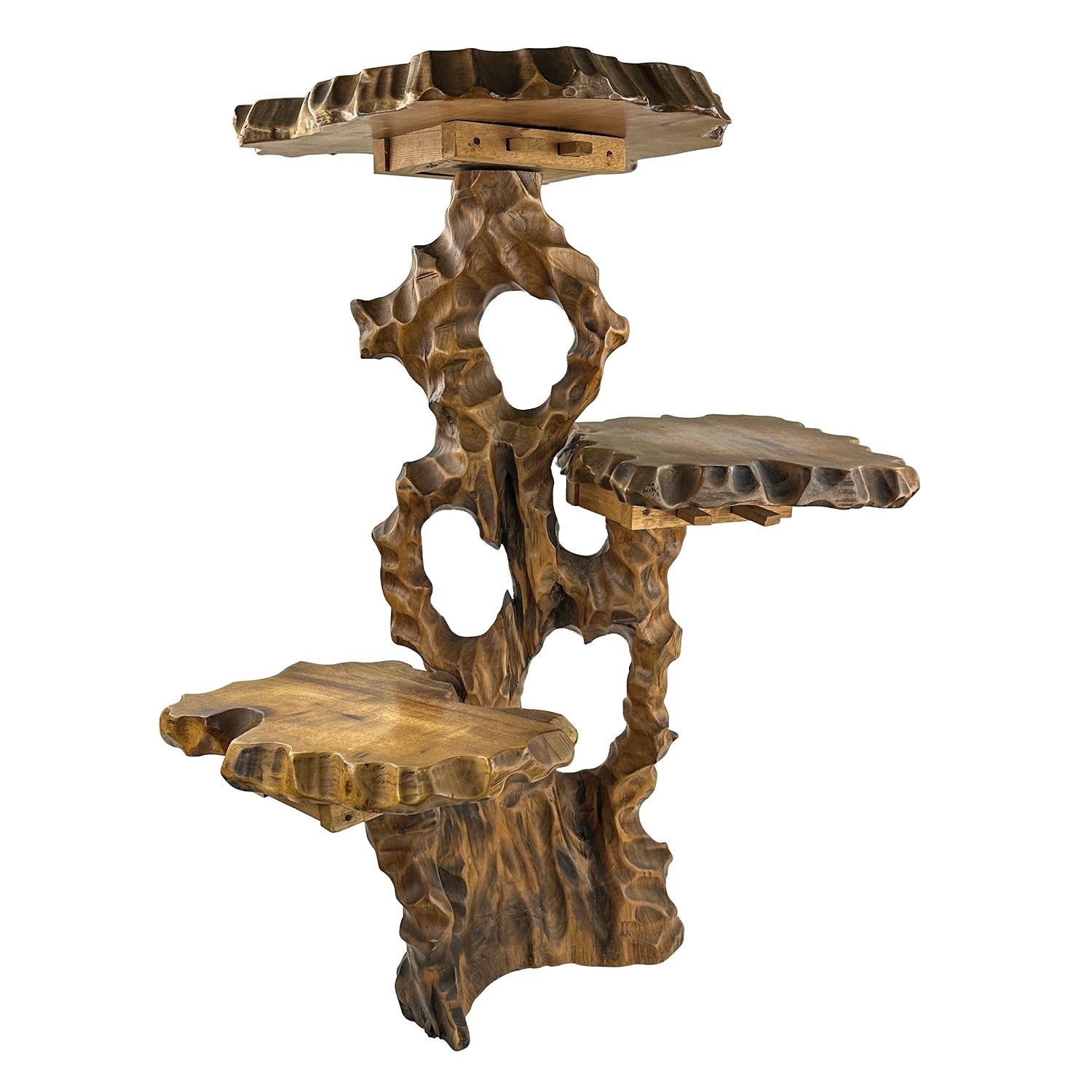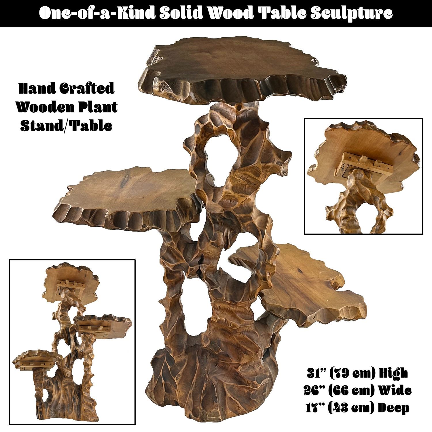 #8003 - ONE-OF-A-KIND SOLID WOOD TABLE OR PLANT STAND SCULPTURE. A VERY UNIQUELY CARVED, MID CENTURY BRUTALIST STYLE 3-TIER CARVED WOODEN TABLE. MAIN STAND PORTION IS ALL ONE PIECE OF WOOD, WITH THE 3 TABLE TOPS BEING ATTACHED WITH WOODEN PEG PINS. HOME OR OFFICE DECOR TABLE SCULPTURE FOR YOUR FLOWER VASES, PLANTS, BONSAI OR TRINKET FIGURINES. MEASURES: 31” (79 CM) HIGH BY 26” (66 CM) WIDEST WIDTH AND 17” (43 CM) DEEP. THE TABLES MEASURE ROUGHLY - TOP: 15” (38 CM) BY 14” (36 CM) - MIDDLE: 13” (33 CM) BY 11.5” (29 CM) - BOTTOM: 14” (35.5 CM) BY 9” (23 CM) AND ALL ARE 1.5” (4 CM) THICK