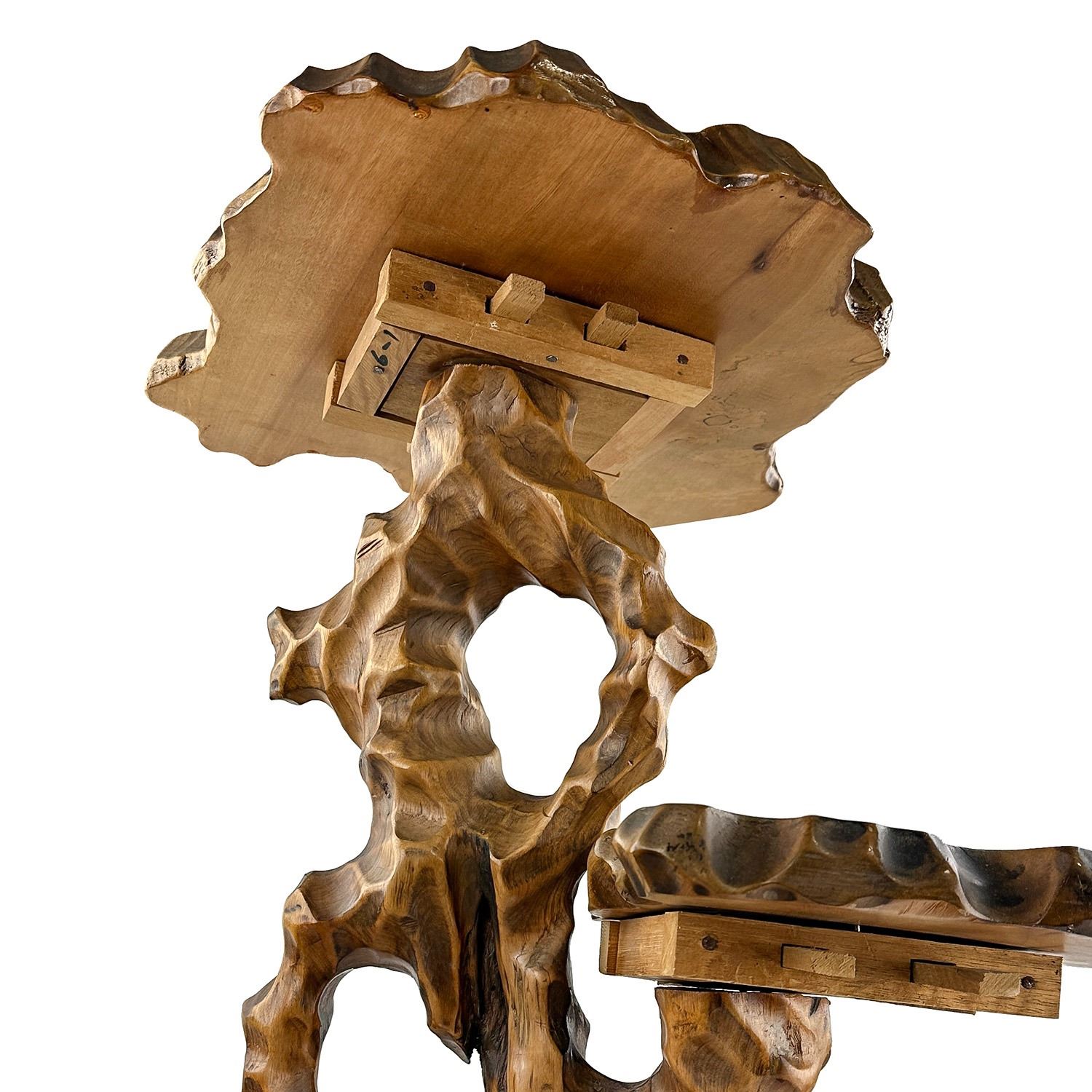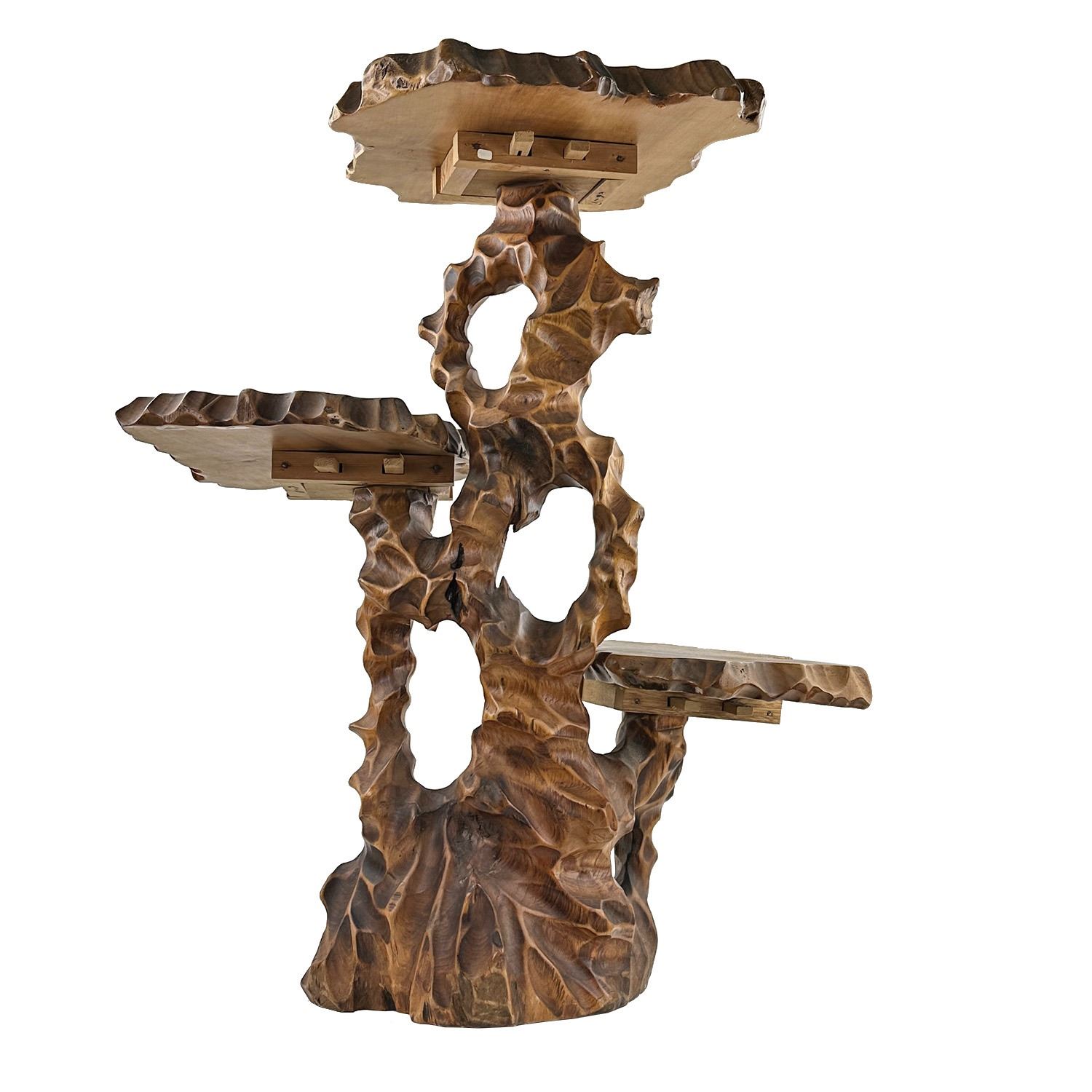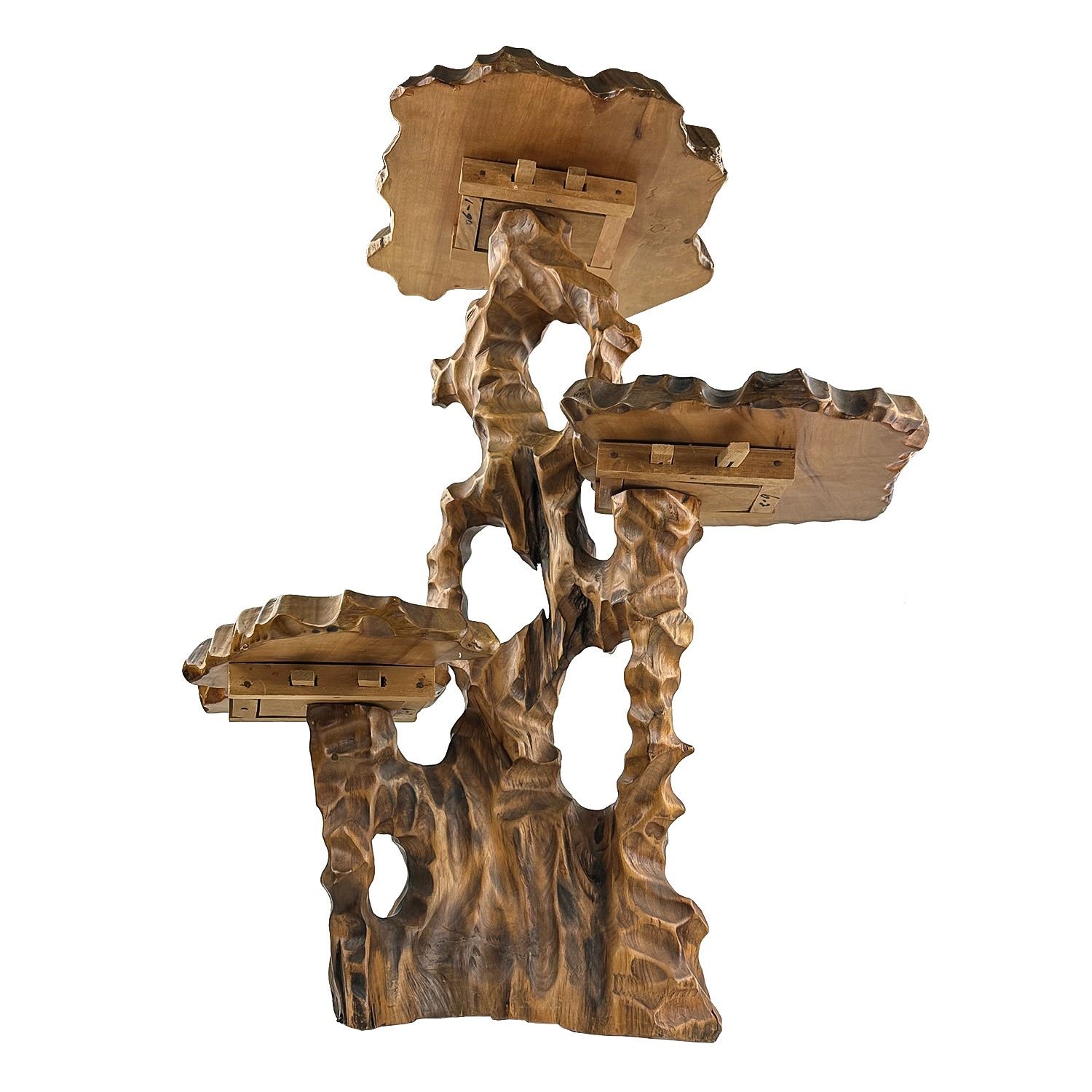 #8003 - ONE-OF-A-KIND SOLID WOOD TABLE OR PLANT STAND SCULPTURE. A VERY UNIQUELY CARVED, MID CENTURY BRUTALIST STYLE 3-TIER CARVED WOODEN TABLE. MAIN STAND PORTION IS ALL ONE PIECE OF WOOD, WITH THE 3 TABLE TOPS BEING ATTACHED WITH WOODEN PEG PINS. HOME OR OFFICE DECOR TABLE SCULPTURE FOR YOUR FLOWER VASES, PLANTS, BONSAI OR TRINKET FIGURINES. MEASURES: 31” (79 CM) HIGH BY 26” (66 CM) WIDEST WIDTH AND 17” (43 CM) DEEP. THE TABLES MEASURE ROUGHLY - TOP: 15” (38 CM) BY 14” (36 CM) - MIDDLE: 13” (33 CM) BY 11.5” (29 CM) - BOTTOM: 14” (35.5 CM) BY 9” (23 CM) AND ALL ARE 1.5” (4 CM) THICK