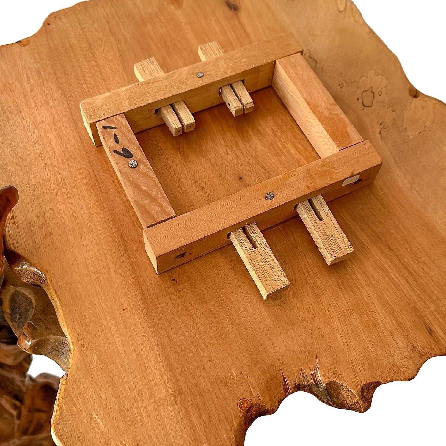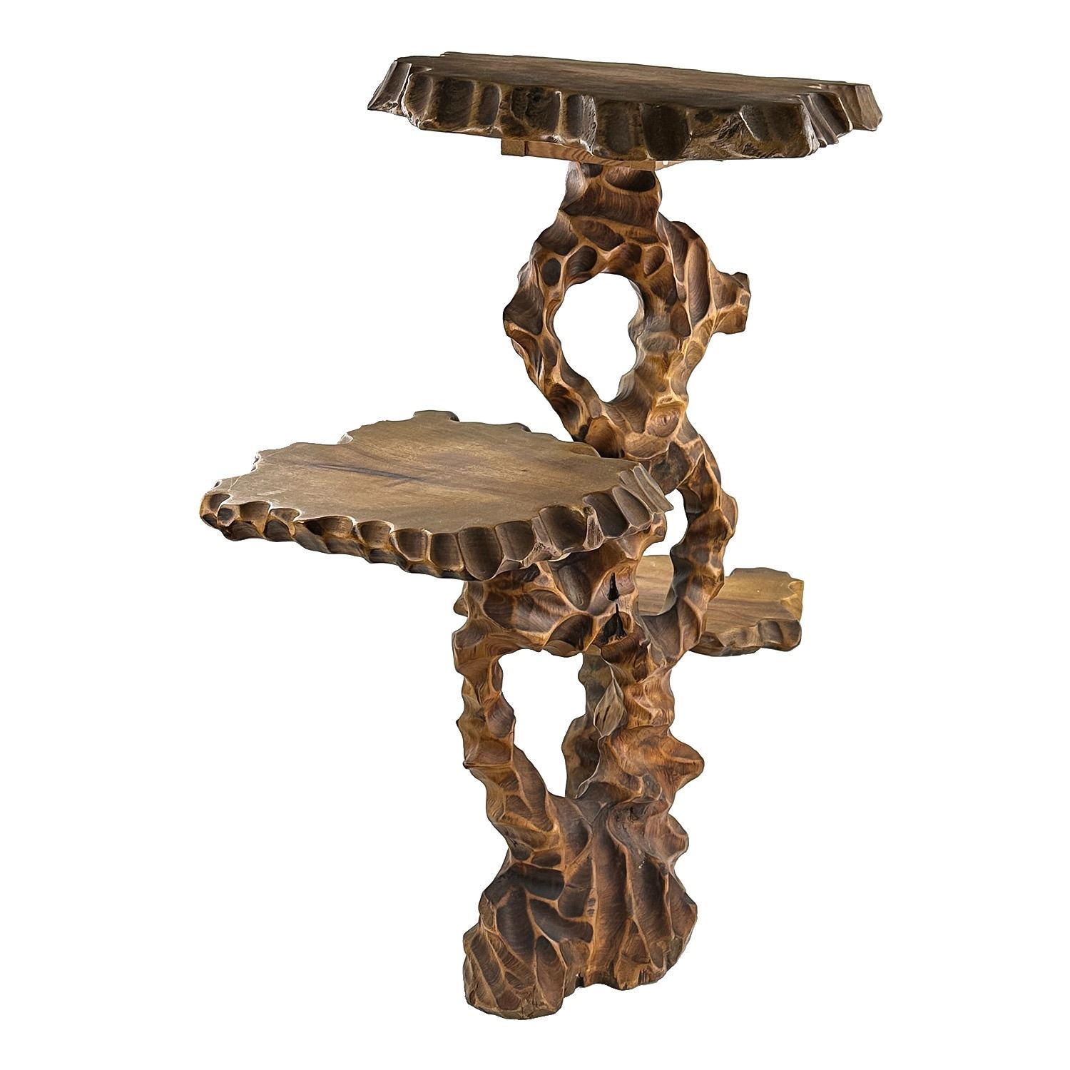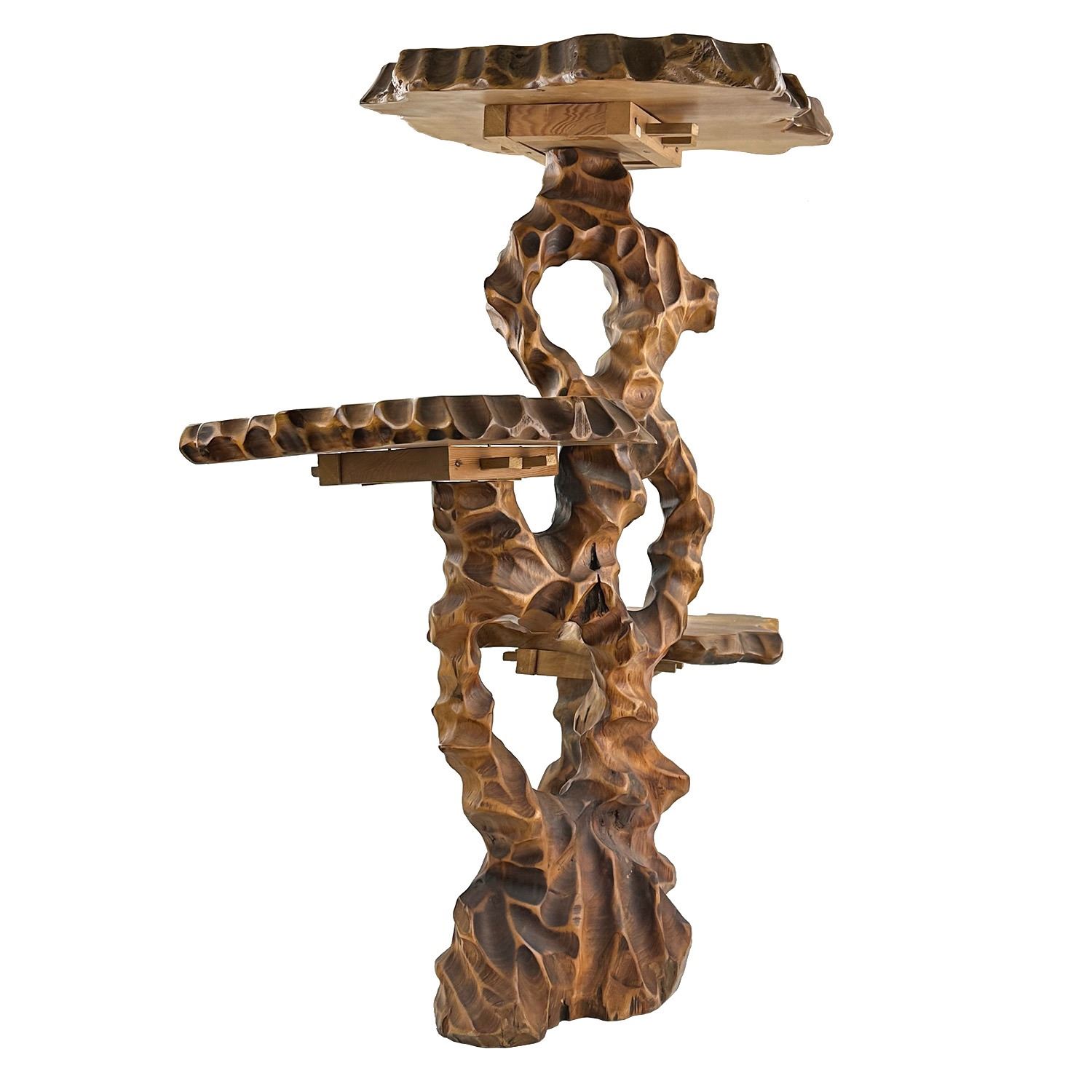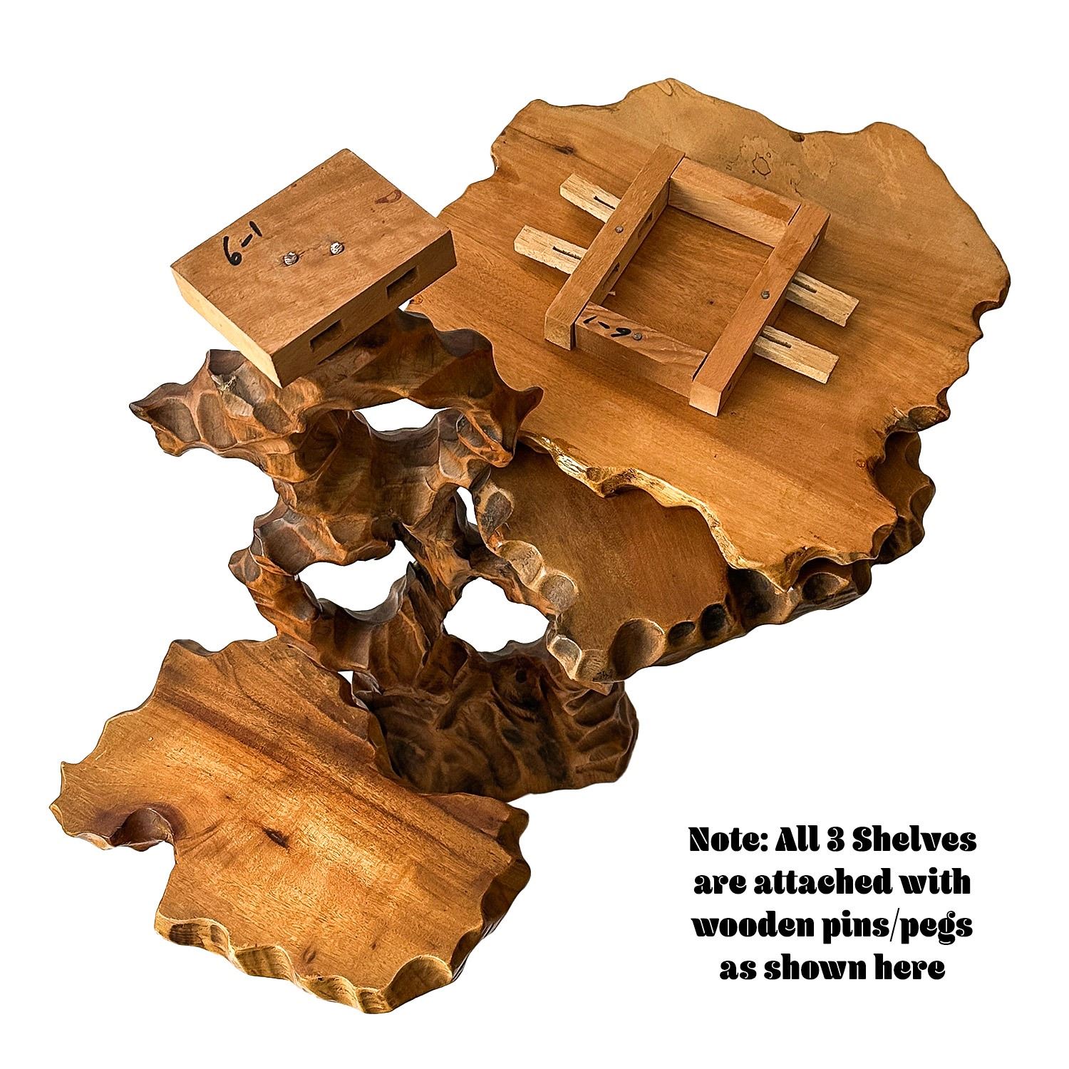 #8003 - ONE-OF-A-KIND SOLID WOOD TABLE OR PLANT STAND SCULPTURE. A VERY UNIQUELY CARVED, MID CENTURY BRUTALIST STYLE 3-TIER CARVED WOODEN TABLE. MAIN STAND PORTION IS ALL ONE PIECE OF WOOD, WITH THE 3 TABLE TOPS BEING ATTACHED WITH WOODEN PEG PINS. HOME OR OFFICE DECOR TABLE SCULPTURE FOR YOUR FLOWER VASES, PLANTS, BONSAI OR TRINKET FIGURINES. MEASURES: 31” (79 CM) HIGH BY 26” (66 CM) WIDEST WIDTH AND 17” (43 CM) DEEP. THE TABLES MEASURE ROUGHLY - TOP: 15” (38 CM) BY 14” (36 CM) - MIDDLE: 13” (33 CM) BY 11.5” (29 CM) - BOTTOM: 14” (35.5 CM) BY 9” (23 CM) AND ALL ARE 1.5” (4 CM) THICK