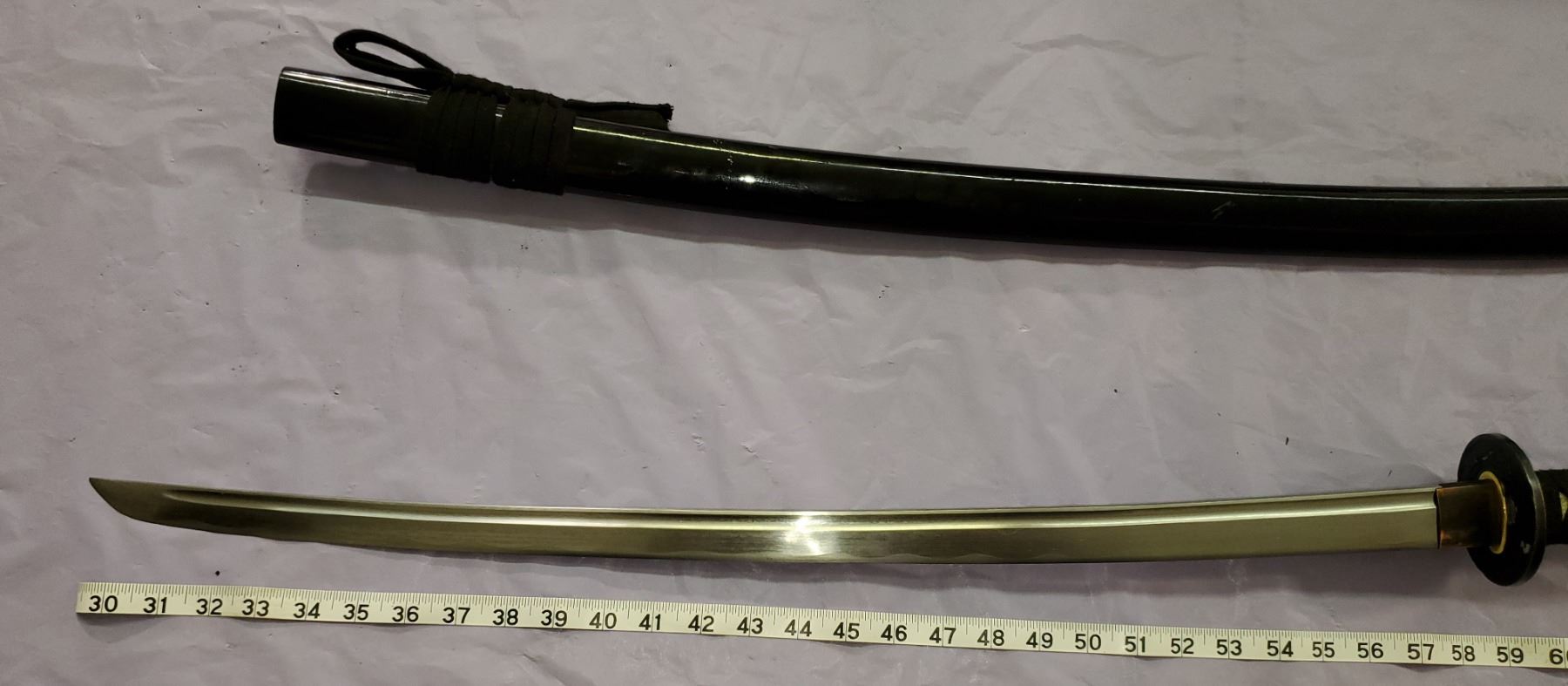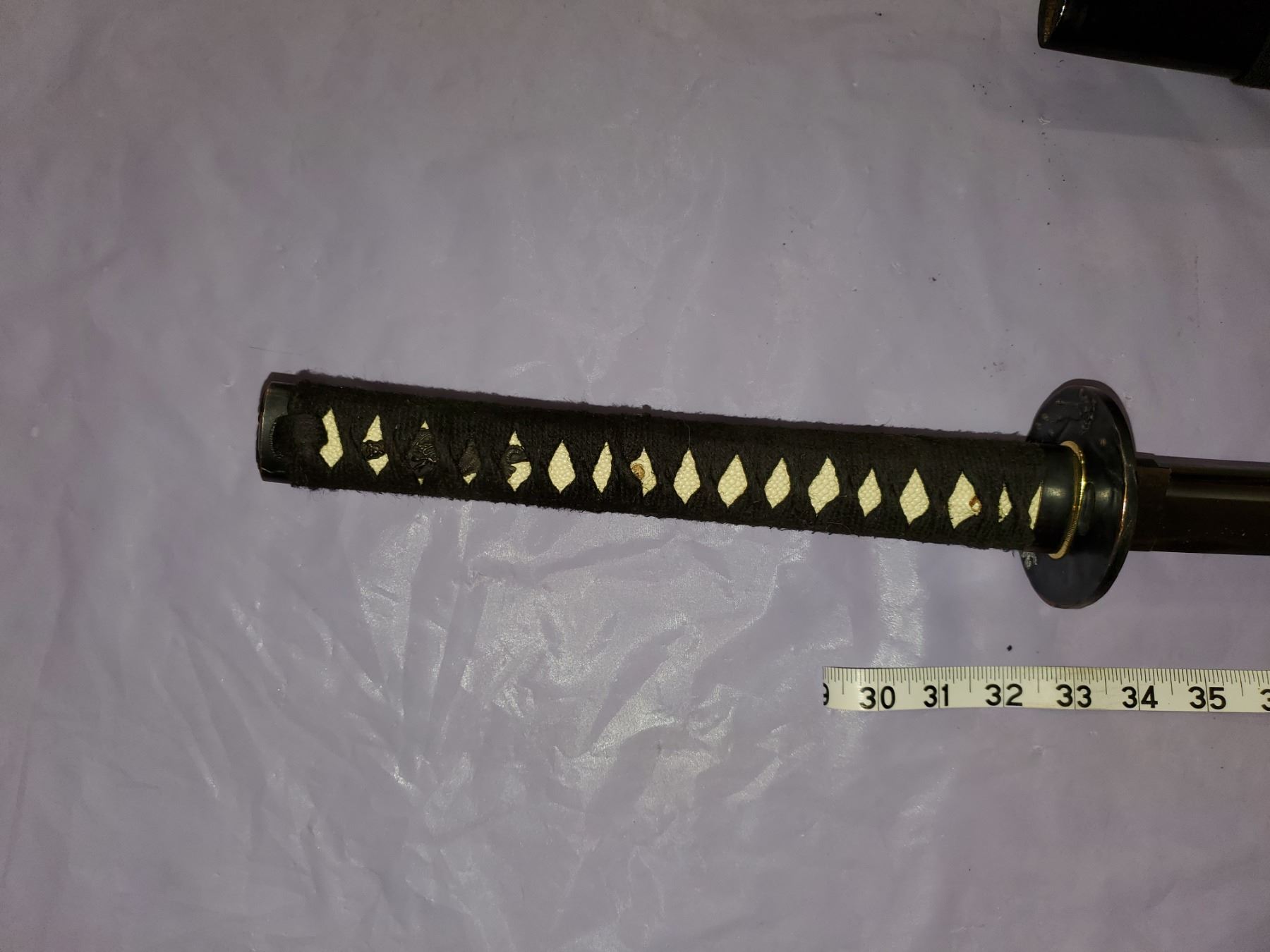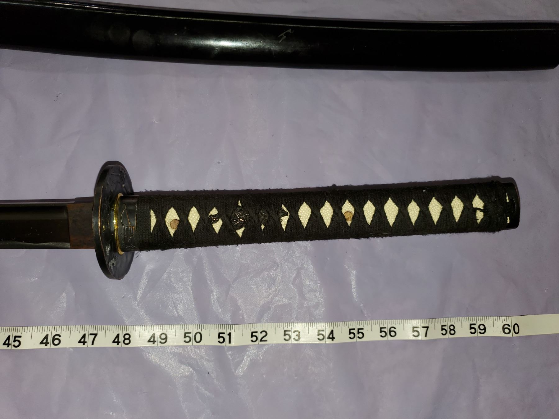 HAND POUNDED, FORGED, FOLDED RESULTING IN LAMINATED STEEL COMBO OF STRENGTH AND FLEXIBILITY. A STUNNER. BLADE 27" BLOOD LETTING GROOVE LENGTH OF BLADE- BLADES BACK THICKNESS AT HILT 1/4" MADE BY MASTER SWORDMAKER