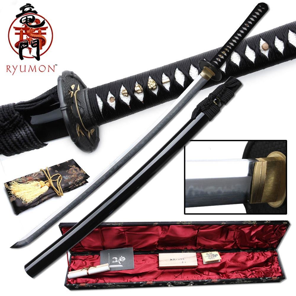 HAND FORGED RYUMON SAMURAI SWORD W/ CLAY TEMPERED 1095 **|**|** HAND FORGED RYUMON SAMURAI SWORD W/ CLAY TEMPERED 1095 HIGH CARBON STEEL BLADE AUTHENTIC TOP GRADE RAY SKIN WRAPPED HANDLE