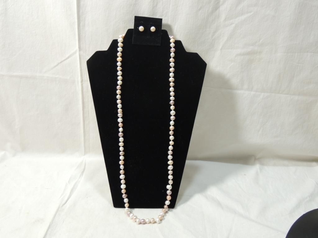 FRESHWATER PEARLS. HAND KNOTTED STRAND. STUDDED EARRINGS WITH NECKLACE. LIGHT PEACH CREAM PINK COLORS. AS SHOWN. SEE PHOTO FOR MORE DETAILS.